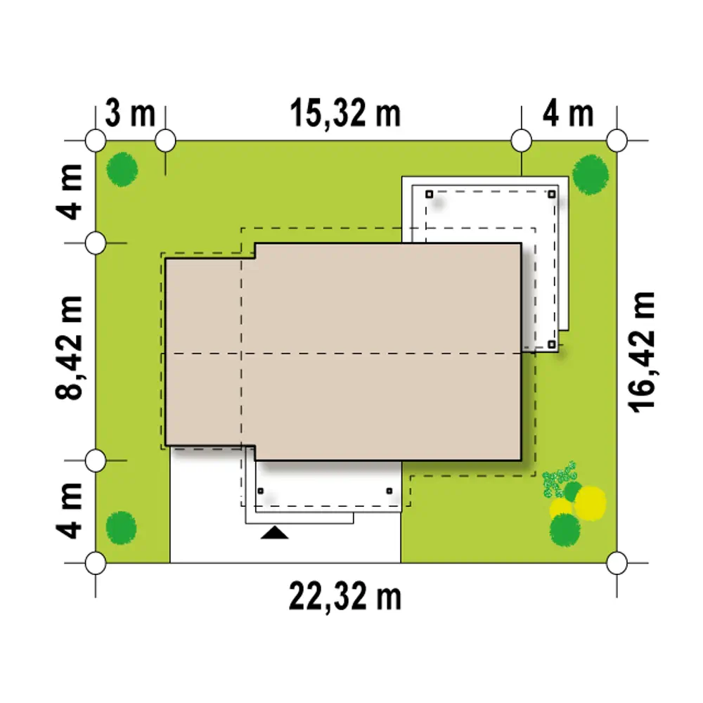 Niewątpliwą zaletą tego projektu jest obszerny, jasny salon wraz z jadalnią. Centralnie umiejscowiony bio-kominek sprawia, że z każdego miejsca możemy się cieszyć jego widokiem. Kuchnia ma do dyspozycji własną spiżarnię. Wygodny hol z miejscem na szafę jest łącznikiem pomiędzy poszczególnymi pomieszczeniami. Znajdują się tu dwa przestronne pokoje oraz łazienka z miejscem na wannę. Z sieni, w której wydzielono miejsce na szafe, jest możliwość bezpośredniego przejścia do garażu. Na jego tyłach zlokalizowane zostało funkcjonalne pomieszczenie gospodarcze.