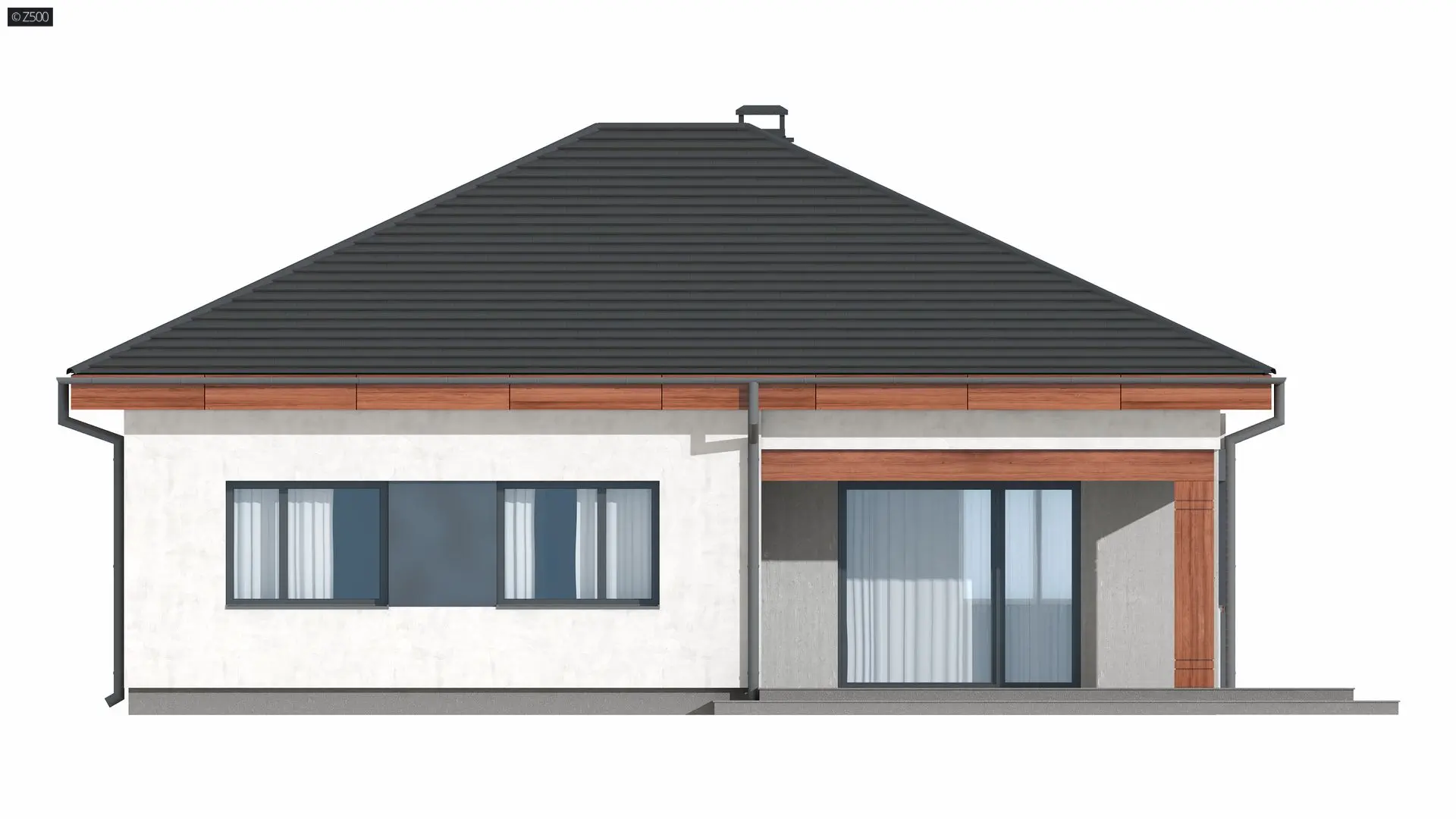 Do domu wchodzimy z podcienia wejściowego. W sieni zaplanowano miejsce na pojemną szafę. Dalej możemy dostać się na lewo do części reprezentacyjnej lub na prawo do strefy prywatnej domowników. Część dzienna to komfortowy salon z jadalnią, centralnie umieszczonym kominkiem, dużymi przeszkleniami oraz wyjściem na zadaszony taras. Całość dopełnia ustawna, wygodna kuchnia. W drugiej części domu zaprojektowano trzy podobnej wielkości pokoje. Dwie łazienki podniosą komfort użytkowania. Duża z oknem, mniejszą w razie potrzeby można zamienić na garderobę, spiżarnię czy podręczny schowek.