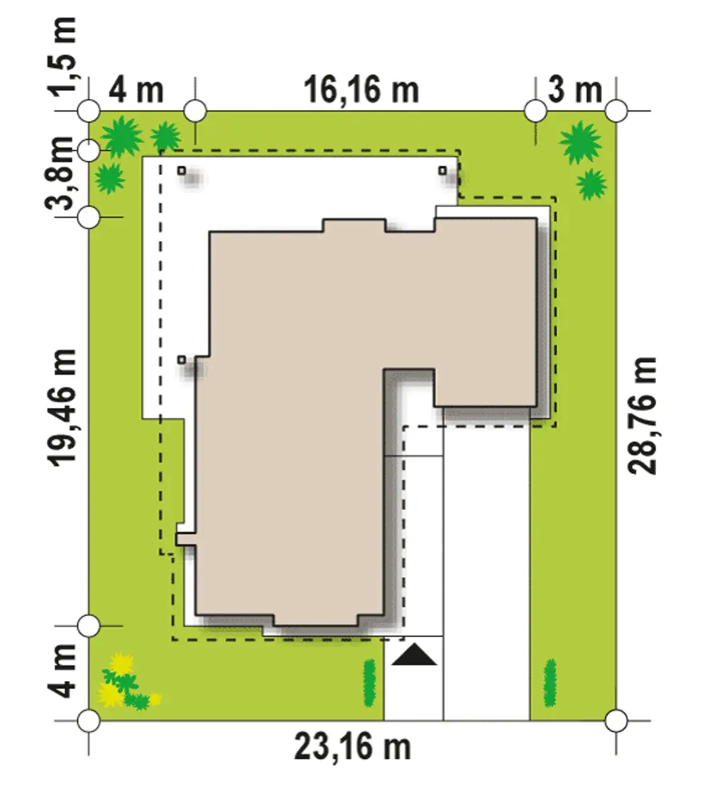Wejście do domu zostało umieszczone w głębi budynku. Zadaszenie wnęki pozwala na spokojne znalezienie kluczy do domu w trakcie deszczu. Również z tego miejsca możemy obserwować kto zmierza do naszych drzwi z wizytą.