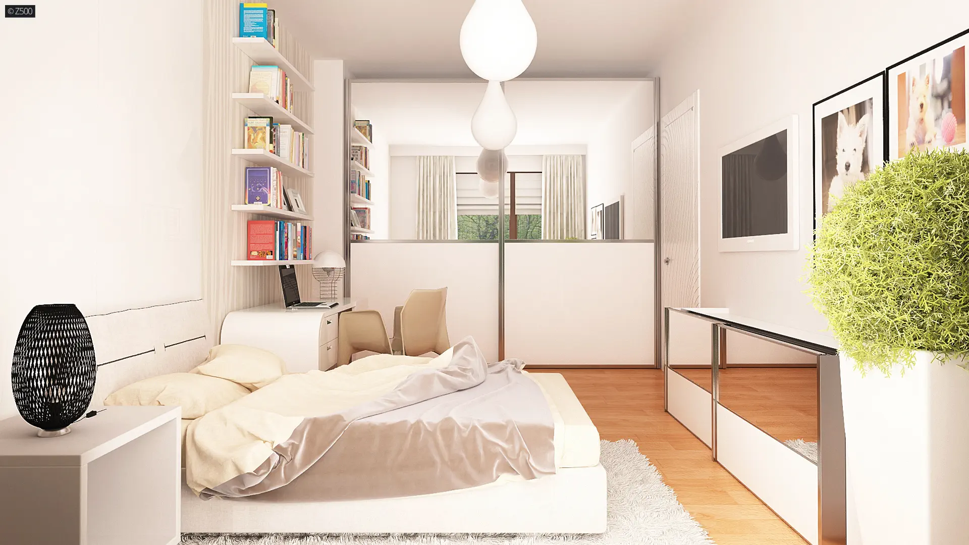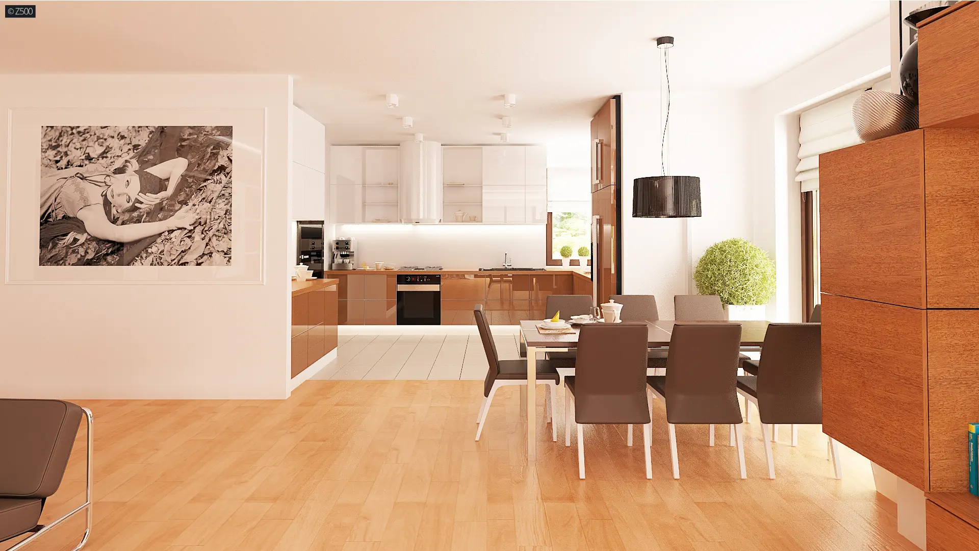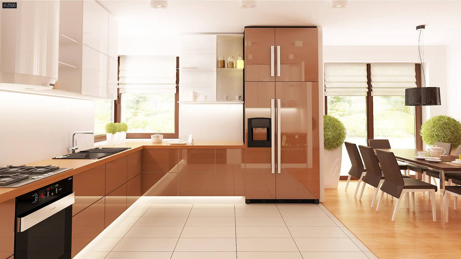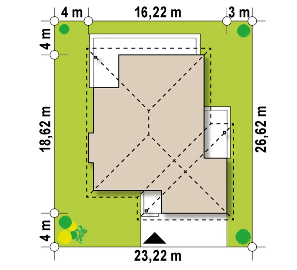 Dom został podzielony na strefy. W lewej części zaprojektowano część dzienną z przestronnym salonem, który połączony jest z kuchnią oraz jadalnią, spiżarnię, wc oraz sień. Od frontu zlokalizowano dwustanowiskowy garaż z pomieszczeniem gospodarczym. Strefa prywatna znajduje się w prawej części budynku. Umieszczono tu korytarz, który jest łącznikiem pomiędzy trzema, dużymi sypialniami i łazienką.