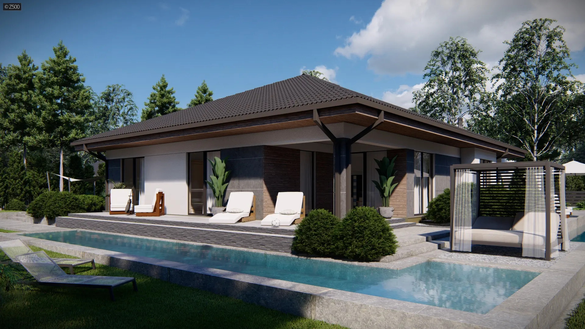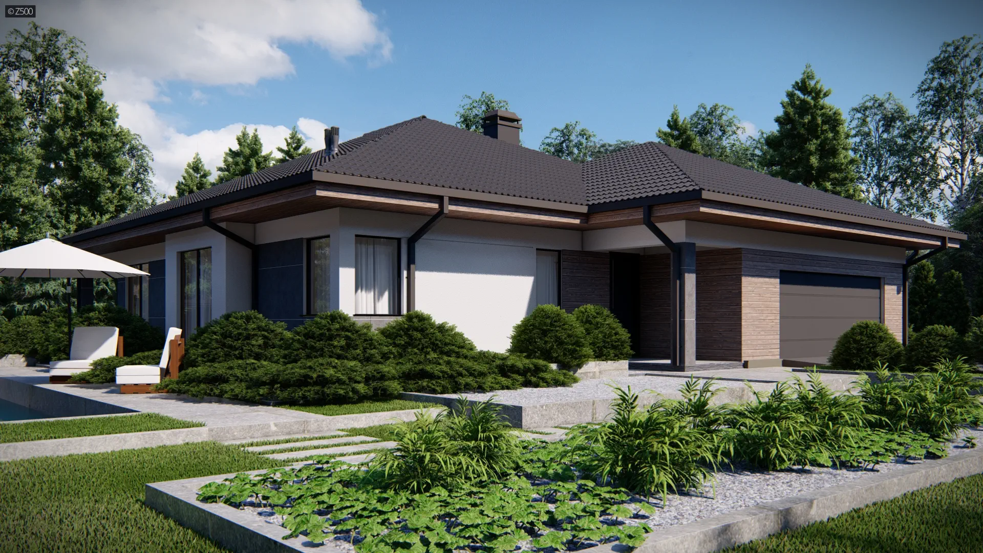 Z281 D to projekt domu funkcjonalnego o programie użytkowym rozwiązanym w obrębie parteru. Spokojna kolorystyka zapewniona przez okładziny z jasnego drewna nadaje mu wyjątkowego charakteru.