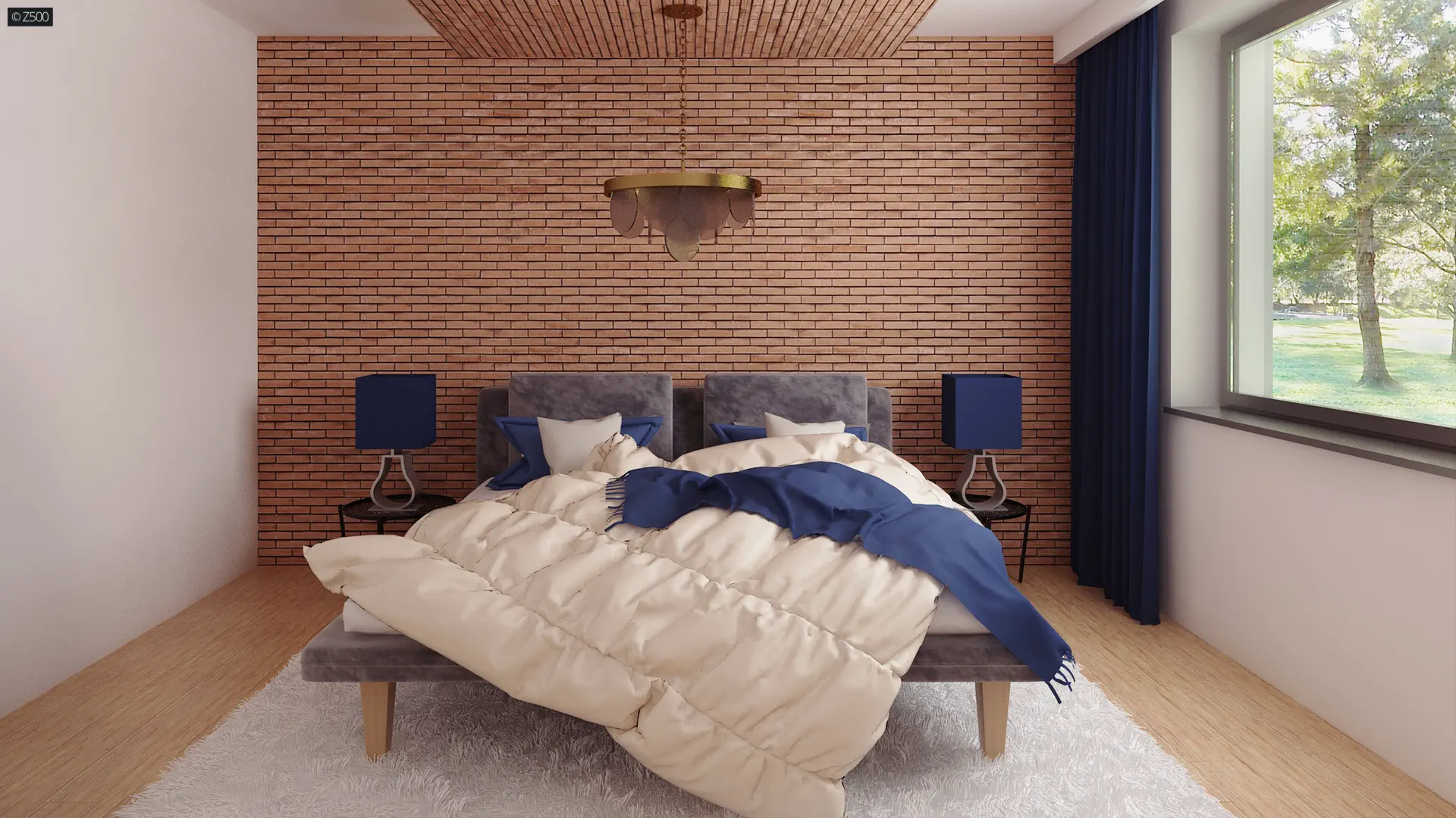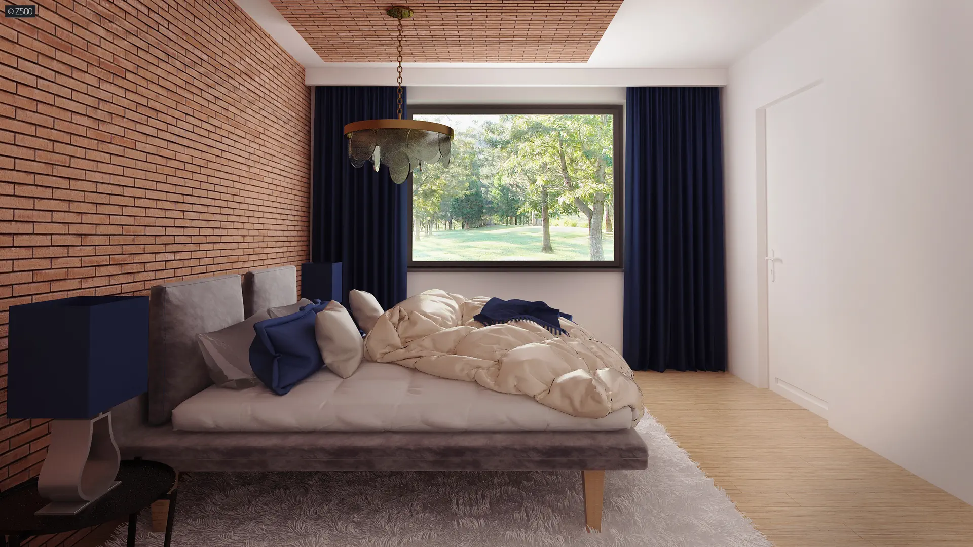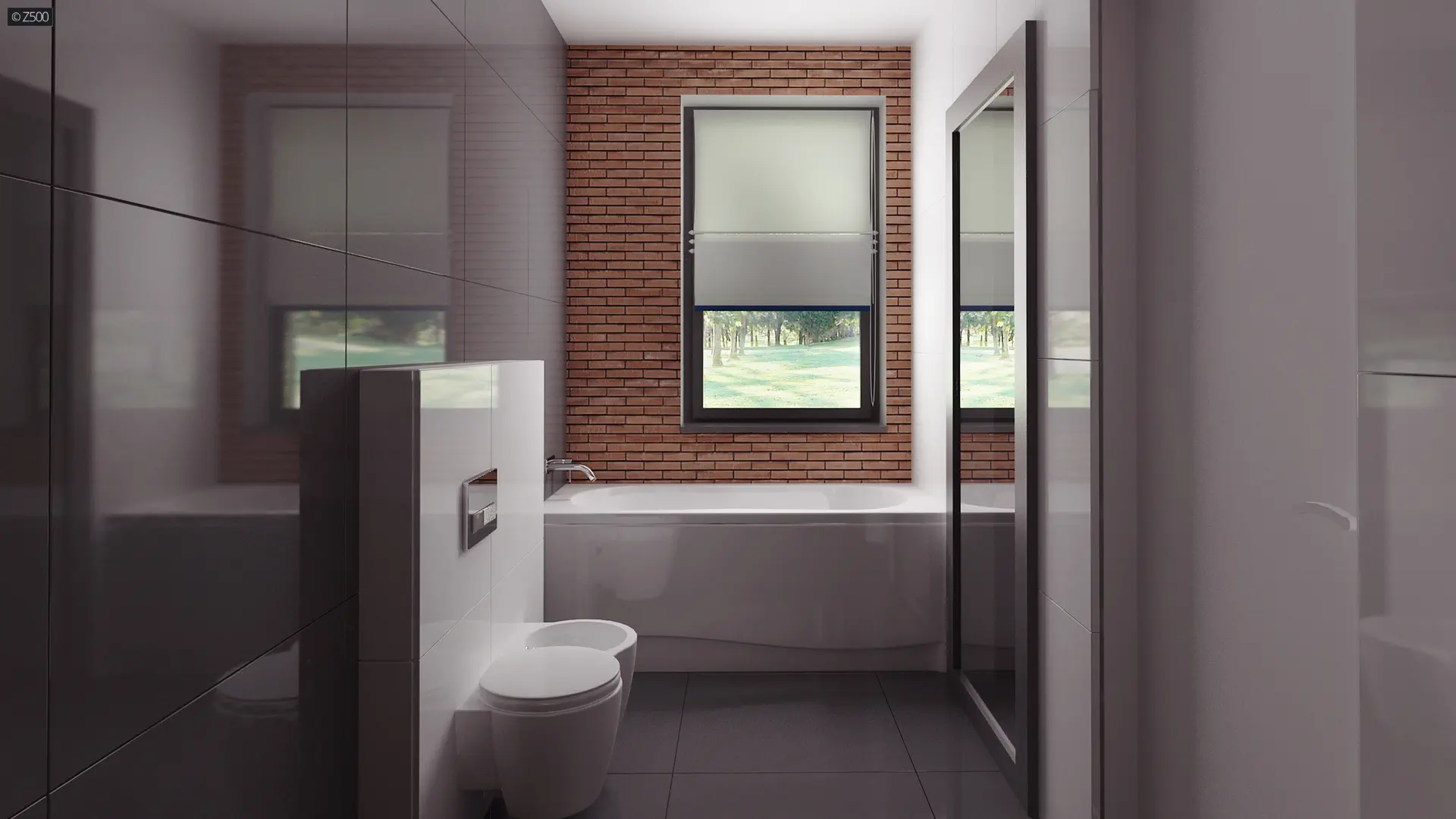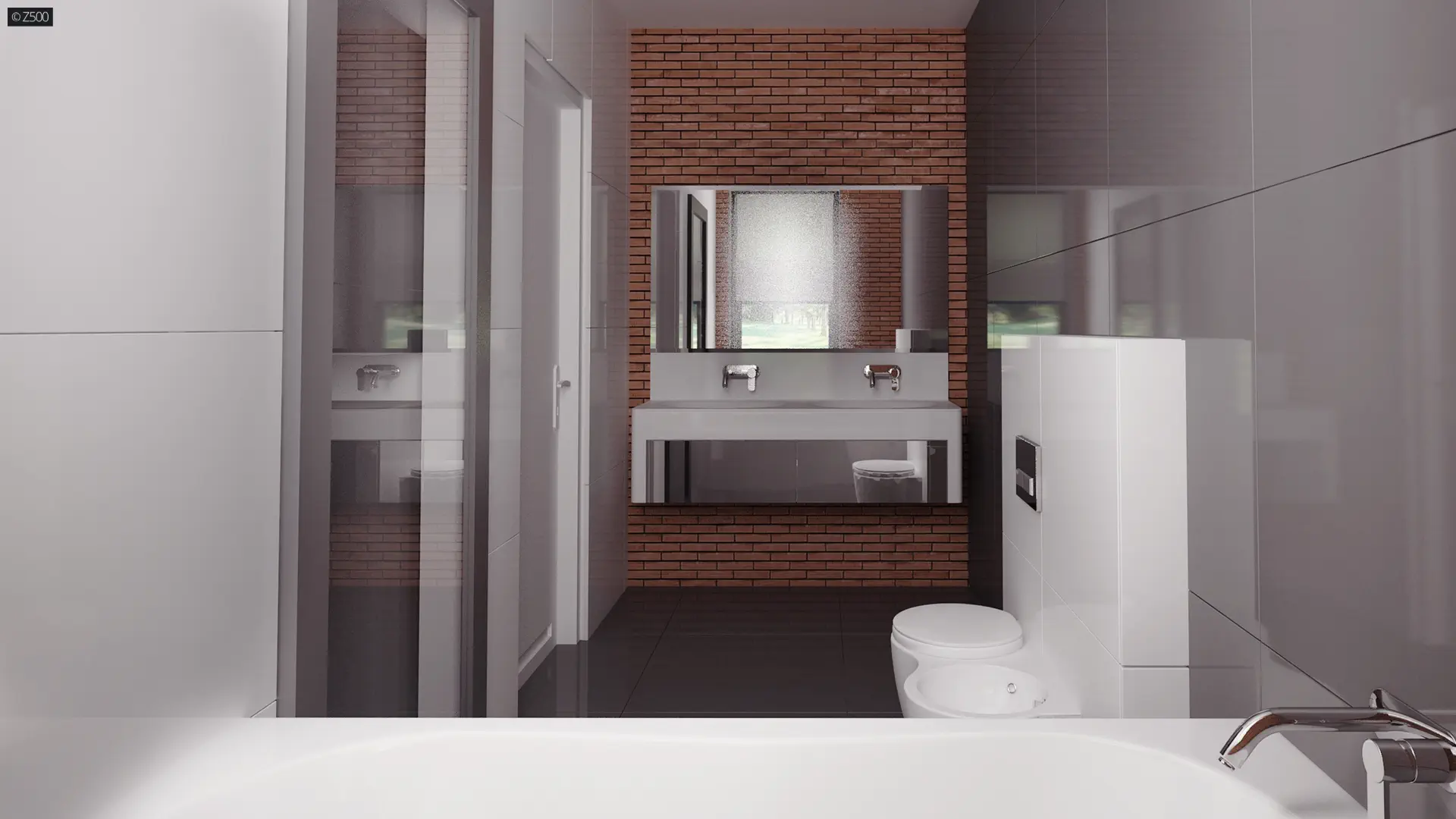 Przy wejściu zaprojektowano niewielką garderobę i wc, a hol prowadzi do trzeciej bryły – nocnej części domu. Mieszczą się tam 3 sypialnie, z których dwie mają wyjście na taras, a trzecia, w ramach rewanżu – swoją prywatną łazienkę i garderobę. Niewielka pralnia została umieszczona w łazience za zamkniętymi drzwiami aby nie psuć wystroju pokoju kąpielowego.