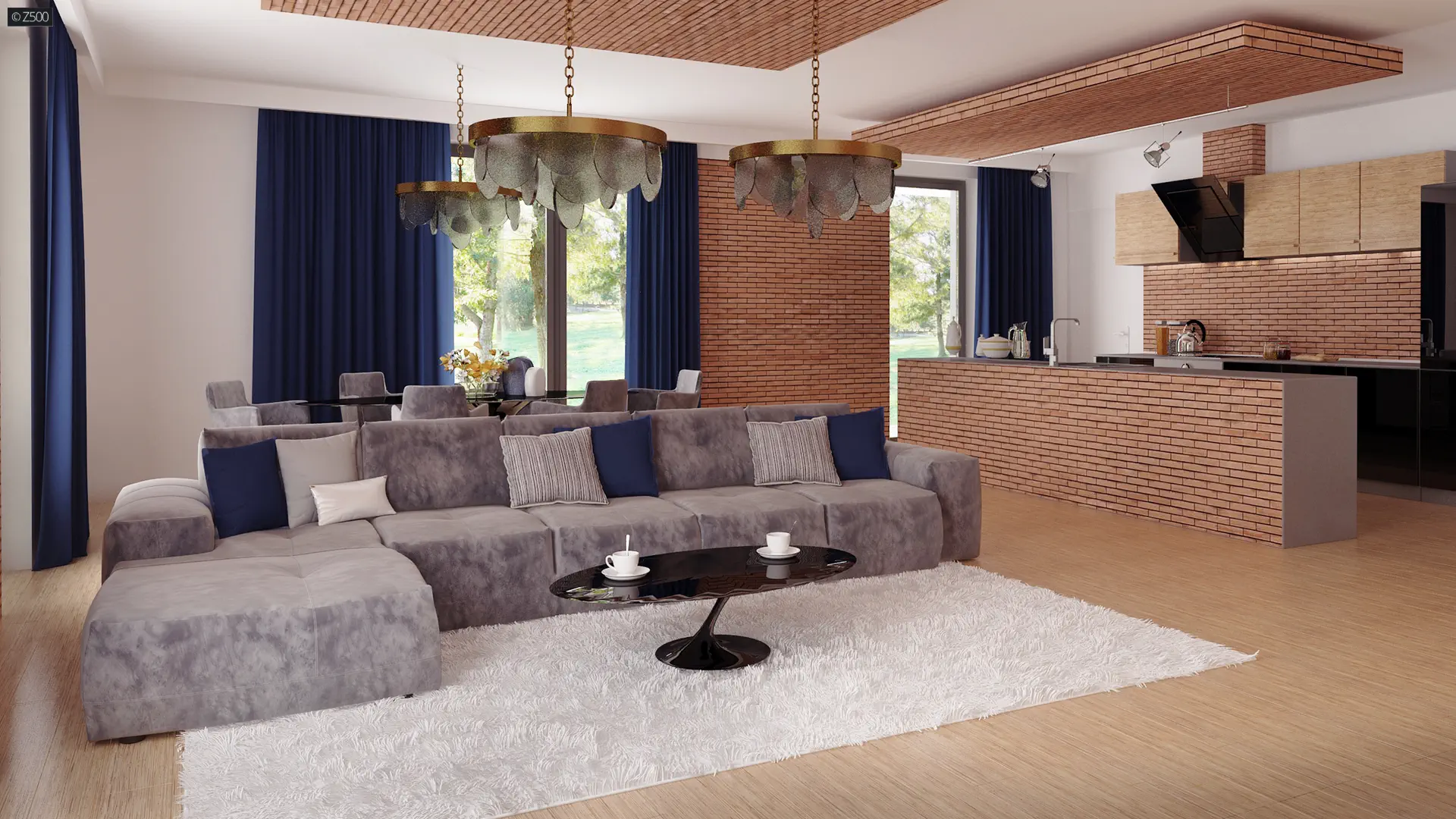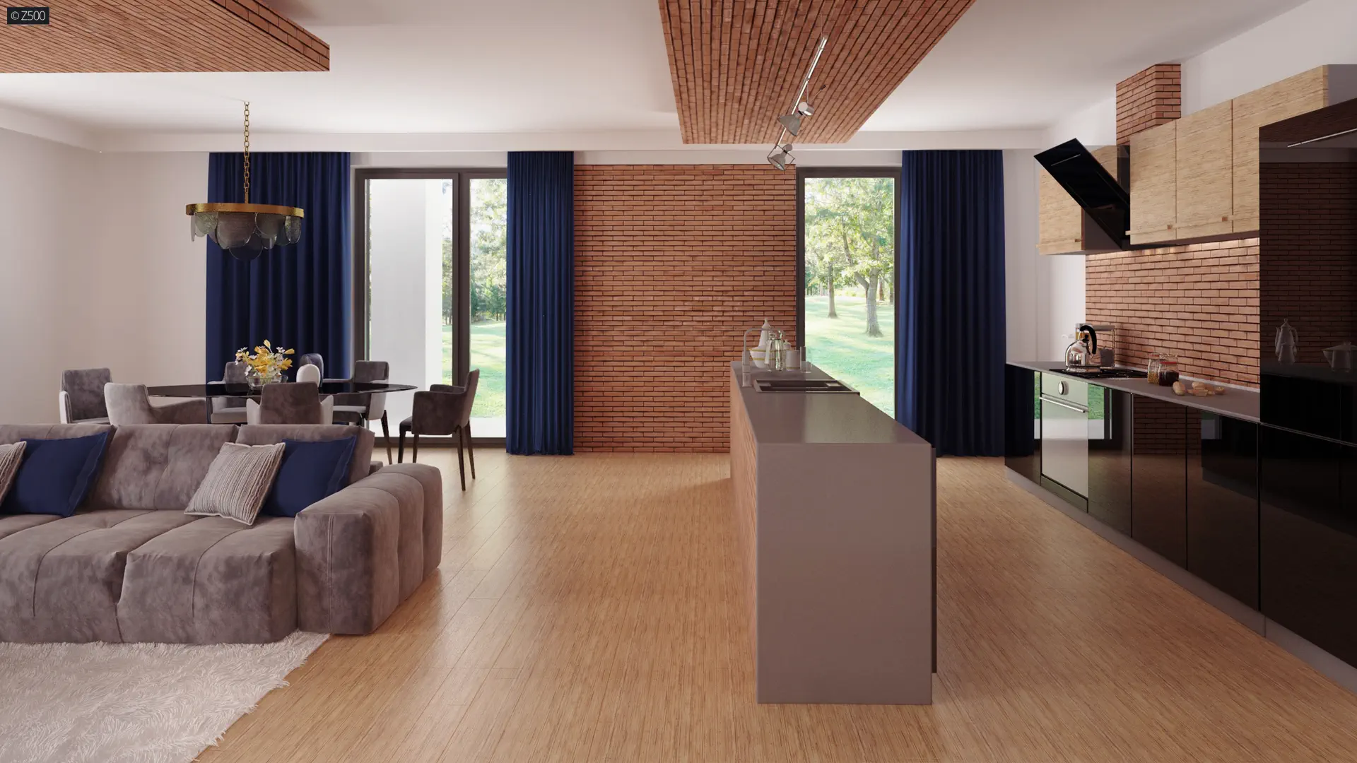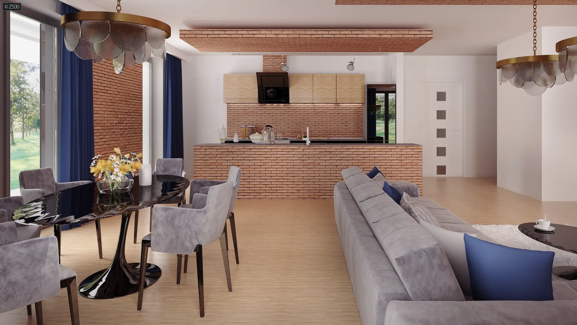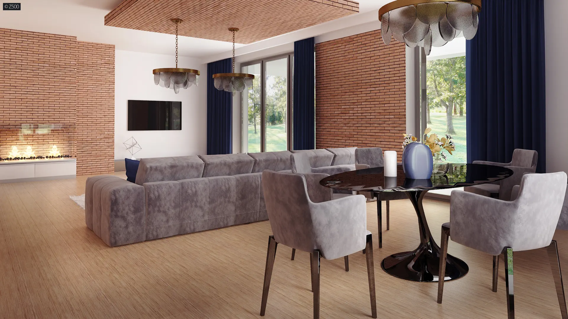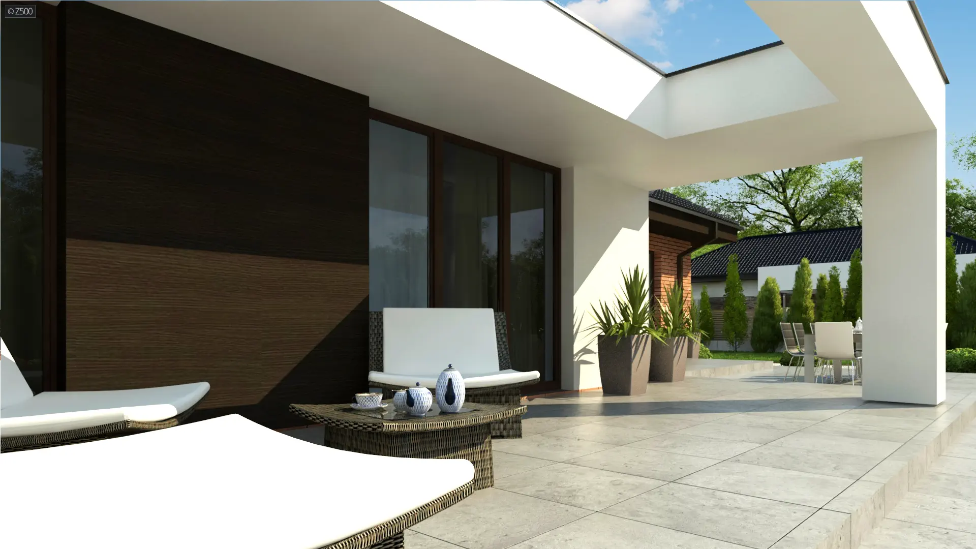 Druga bryła – centralna, to dzienna strefa odpowiednio przystosowana do podejmowania gości. Obok salonu połączonego z jadalnią mieści się aneks z wyspą kuchenną i spiżarnią, które doceni każda pani domu. Przeszklenia do samej ziemi jednocześnie są wyjściami na taras, którego zadaszenie od strony ogrodu wykonano z nowoczesnych, gotowych pergoli.