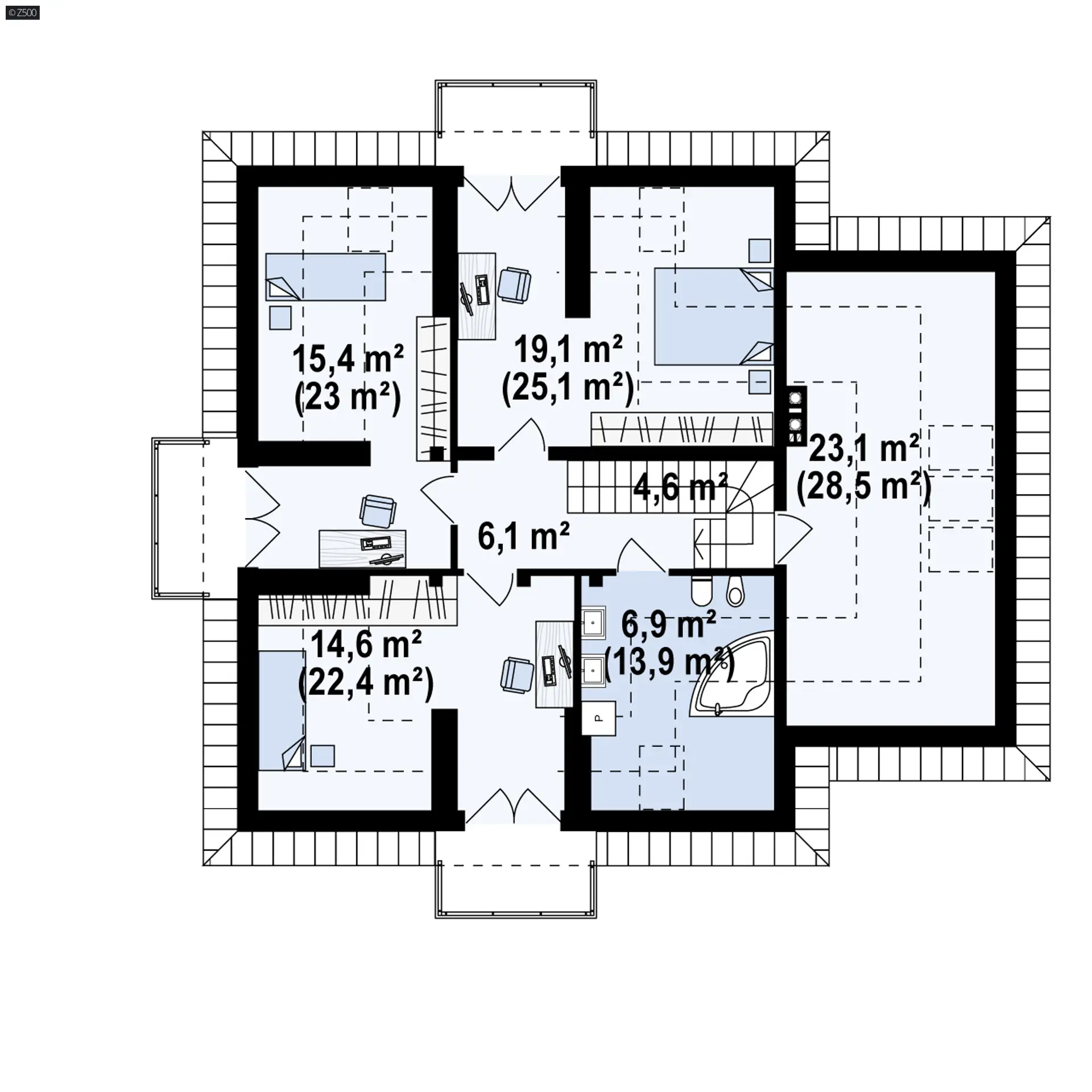 Z283 to wygodny dom w tradycyjnym stylu z garażem jednostanowiskowym. Zgrabną bryłę urozmaicają lukarny z balkonami oraz taras w podcięciu od strony salonu.