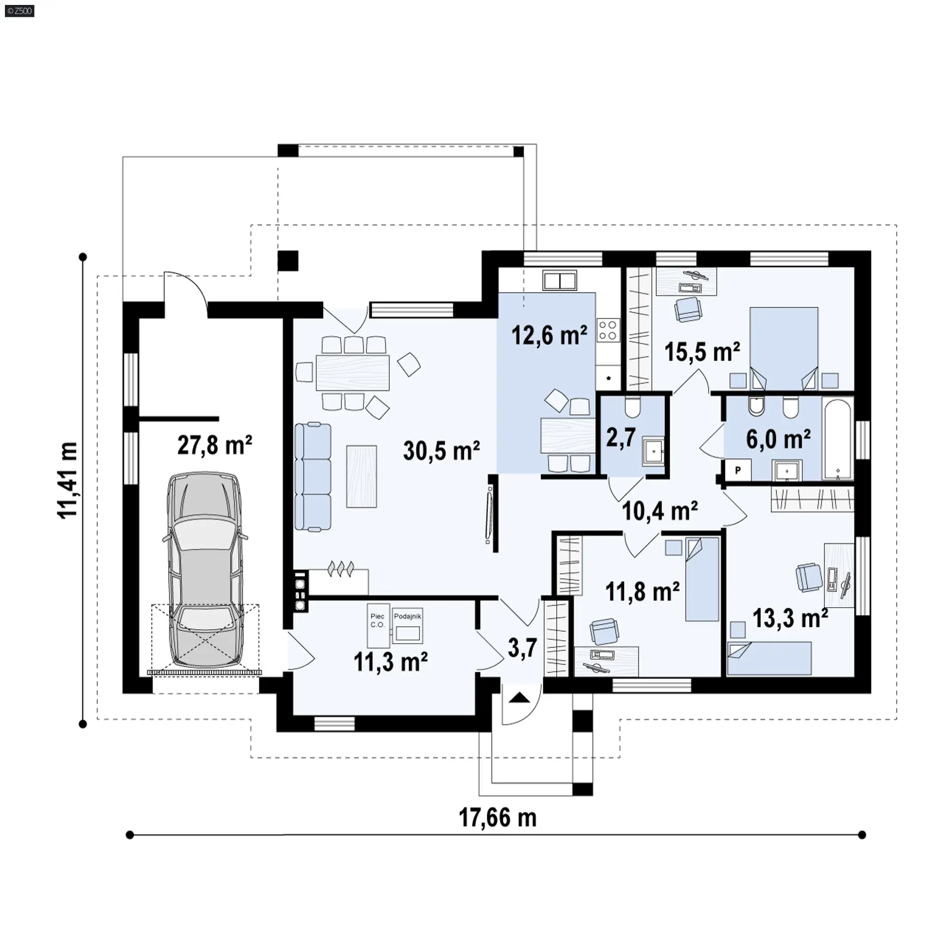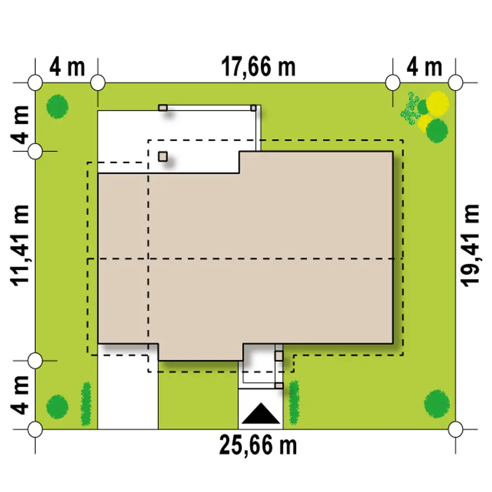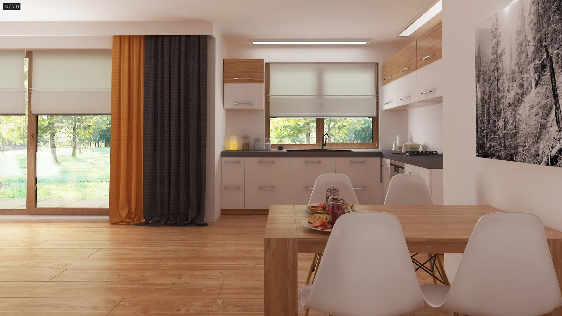 Z287 to zgrabny parterowy dom z garażem jednostanowiskowym i dużą kotłownia na paliwo stałe. Brak wewnętrznych ścian konstrukcyjnych daje wiele możliwości aranżacji i dopasowania wnętrza do indywidualnych potrzeb.
