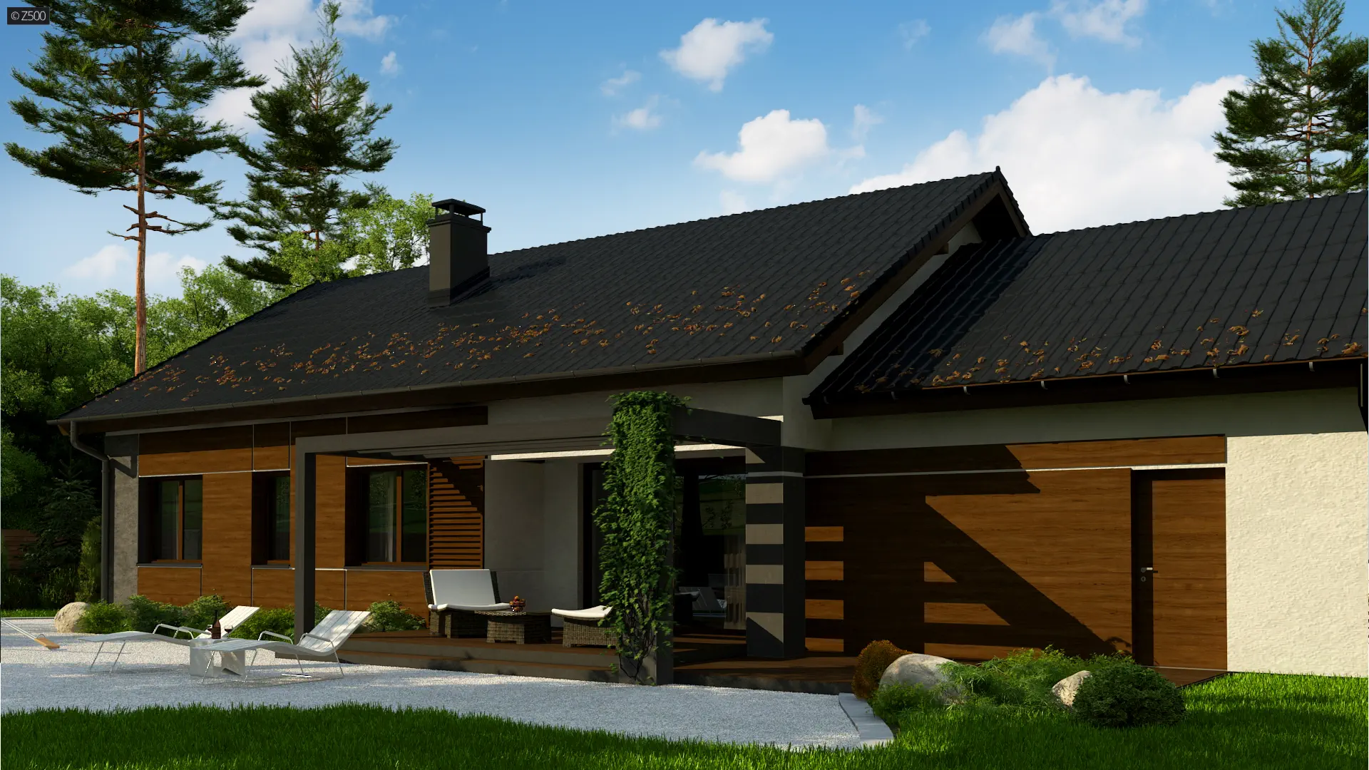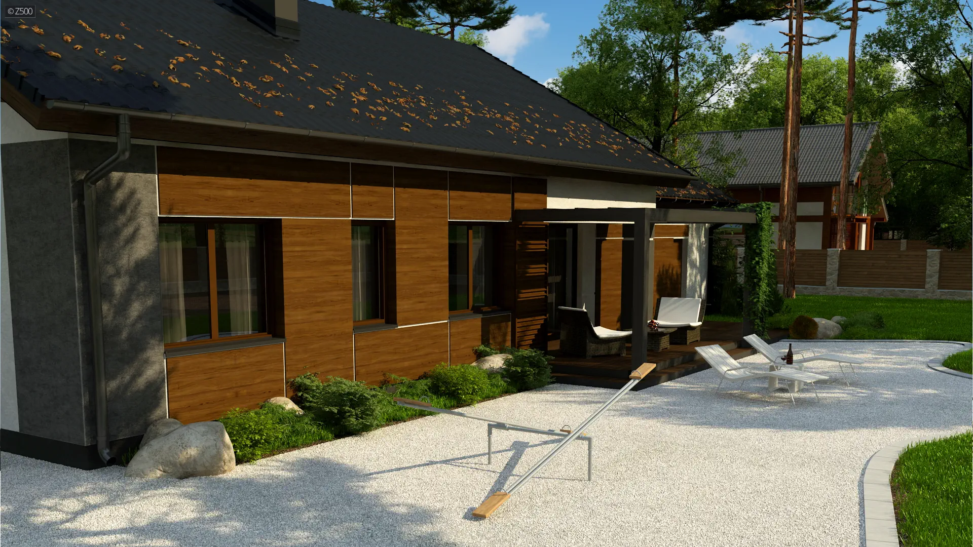 Z287 GL2 to dom parterowy z garażem po lewej stronie. Elewacja budynku została wykonana z białego tynku, okładziny drewnianej/drewnopodobnej oraz szarych paneli elewacyjnych z betonu architektonicznego.