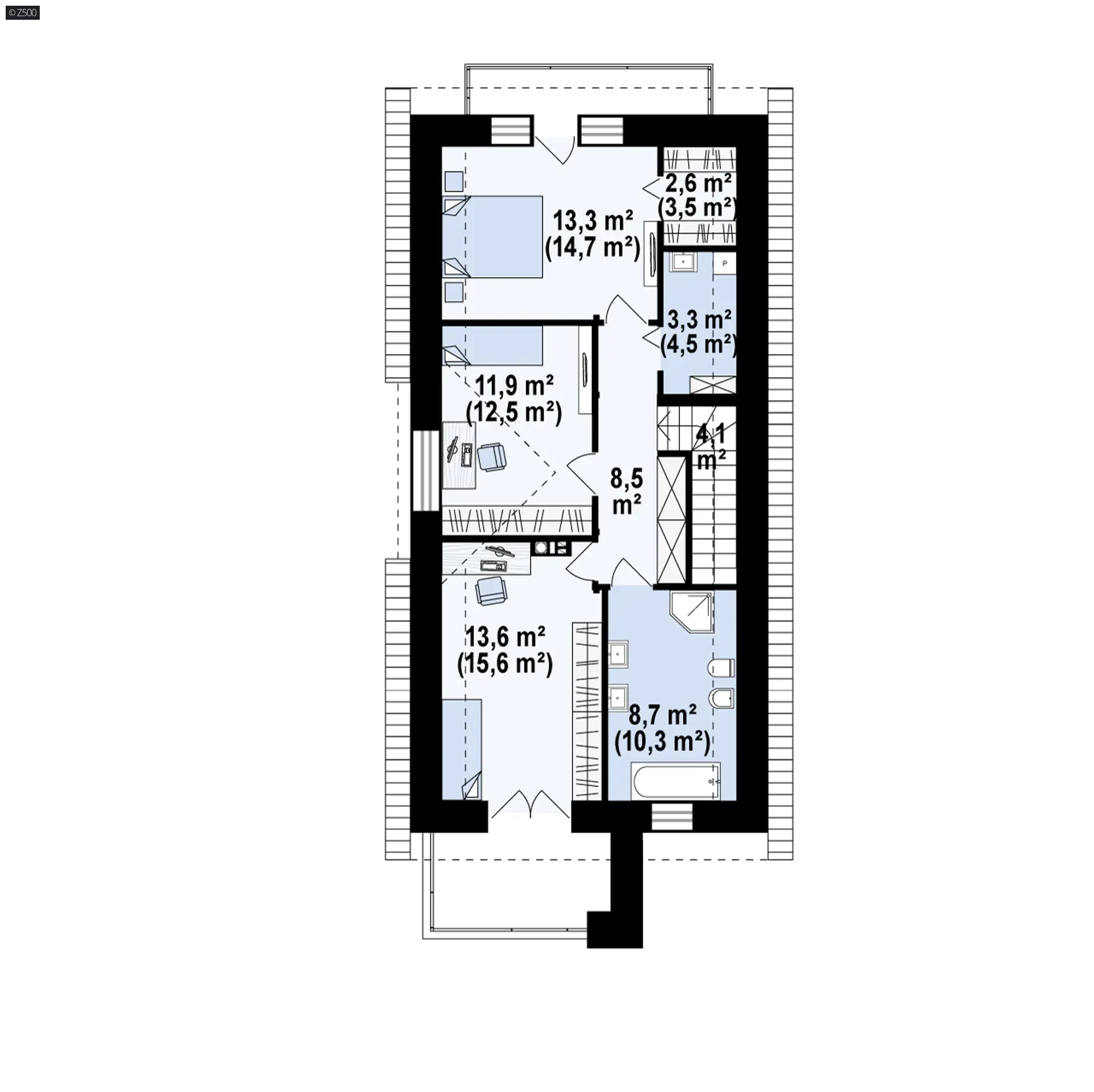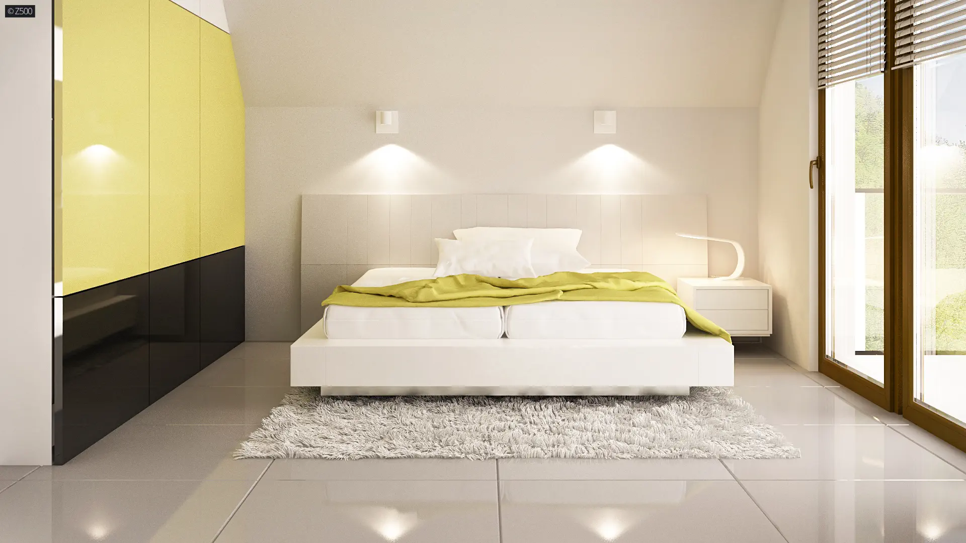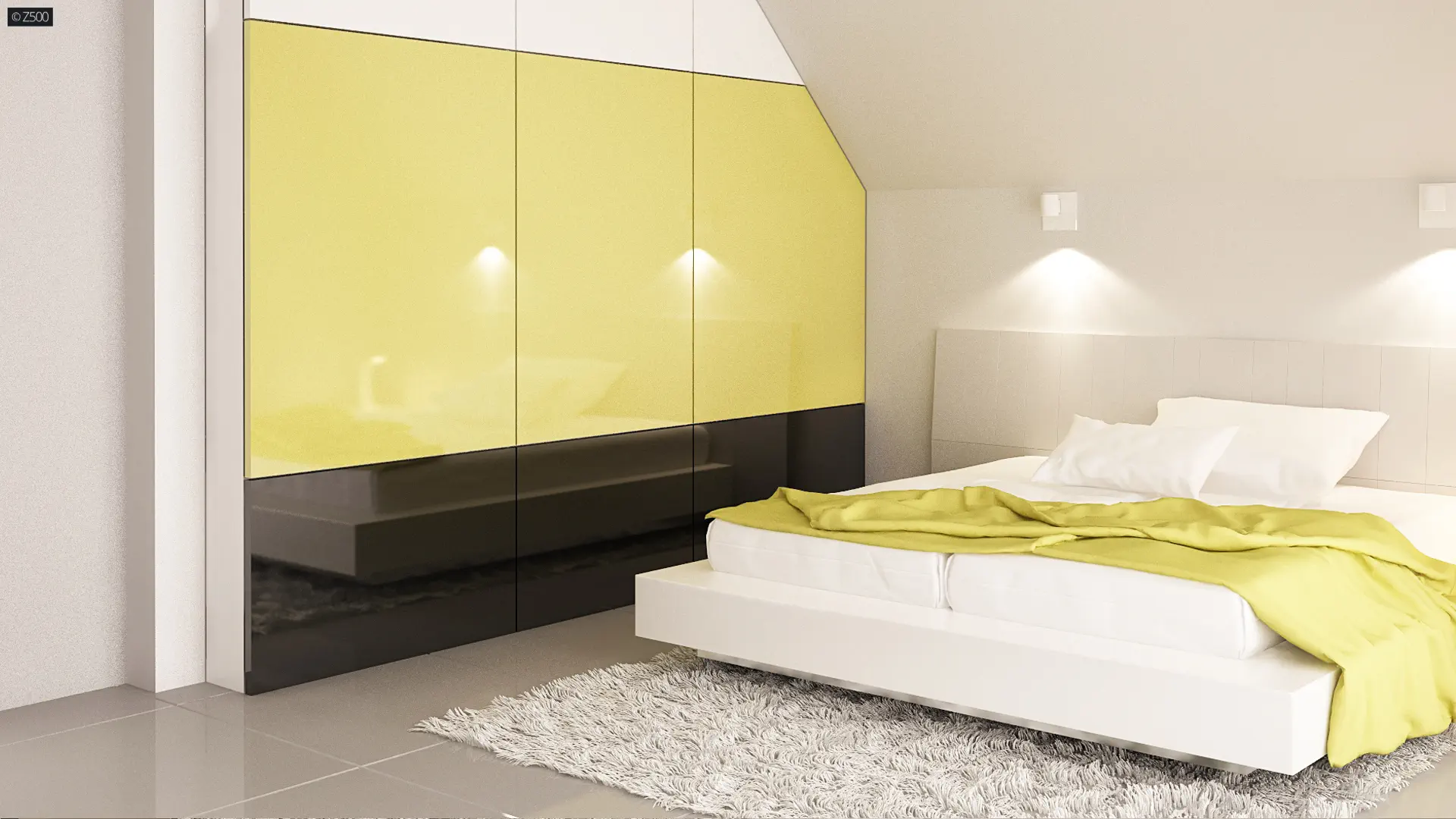 Na parterze znajduje się salon z kuchnią i jadalnią oraz obszerne zaplecze - pom. gosp. za garażem, sień z miejscem na pojemne szafy oraz podręczny schowek pod schodami. Dzięki prostej konstrukcji można niemal dowolnie kreować wielkość pomieszczeń przesuwając jedynie ścianki działowe. Poddasze to strefa nocna z trzema sypialniami oraz komfortową łazienką i wydzieloną pralnią. W holu wygospodarowano miejsce na dodatkowe szafy. Sypialnia rodziców posiada własna garderobą oraz wyjście na balkon. Z pokoju nad garażem można wyjść na taras. Dużą zaletą jest wysoka ścianka kolankowa h=150cm. Dzięki temu poddasze jest funkcjonalne i ustawne.