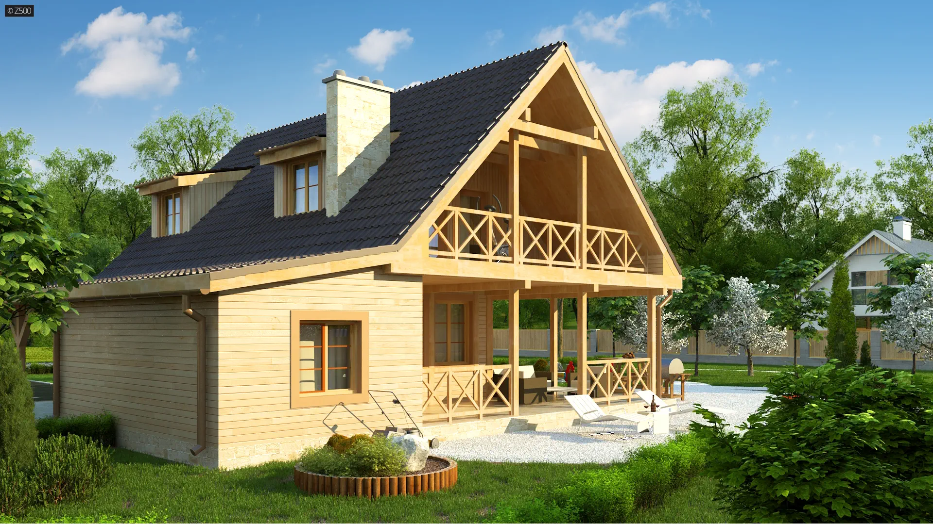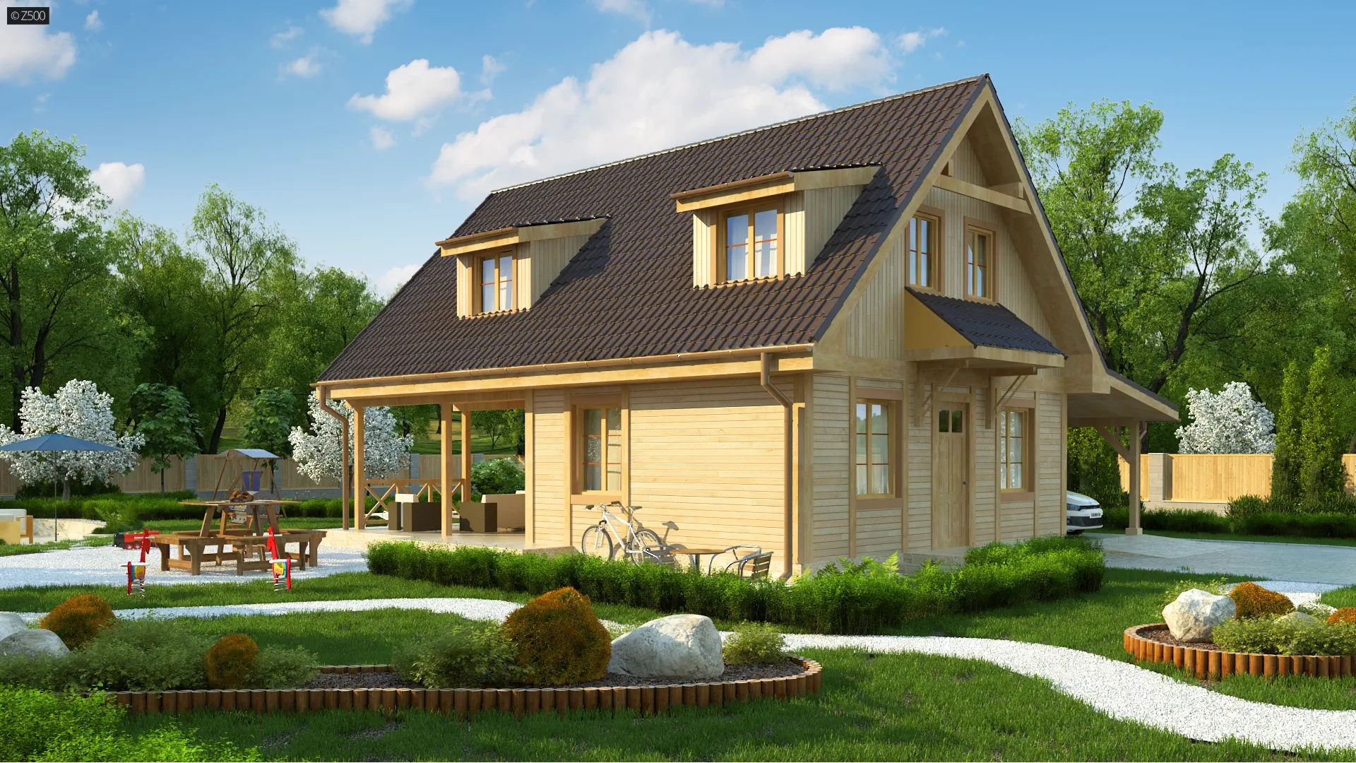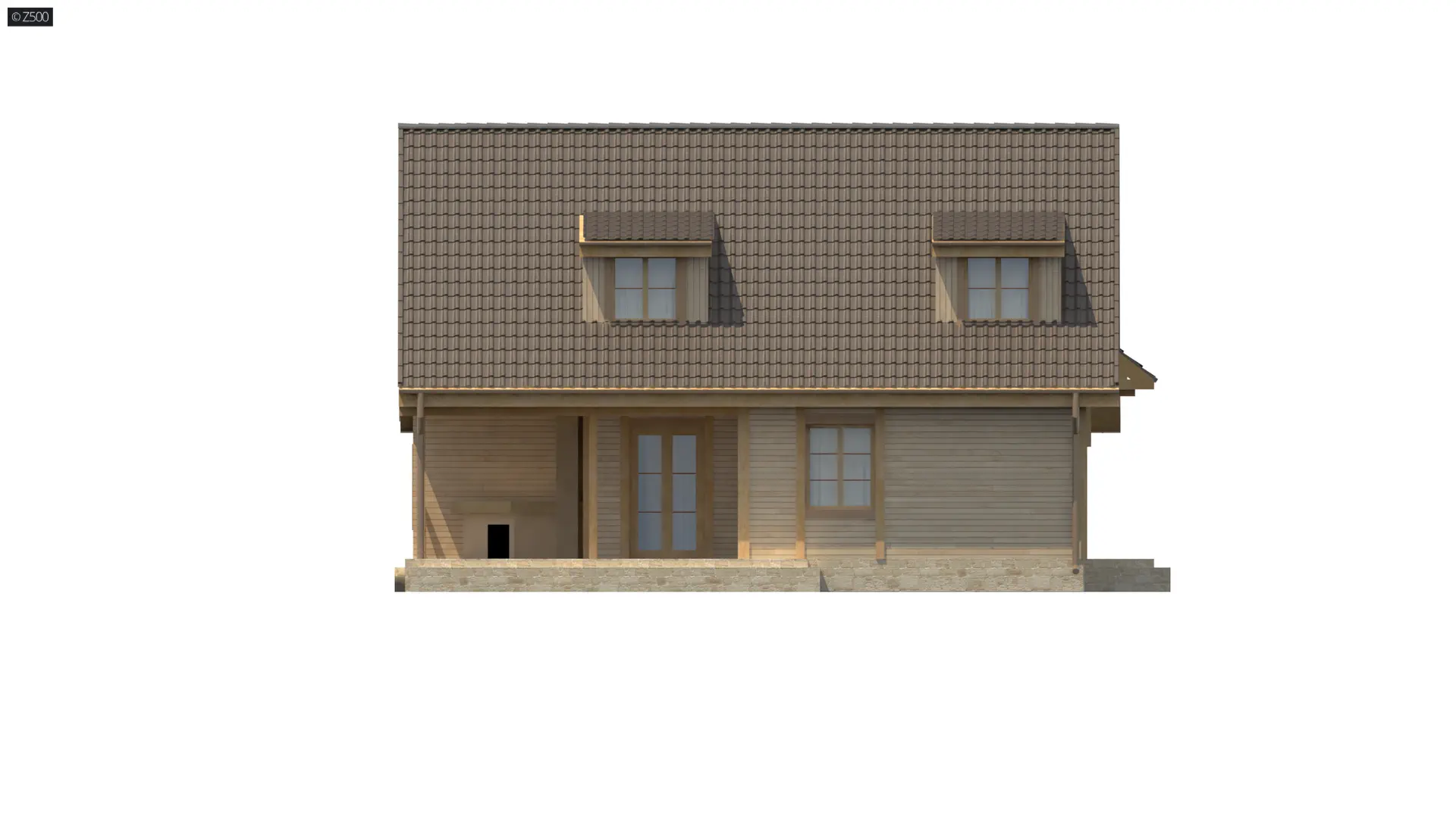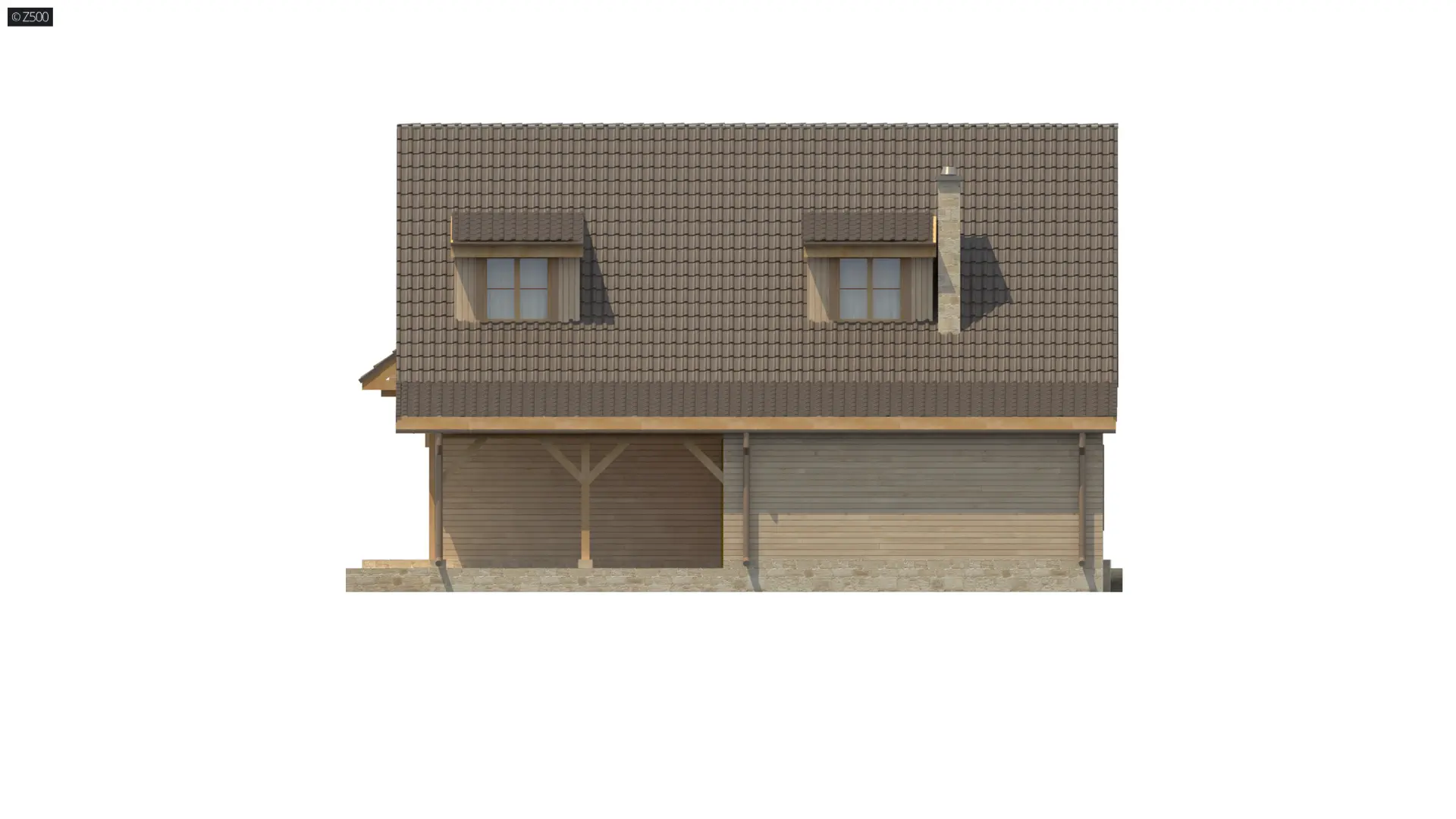 Projekt domu Z30 wyróżnia się tym, że w części ogrodowej zaprojektowano werandę z miejscem na kominek. Wejście do budynku osłonięto daszkiem wspartym na mieczach. Dodatkowo z prawej strony zaprojektowano garaż z wiatą od przodu i pomieszczeniem technicznym z tyłu. Cały garaż przykryty jest dachem pulpitowym.
