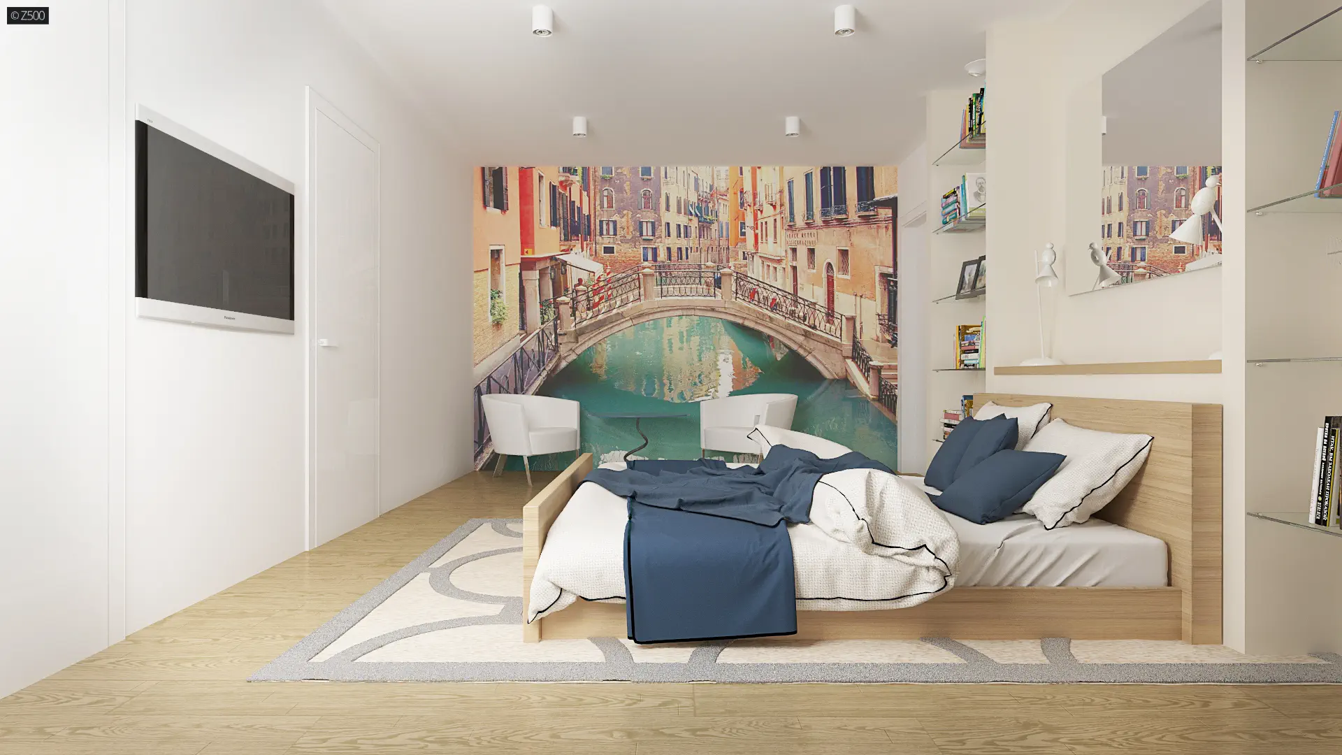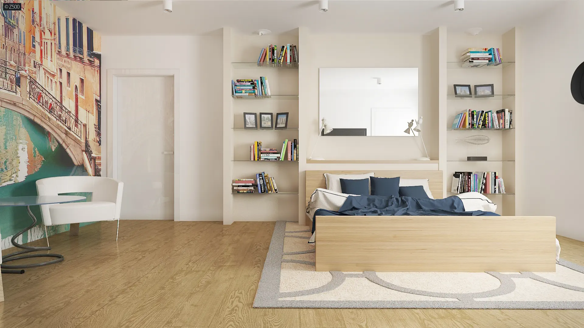 Wnętrze dzieli się na strefy: dzienną, nocną i gospodarczą. Z głównego holu dostępna jest odizolowana część nocna domu z pokojem do pracy, dwoma sypialniami, które posiadają własne garderoby i łazienką oraz 'master bedroom' posiada własną garderobę oraz łazienkę. Część dzienna to olbrzymi salon z kominkiem i wyjściem na zadaszony taras, połączony z otwartą kuchnią, która posiada spiżarnię. Istnieje możliwość zabudowy podcienia celem powiększenia powierzchni wypoczynkowej wewnątrz. Dodatkowo umieszczono tu niewielka łazienkę dla gości. Zaplecze gospodarcze domu to dwustanowiskowy garaż oraz pomieszczenie techniczne z bezpośrednim przejściem do sieni.