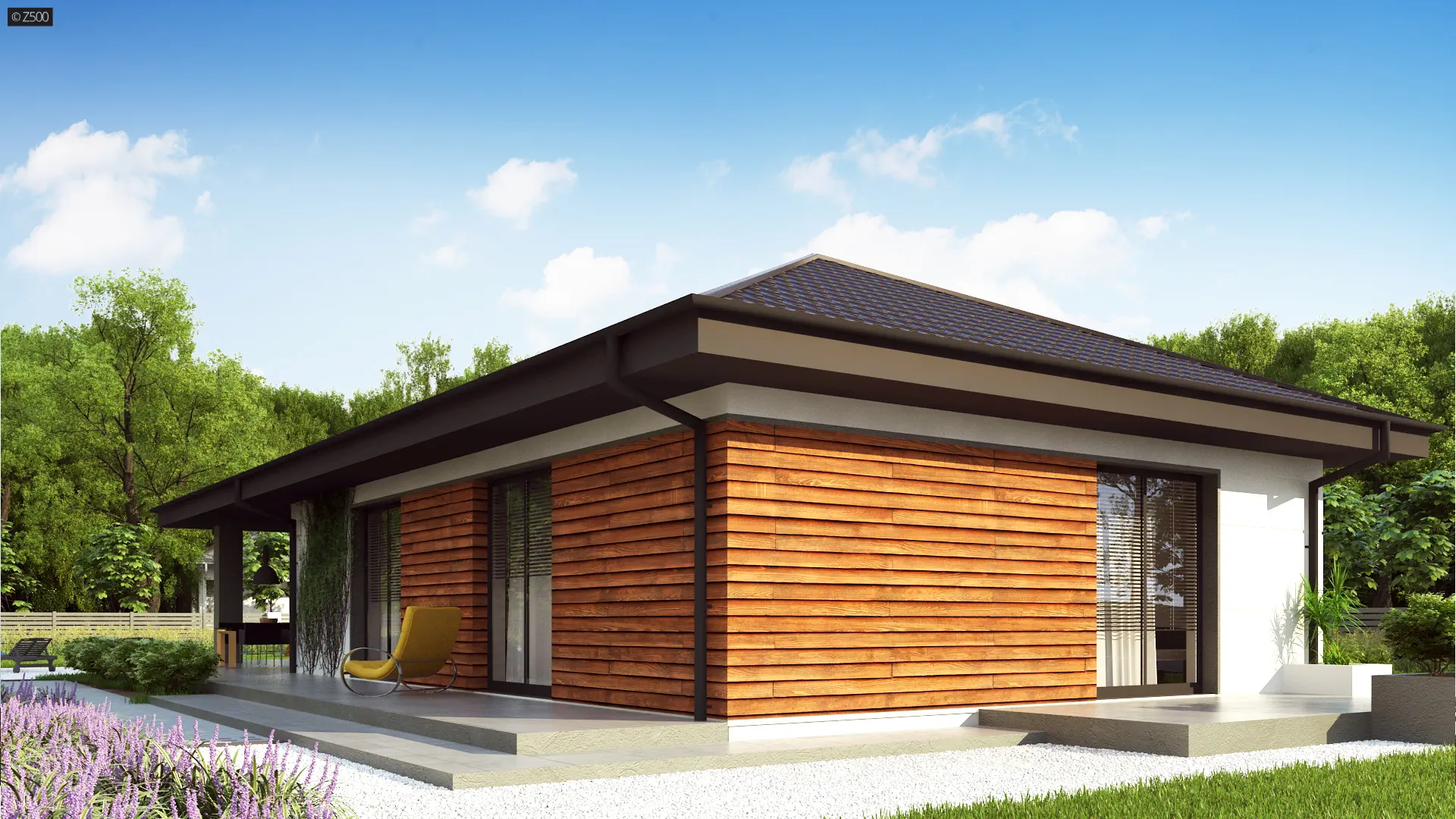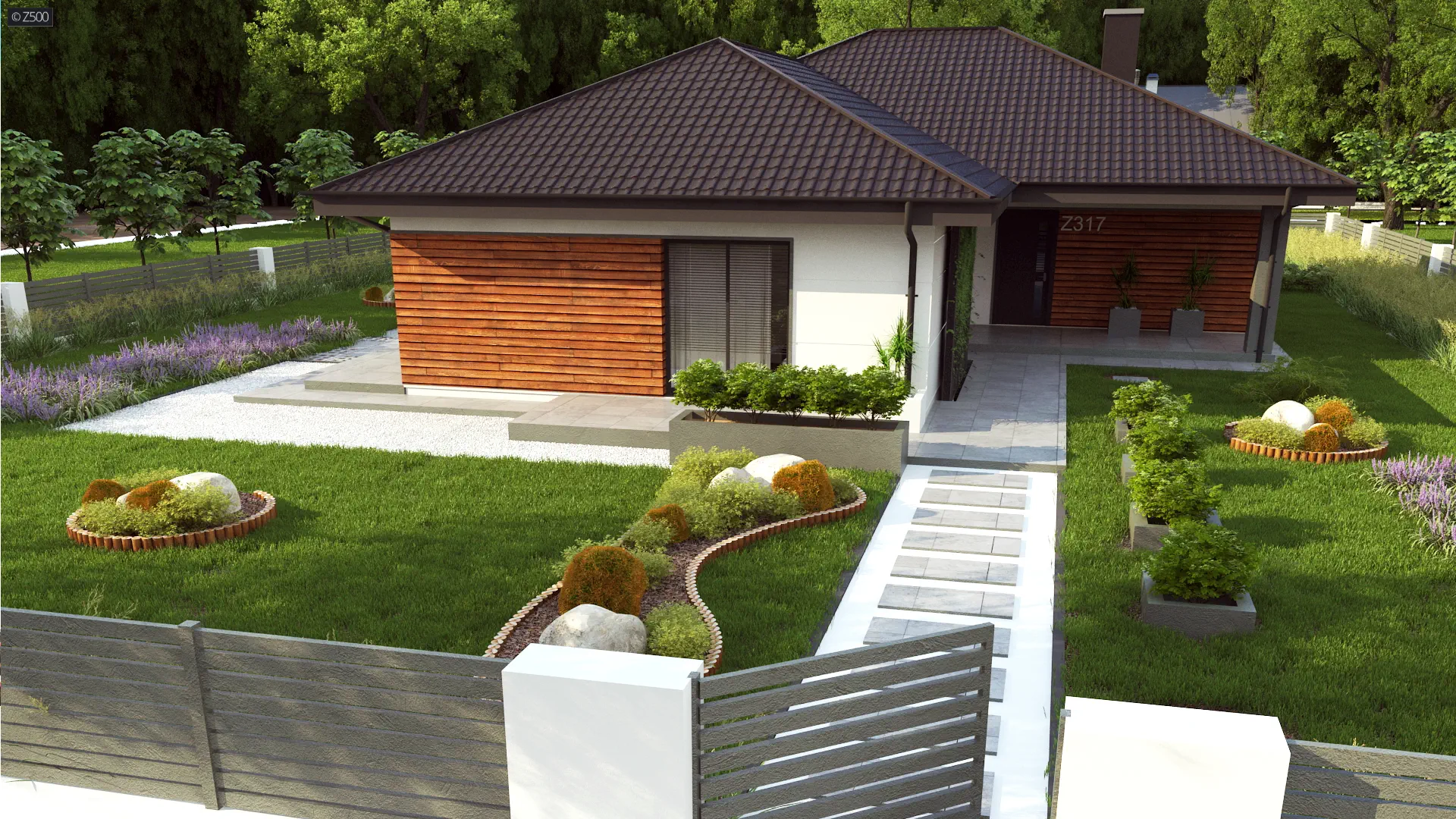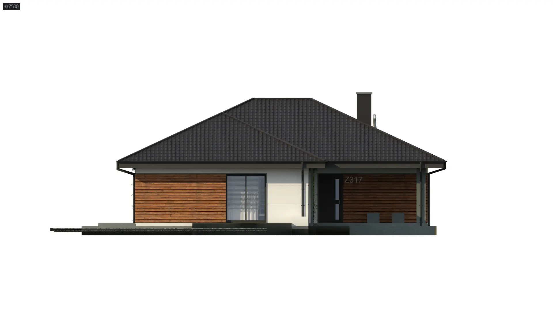 Z317 jest projektem współczesnego domu parterowego, z dachem wielospadowym wysuniętym z przodu, stanowiącym jednocześnie zadaszenie wejścia. To idealne połączenie funkcjonalności, piękna i wyjątkowego wyglądu. Modna kolorystyka, biały tynk z boniowaniami, drewniane panele, grafitowe słupki nawiązujące do ciemnego dachu, z pewnością zostaną docenione przez przyszłych właścicieli, szukających projektu niebanalnego, ale wygodnego i ekonomicznego w eksploatacji.