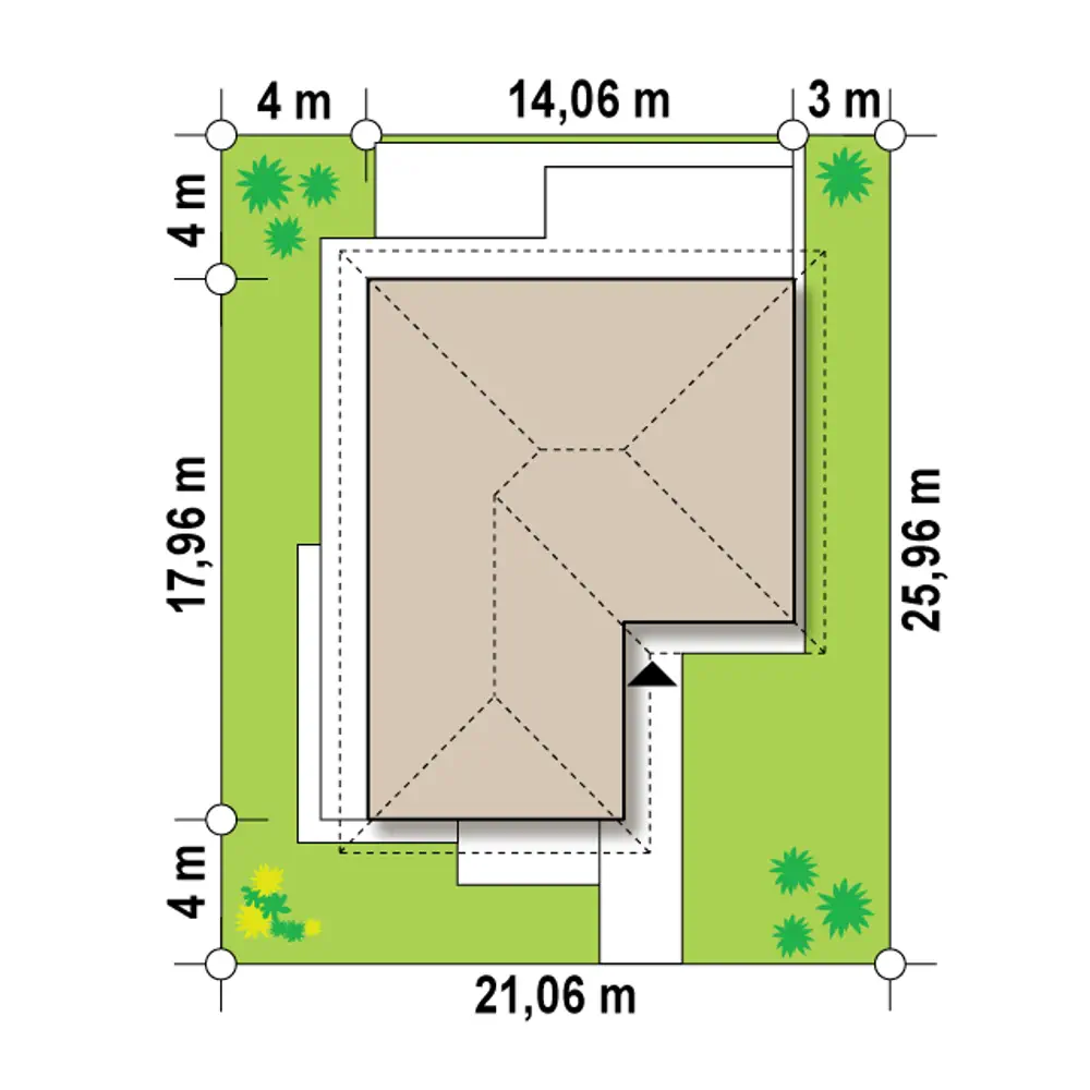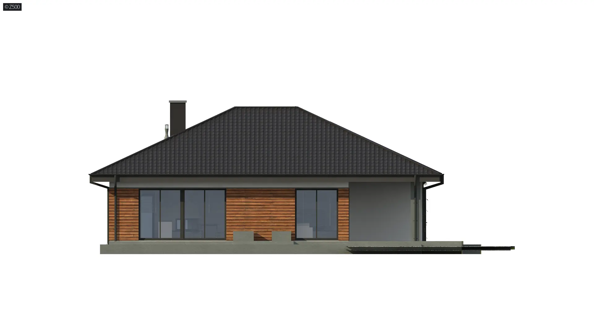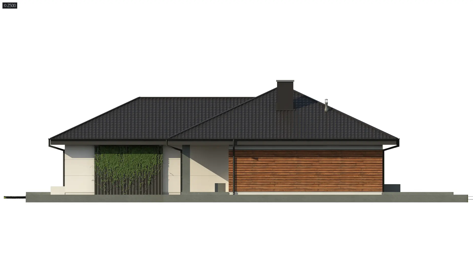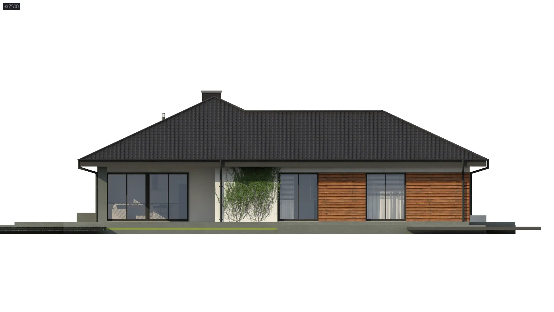 Z317 jest projektem współczesnego domu parterowego, z dachem wielospadowym wysuniętym z przodu, stanowiącym jednocześnie zadaszenie wejścia. To idealne połączenie funkcjonalności, piękna i wyjątkowego wyglądu. Modna kolorystyka, biały tynk z boniowaniami, drewniane panele, grafitowe słupki nawiązujące do ciemnego dachu, z pewnością zostaną docenione przez przyszłych właścicieli, szukających projektu niebanalnego, ale wygodnego i ekonomicznego w eksploatacji.