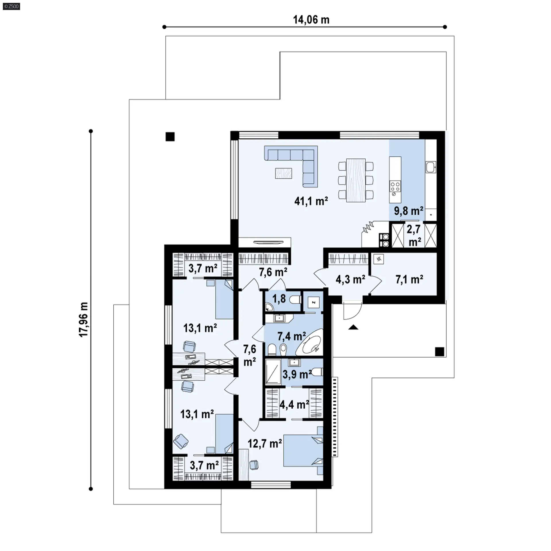 Nowa propozycja od Z500 z odwróconym układem pomieszczeń i cofniętym wejściem daje możliwość komfortowego rozdzielenia strefy dziennej od nocnej.