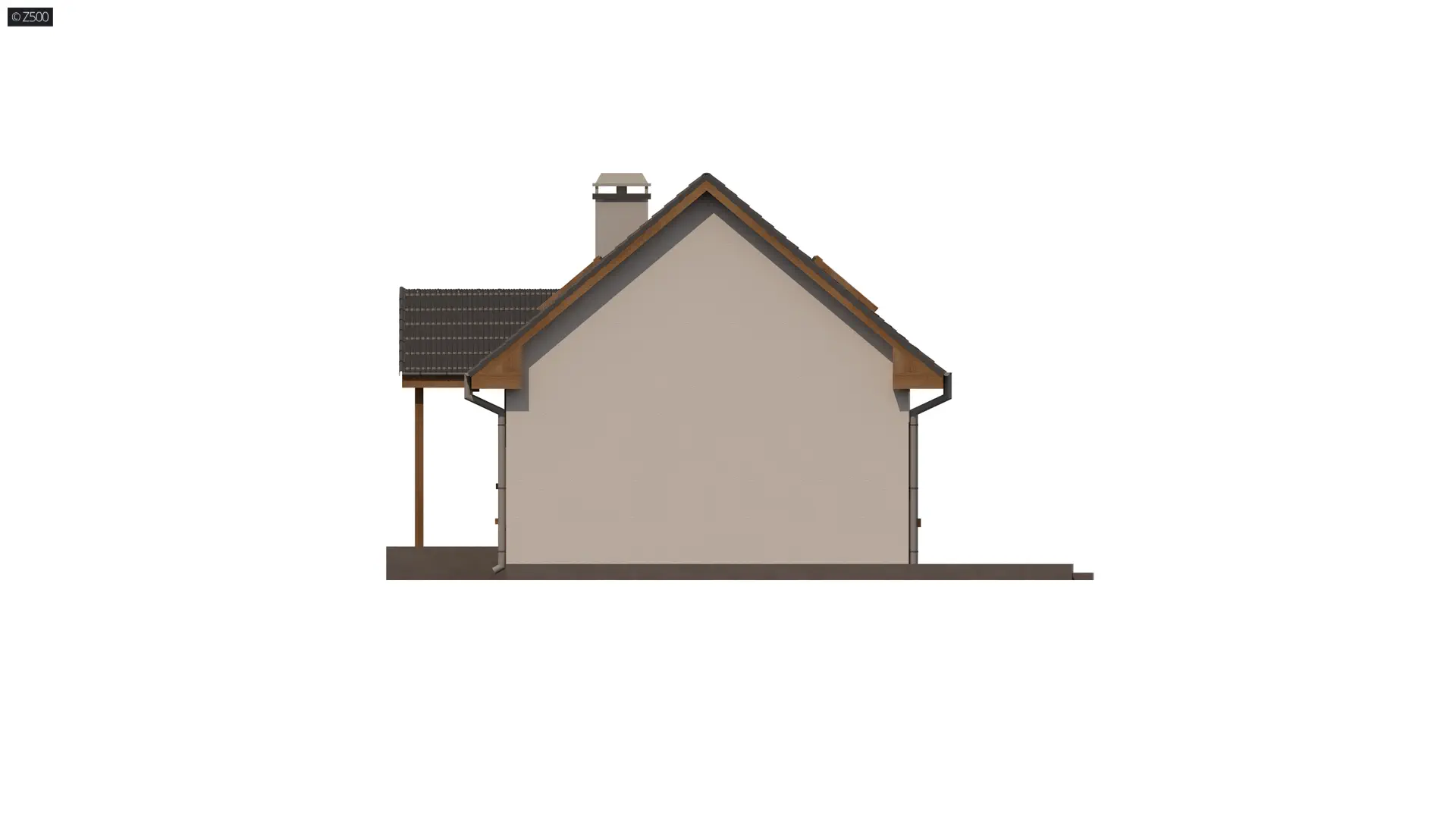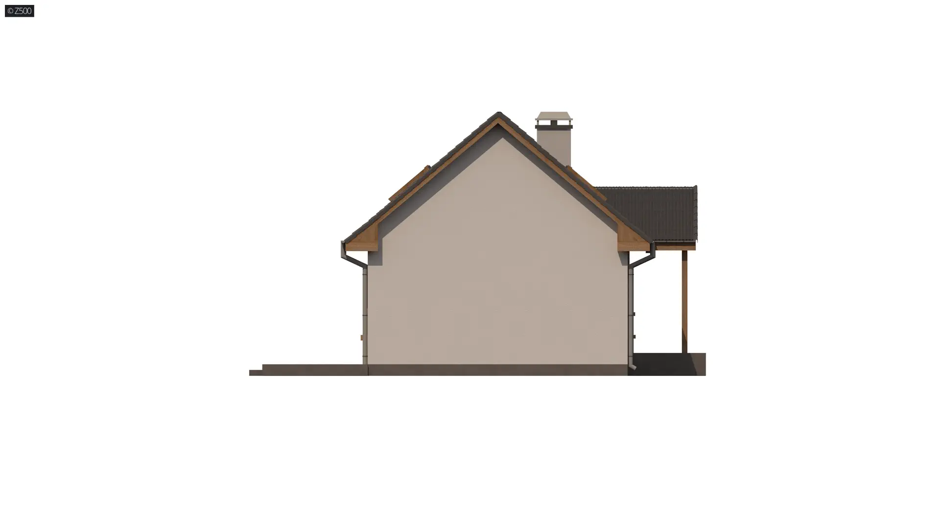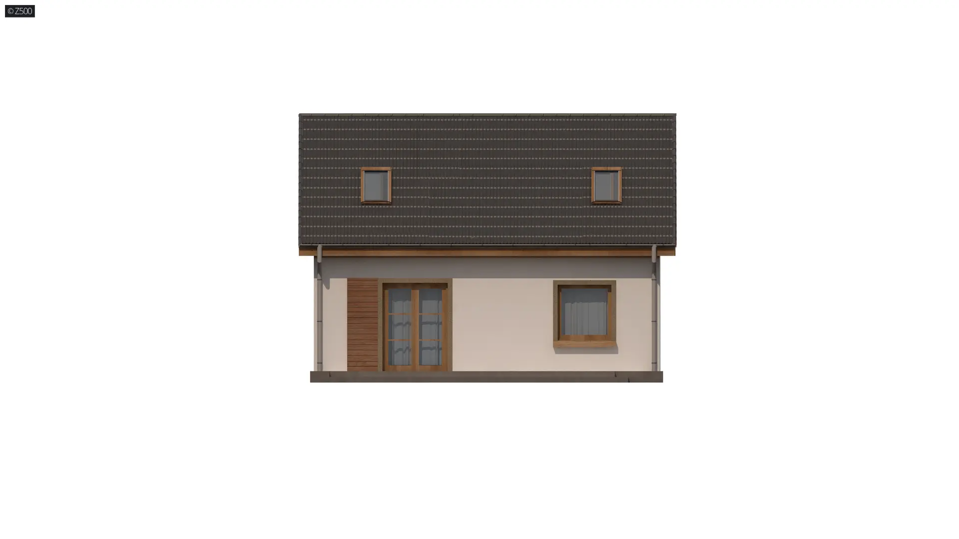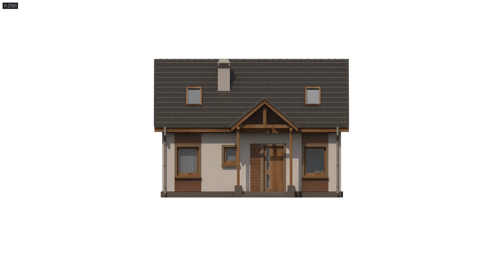 Projekt domu Z32 D v2 na pewno spodoba się tym, którzy szukają domu małego, taniego i funkcjonalnego. Elewację utrzymano w jasnej kolorystyce. Cienkowarstwowy tynk ocieplono drewnopodobnymi płytami elewacyjnymi. Wejście do budynku zostało osłonięte dwuspadowym zadaszeniem wspartym na słupkach.