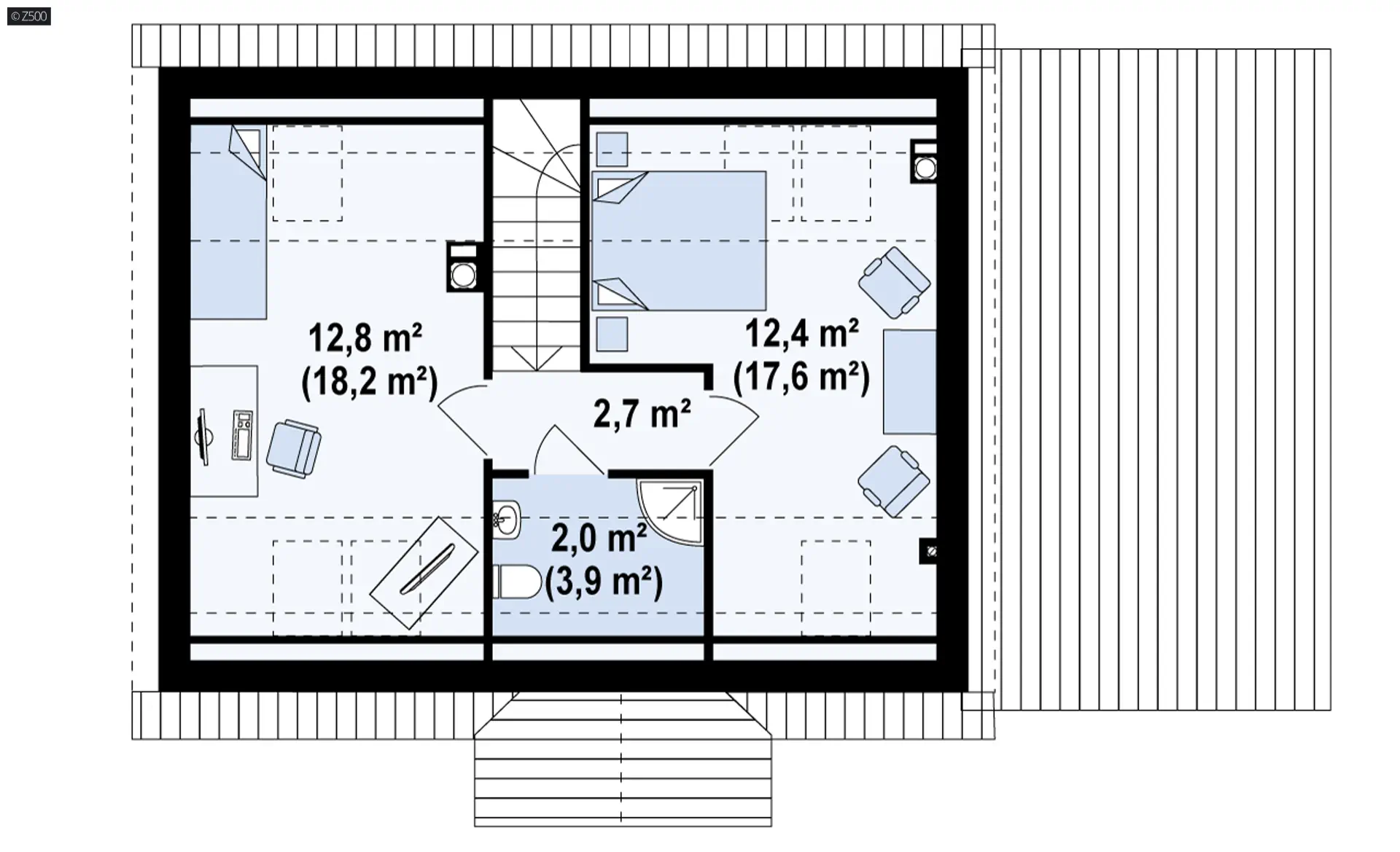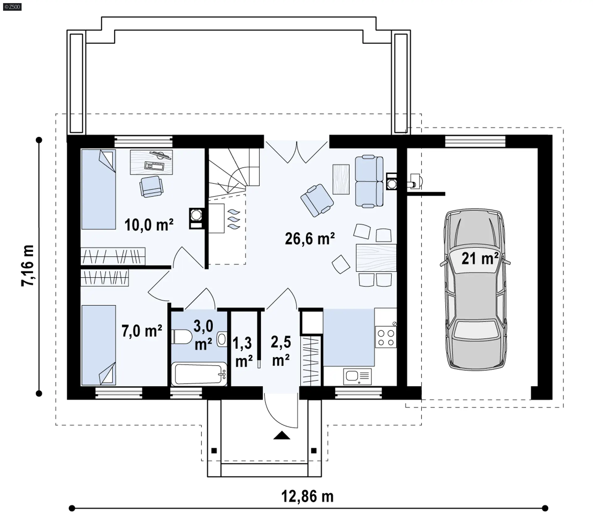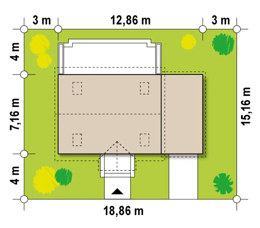 Projekt domu Z32 GPp to ekonomiczny dom na małą działkę z dachem dwuspadowym, garażem i 4 pokojami. W układzie przewidziano 4 sypialnie, 2 łazienki, salon 23,8 m², garaż jednostanowiskowy. Minimalna działka: 18,96 m × 15,26 m.