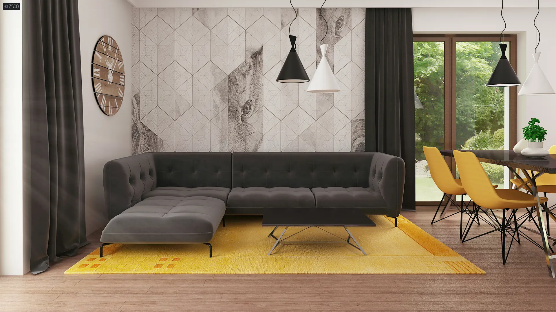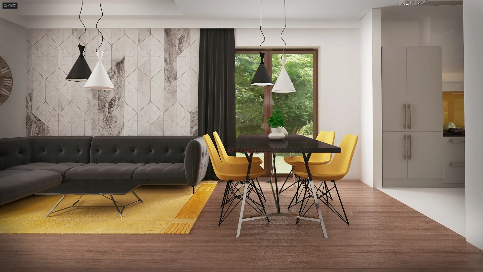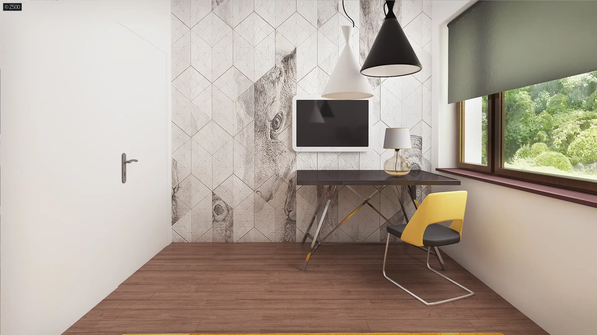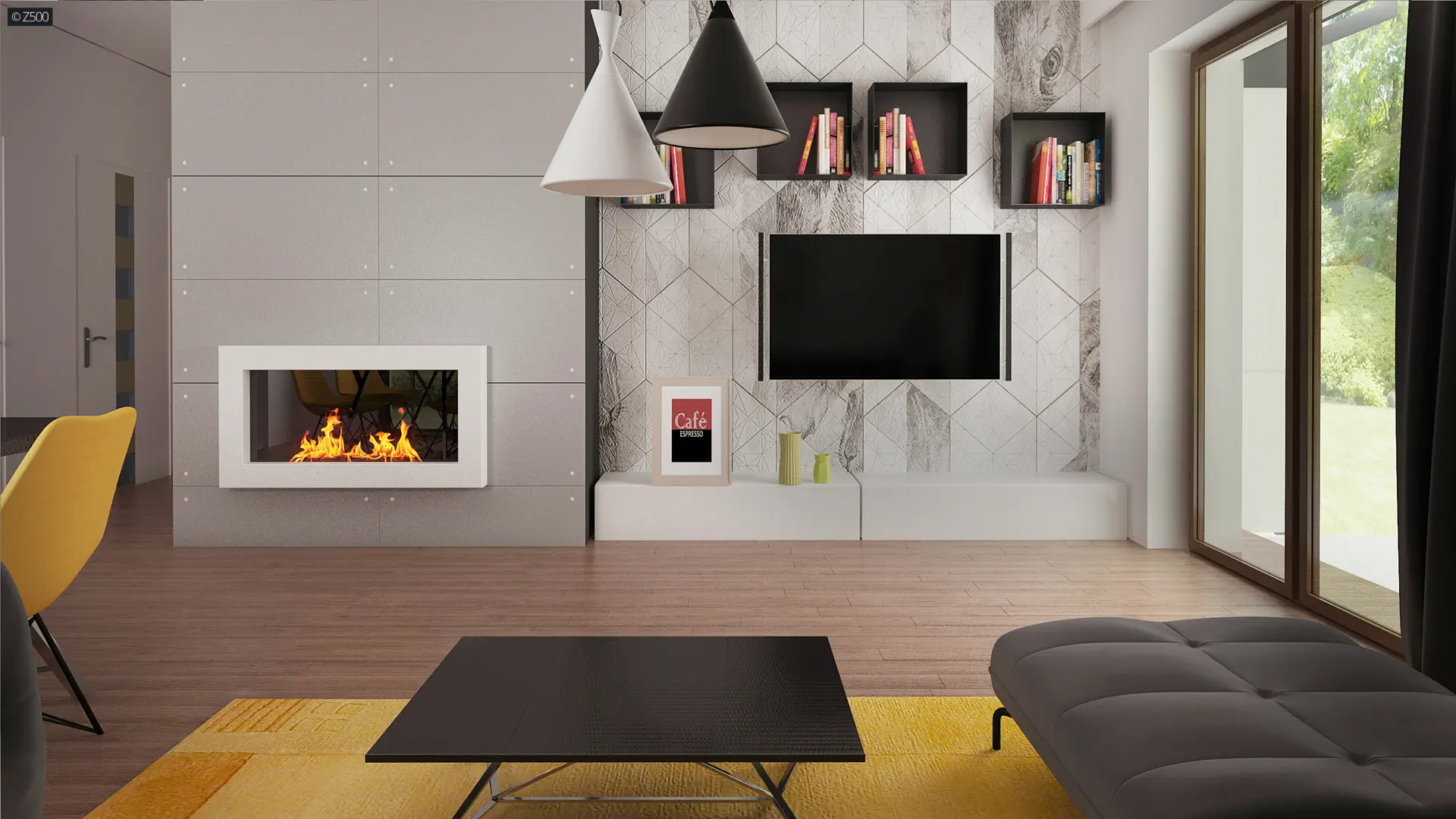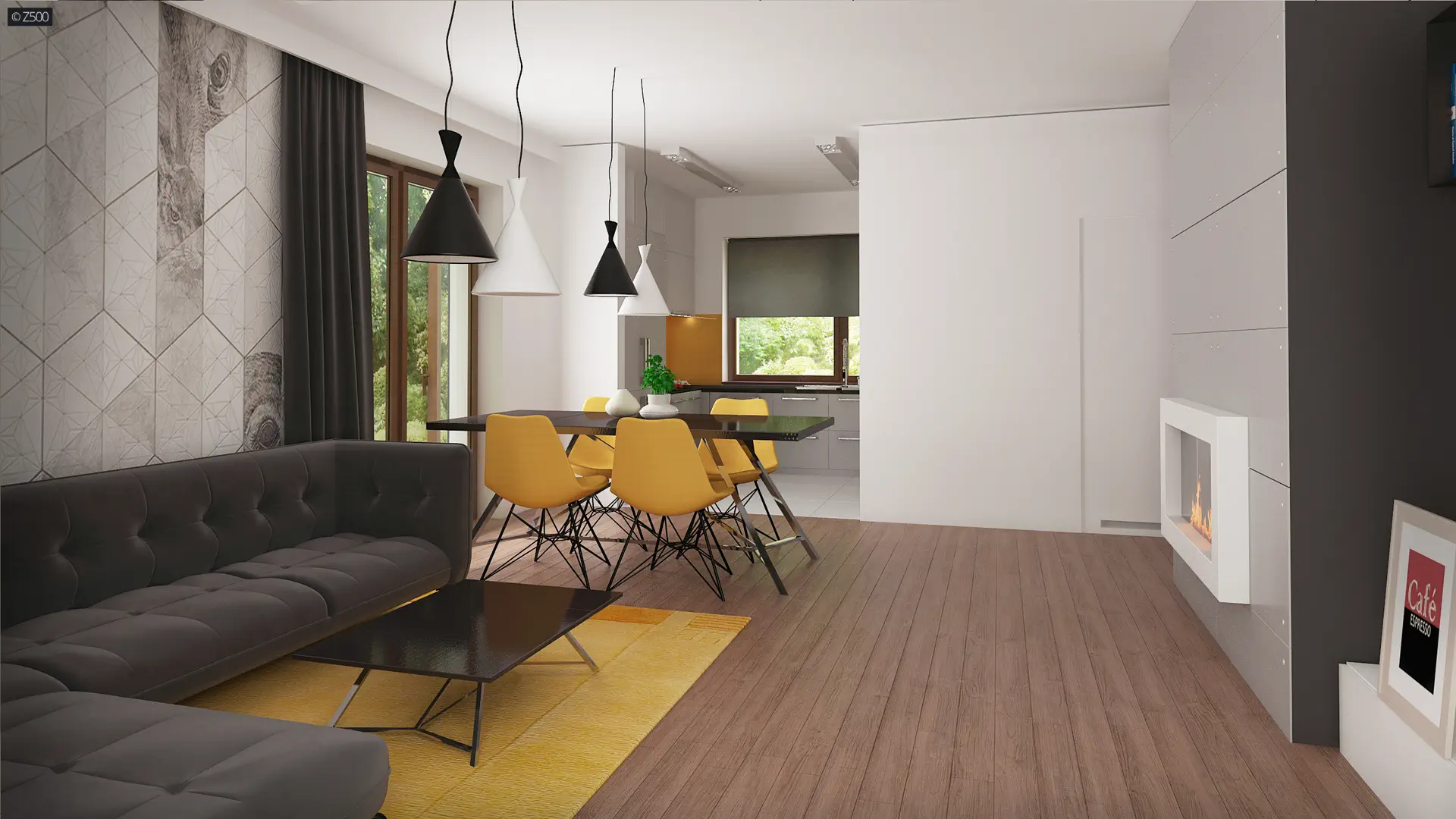 Dom podzielono na dwie strefy. Strefa dzienna znajduje się z prawej strony. Salon połączono z gustownie urządzoną jadalnią, biokominek rozplanowano centralnie, a całość doświetlono oknami do samej ziemi, które stanowią zarazem wyjście na zewnątrz domu.