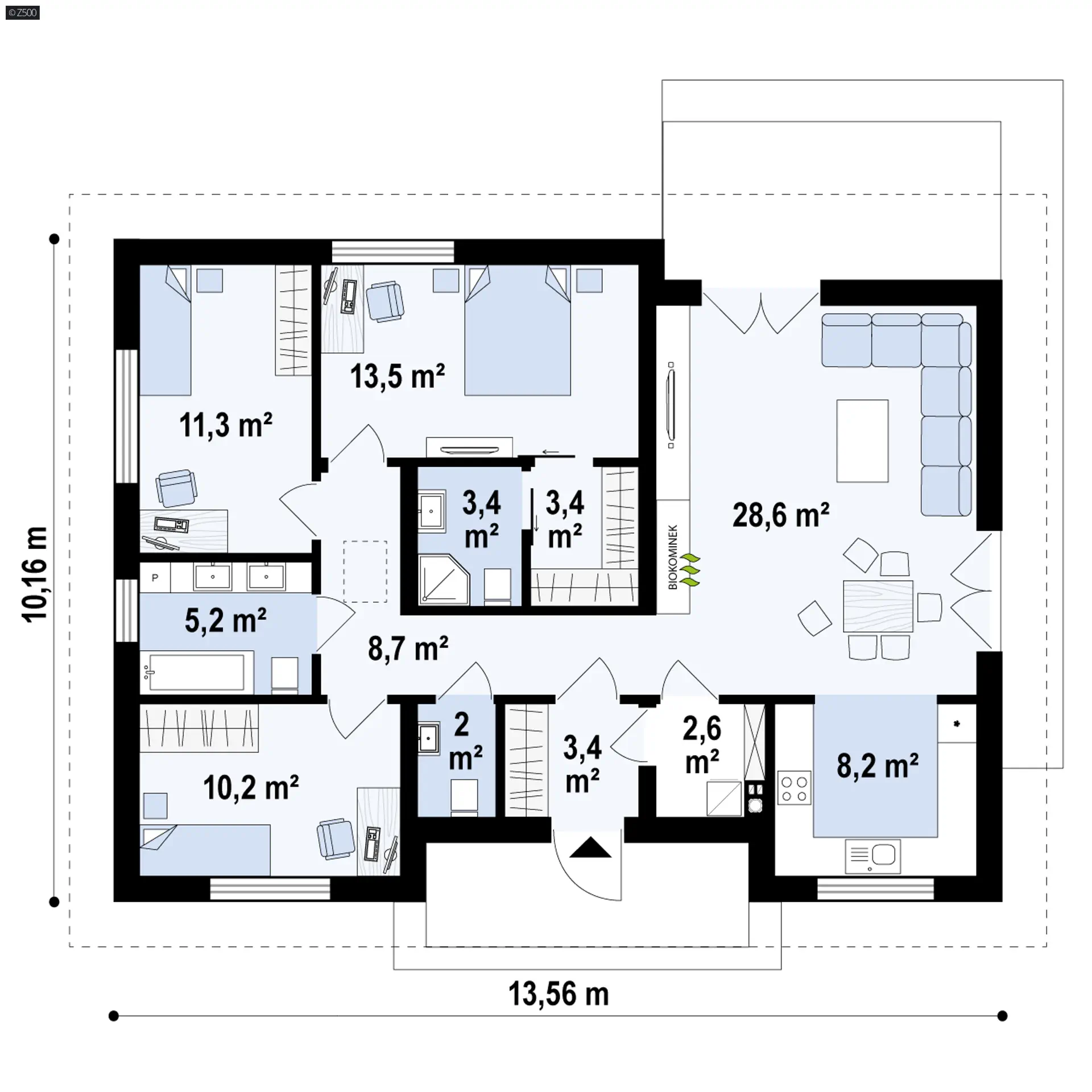 Dom parterowy z dachem dwuspadowym, 3 sypialniami i przestronną strefą dzienną.
