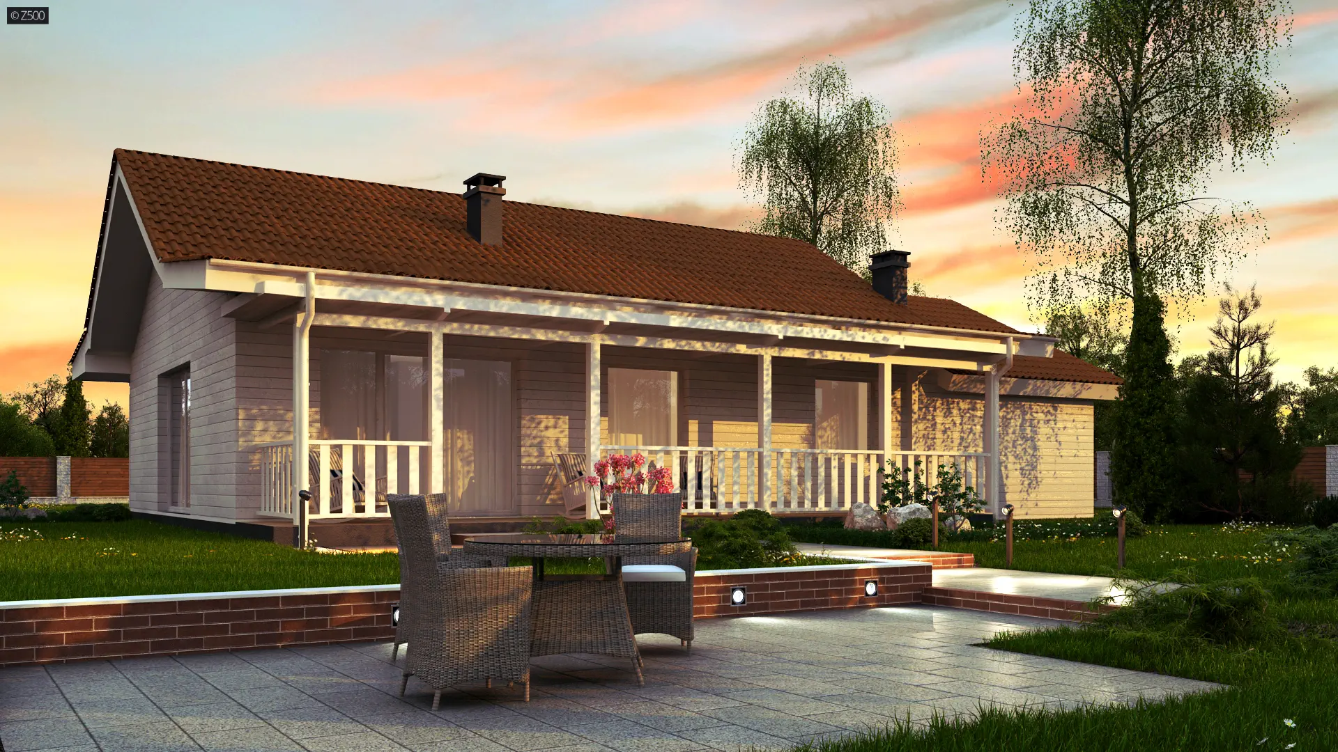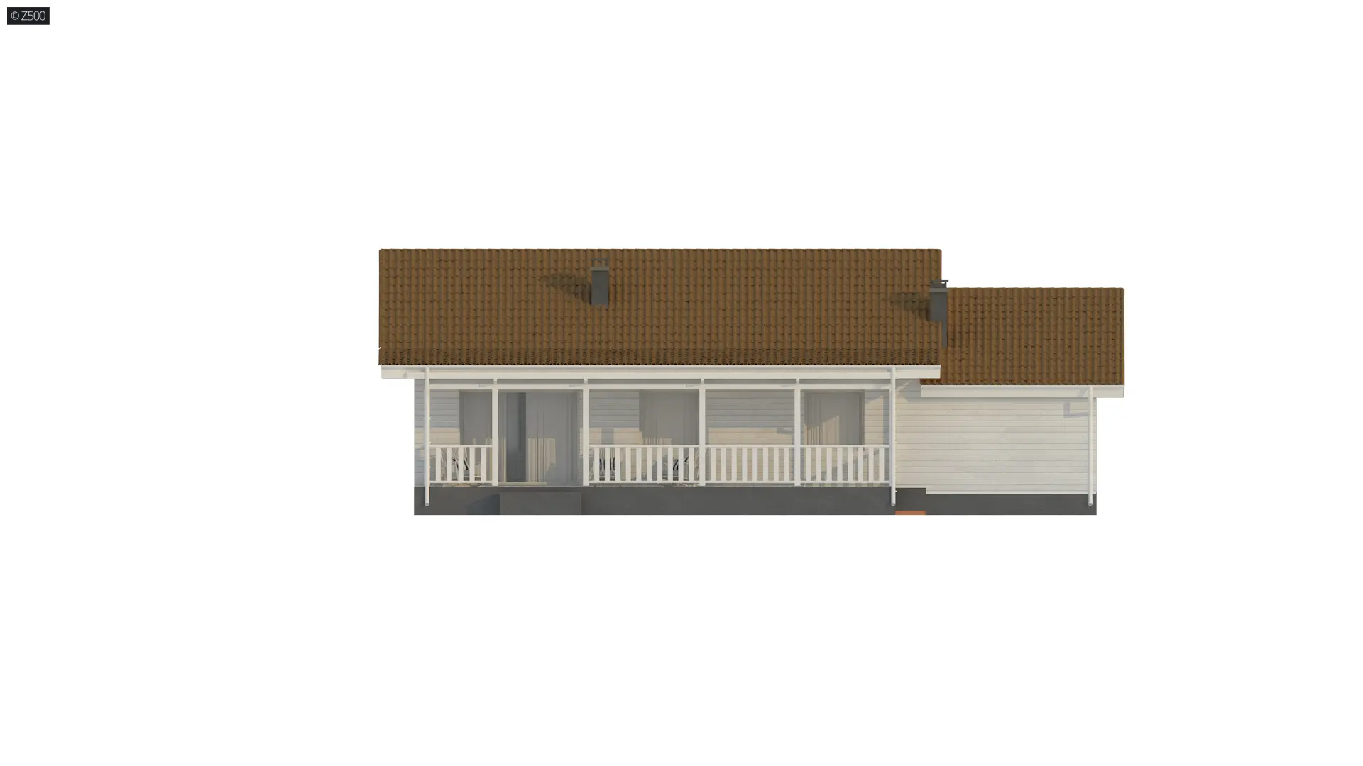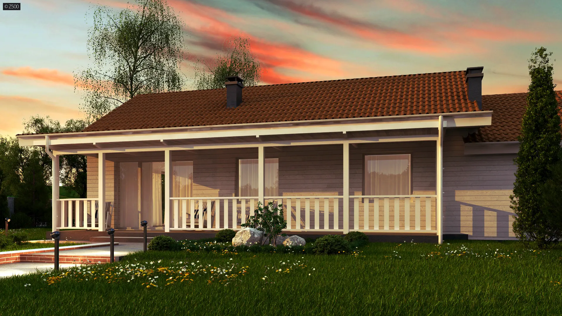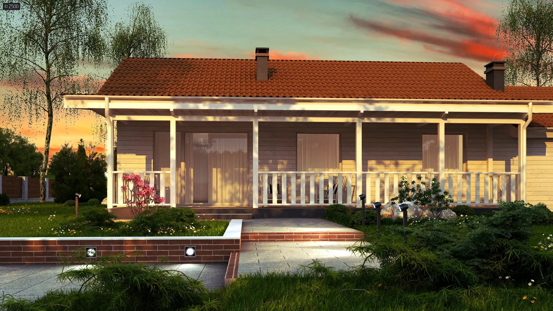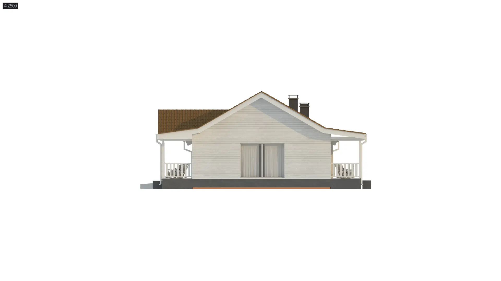 Dom parterowy w stylu toskańskim, w których lubują się również Amerykanie. Elewację ozdobiono jasnymi panelami drewnianymi, co sprawia, że świetnie komponuje się z dwuspadowym dachem o kolorze cegły. Balustrada na werandzie jest elementem funkcjonalno-ozdobnym.