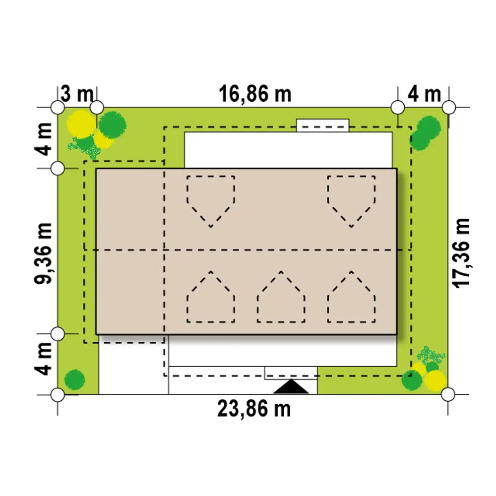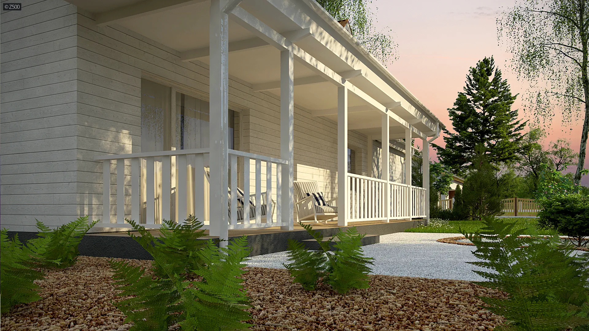 Dom parterowy z poddaszem, w stylu kolonialnym, w których lubują się również Amerykanie. Zbliżony w smaku do projektu Z340. Odróżniają go lukarny na poddaszu oraz posiadanie dwóch poziomów. Elewację ozdobiono jasnymi panelami drewnianymi, co sprawia, że świetnie komponuje się z dwuspadowym dachem o kolorze cegły. Balustrada na werandzie jest elementem funkcjonalno-ozdobnym.