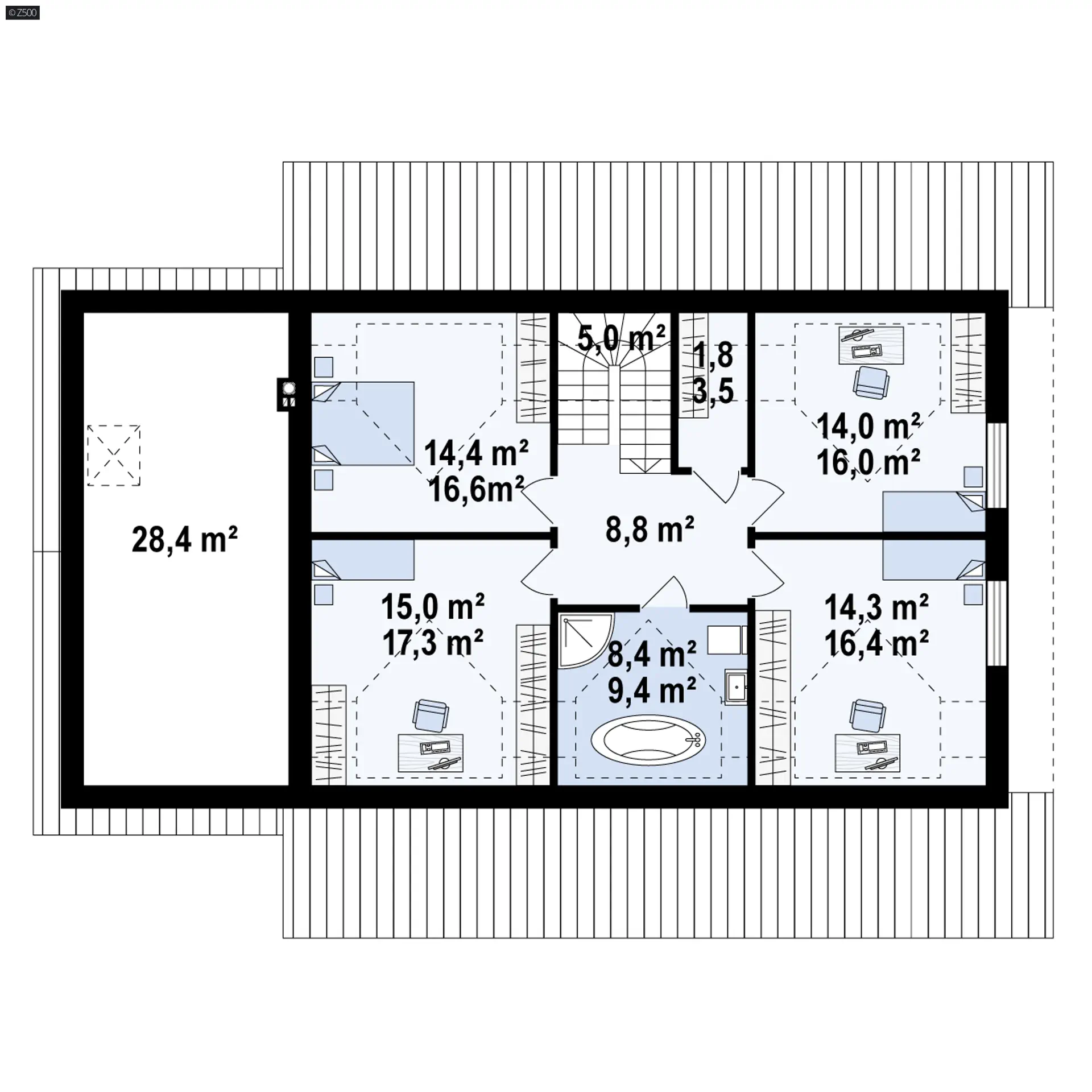 Poddasze użytkowe to 4 pokoje, które dzięki lukarnom zyskują powiększoną powierzchnię w pionie oraz dodatkową dozę światła dziennego. Tutaj również mamy do dyspozycji duży pokój kąpielowy. Natomiast wspólna garderoba śmiało może zostać przeznaczona jako schowek na szczotki, odkurzacz lub deskę do prasowania.