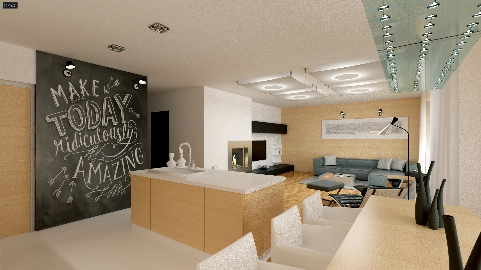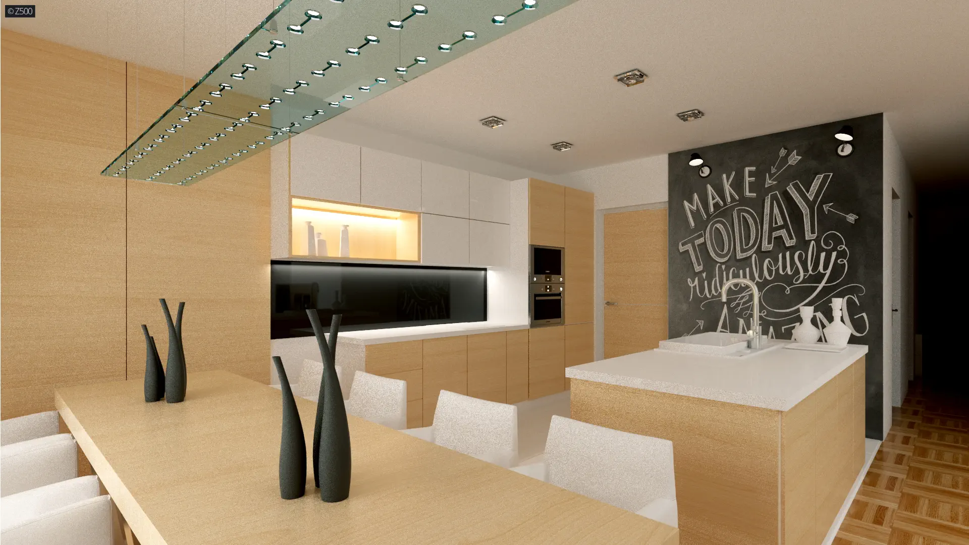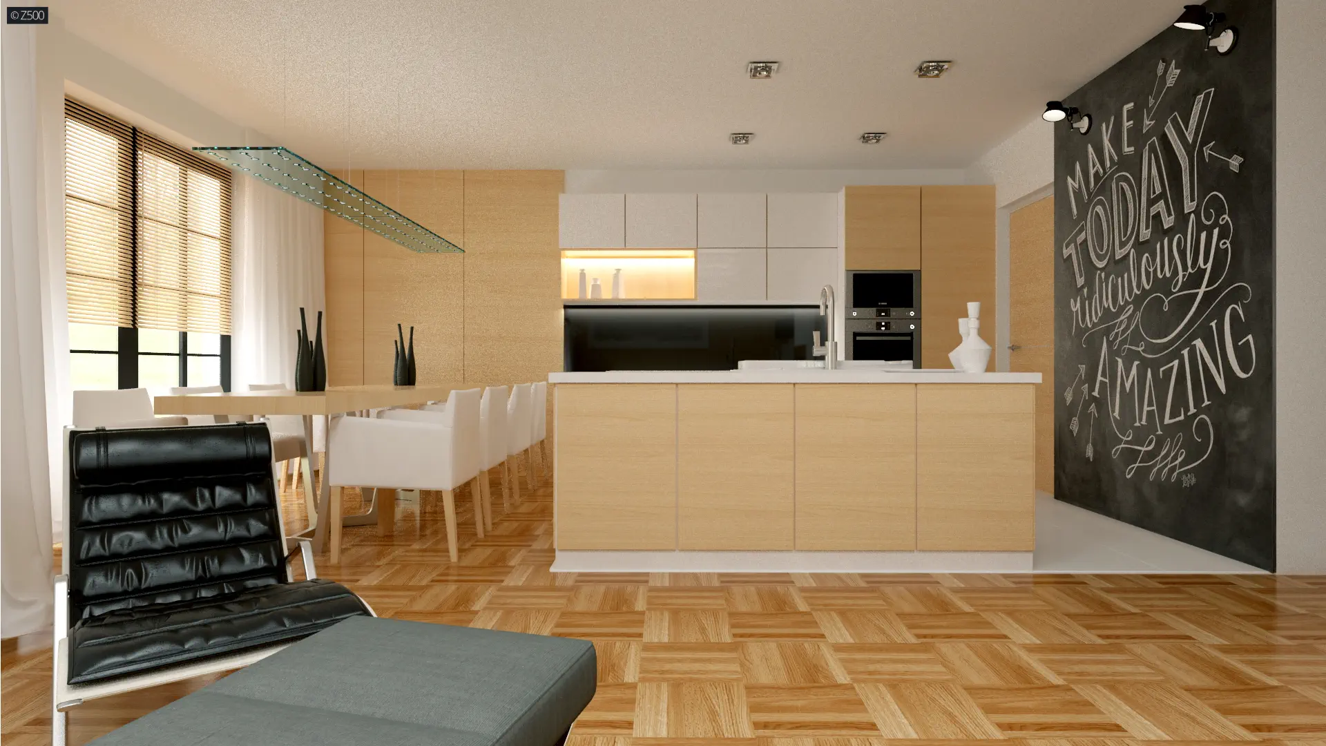 Kuchnia połączona z jadalnią, może zostać częściowo oddzielona od salonu - wedle potrzeby i uznania przyszłych mieszkańców. Wc zaprojektowano przy salonie po to, aby odwiedzający nas goście nie musieli wchodzić do drugiej, prywatnej części domu. Nocna część domu składa się z 3 sypialni.