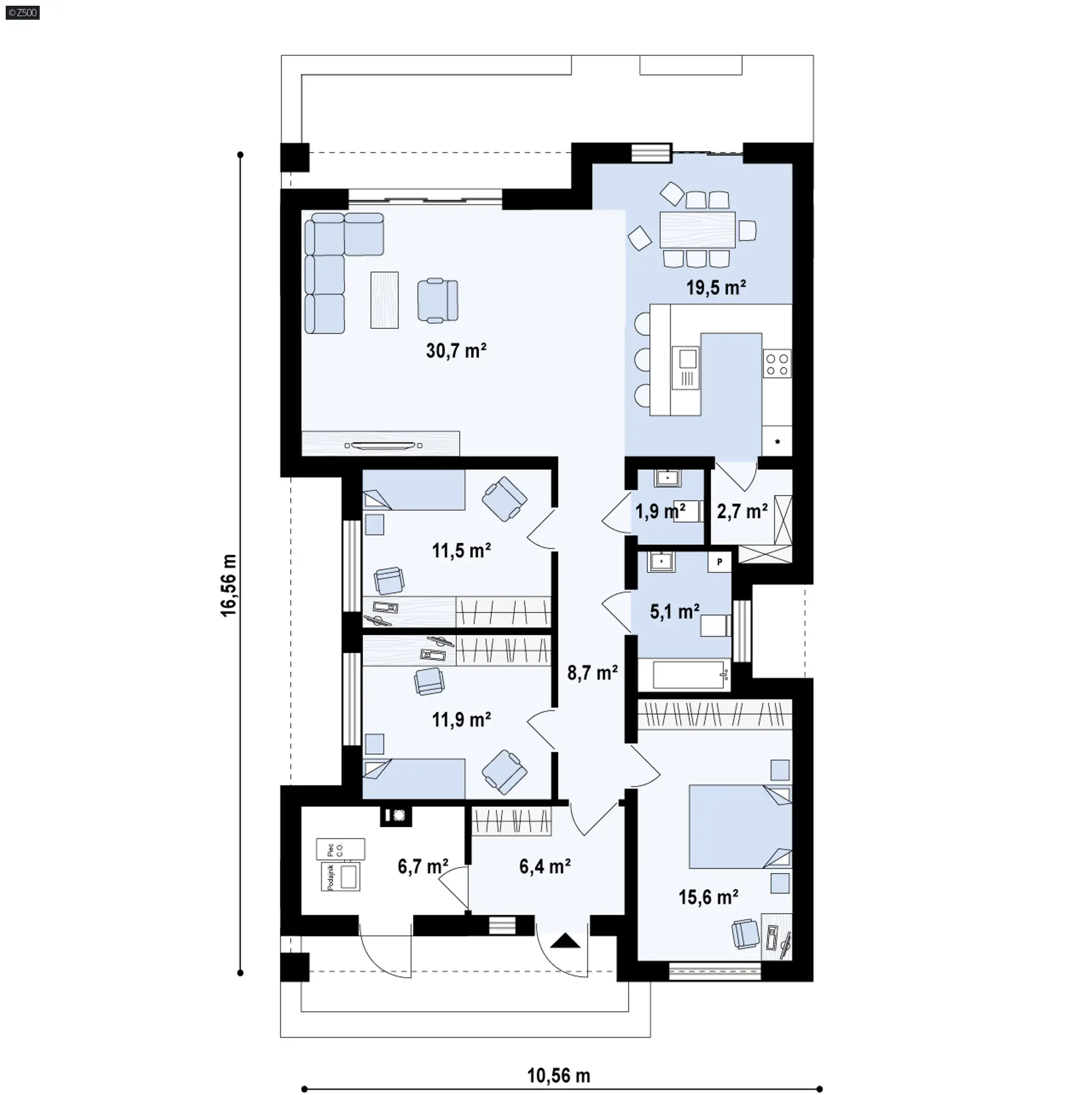 Zadaszone wejście prowadzi do sieni i przylegającego pomieszczenia gospodarczego. Po wejściu do wnętrza domu możemy skoncentrować nasze życie w dziennej lub nocnej części domu.