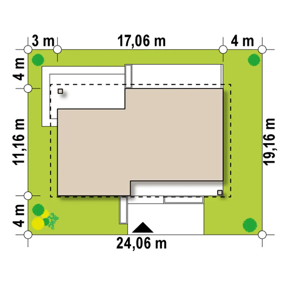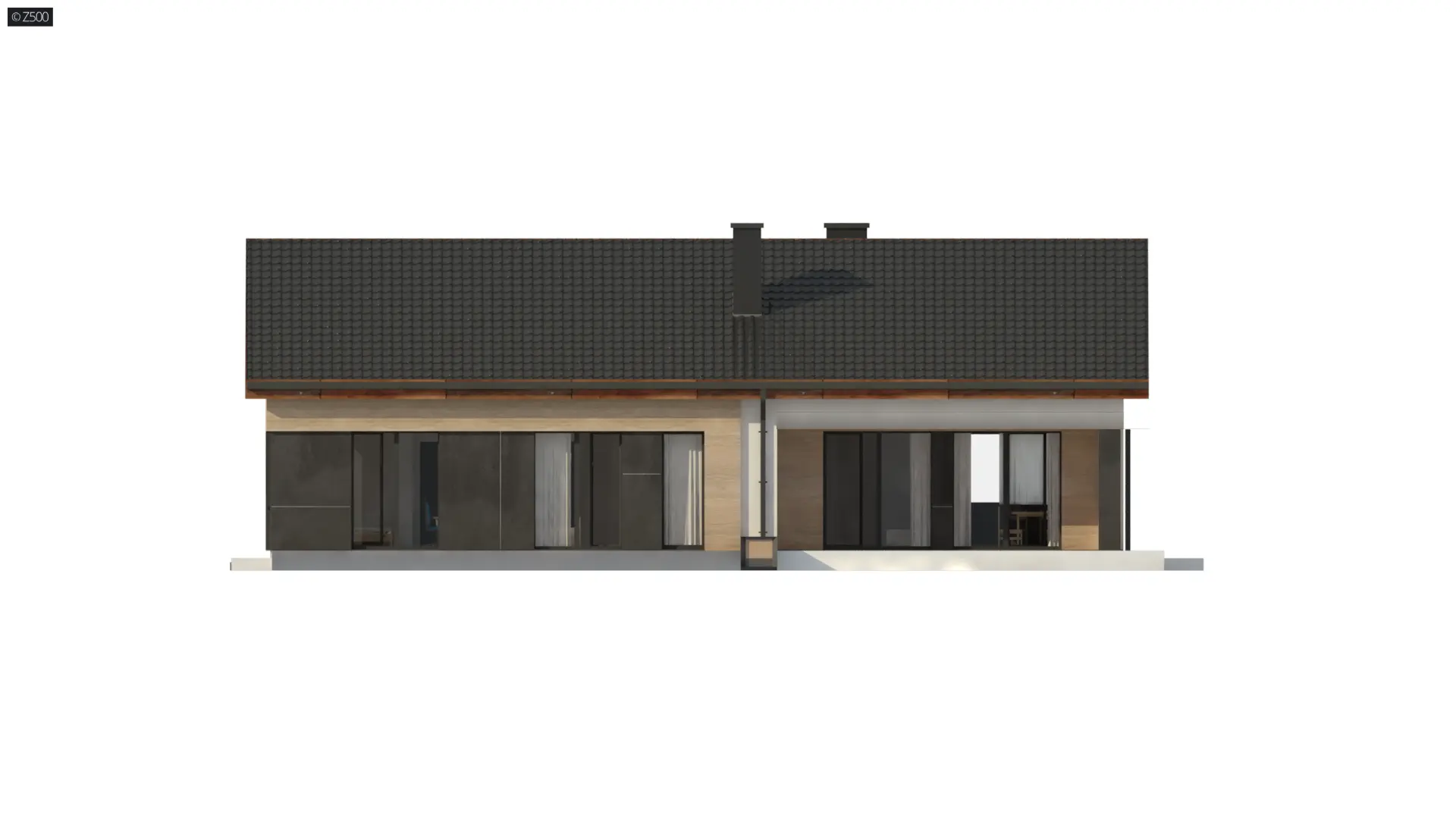 Z349 to nowoczesny dom parterowy, zaprojektowany z myślą o rodzinie 2+2 lub 2+3, która ceni wygodę i funkcjonalny układ wnętrz. Sercem domu jest przestronny salon z jadalnią o powierzchni 32,1 m², połączony z otwartą kuchnią o powierzchni 11,2 m². Duże przeszklenia wychodzące na taras pięknie doświetlają wnętrze i otwierają dom na ogród, a kominek w salonie tworzy przytulny klimat. Kuchnia została dodatkowo wyposażona w spiżarnię, co zwiększa wygodę użytkowania.
