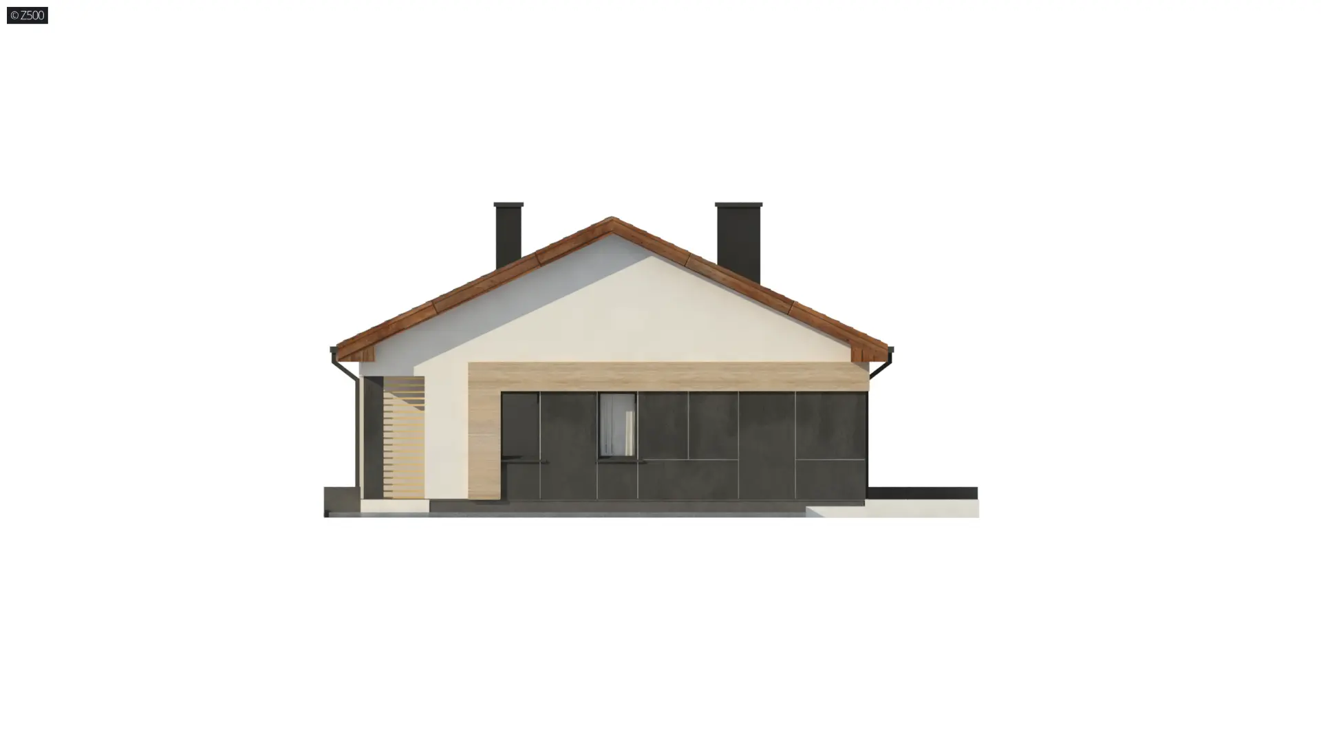 Projekt przewiduje także pomieszczenie gospodarcze o powierzchni 5,7 m², co daje możliwość zastosowania różnych źródeł ogrzewania. Prosta bryła budynku przykryta jest dwuspadowym dachem, a eleganckie połączenie jasnego tynku, drewna i ciemnych akcentów sprawia, że dom wyróżnia się nowoczesnym i ponadczasowym stylem.