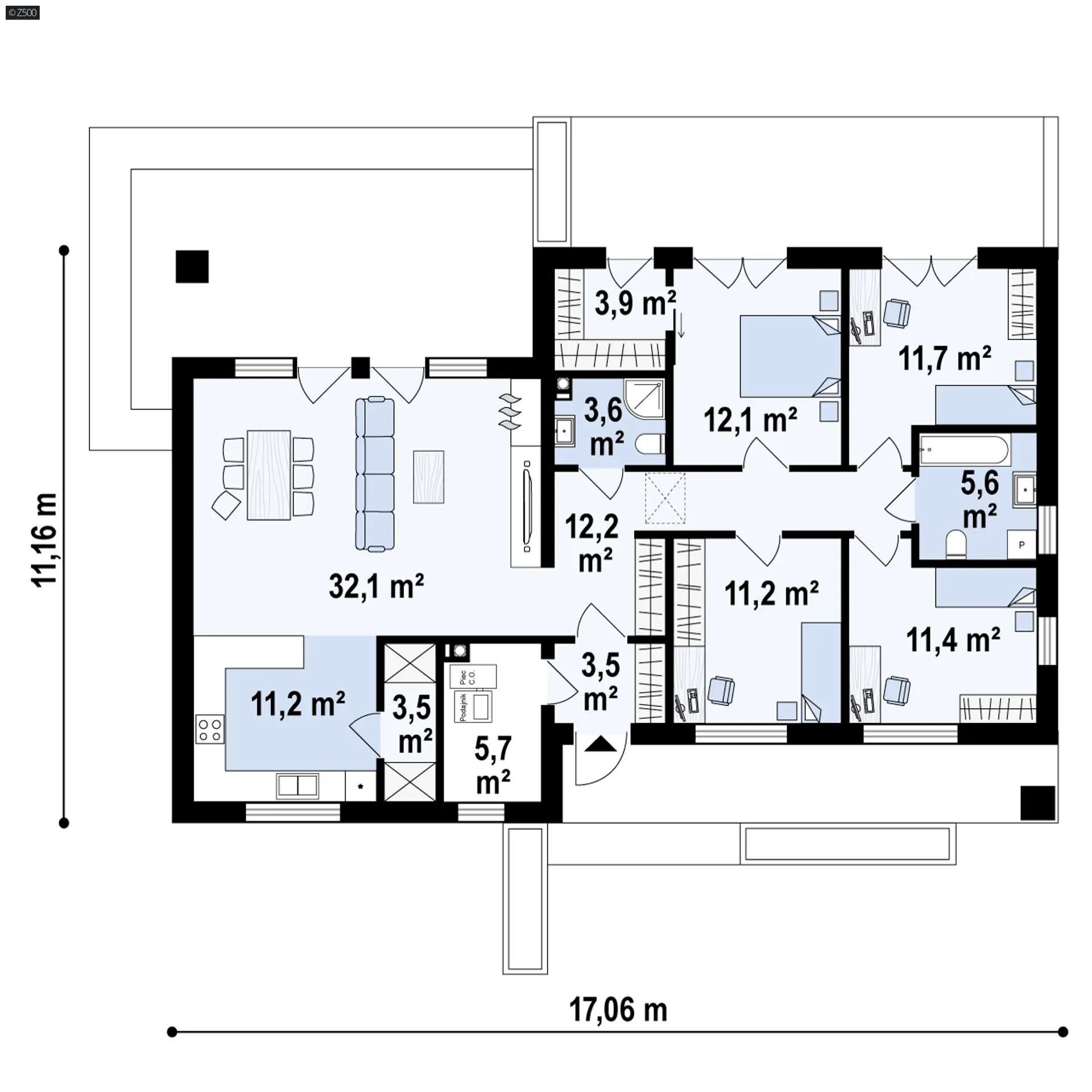 Dom parterowy na planie prostokąta z 4 sypialniami i przestronną strefą dzienną