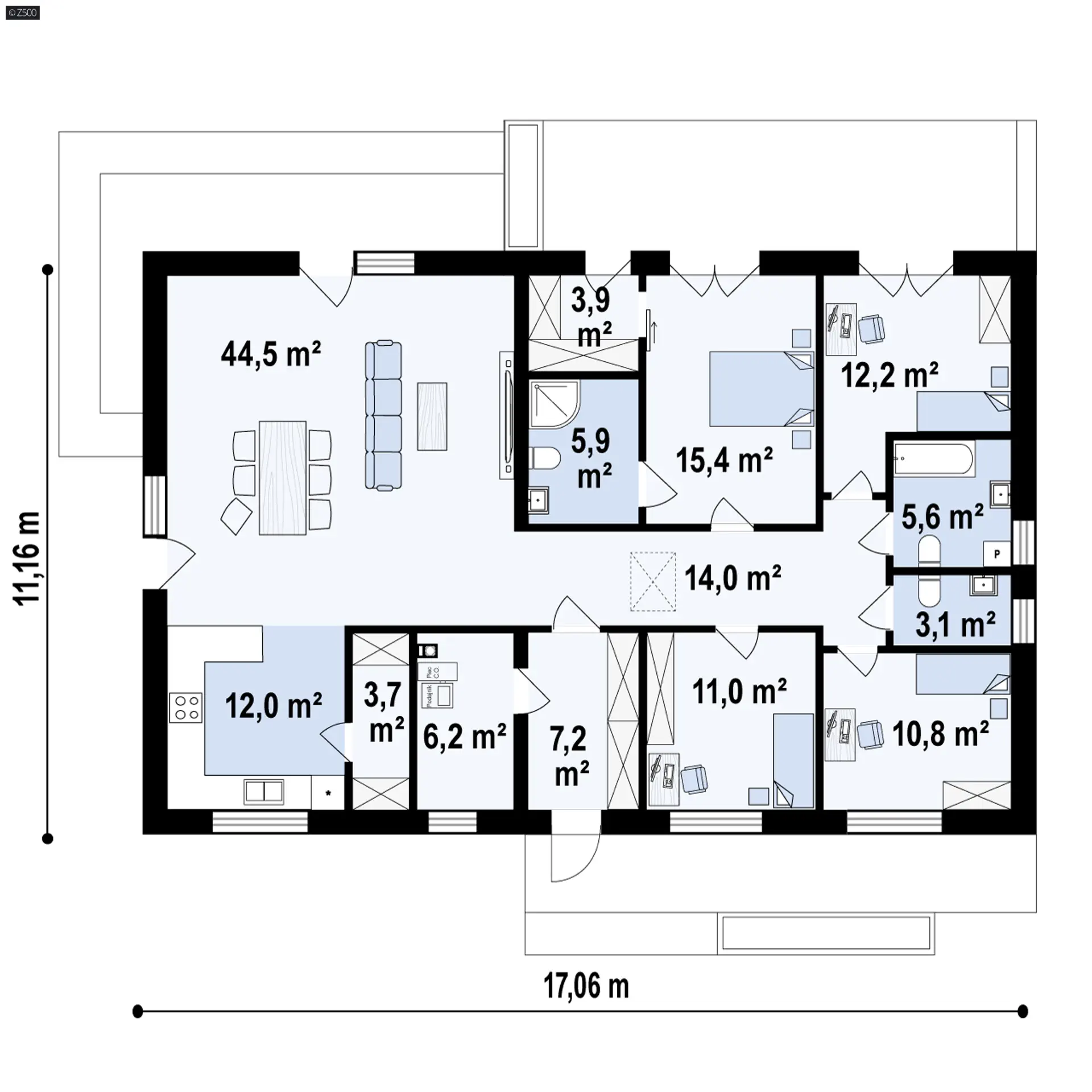 4 sypialnie w parterowym domu z dachem dwuspadowym o niewielkiej powierzchni to rzadkość. Budynek jest jednocześnie niedrogi w budowie. Dedykowany jest dla osób, które na niewielkiej powierzchni pragną mieć 4 niezależne pokoje.