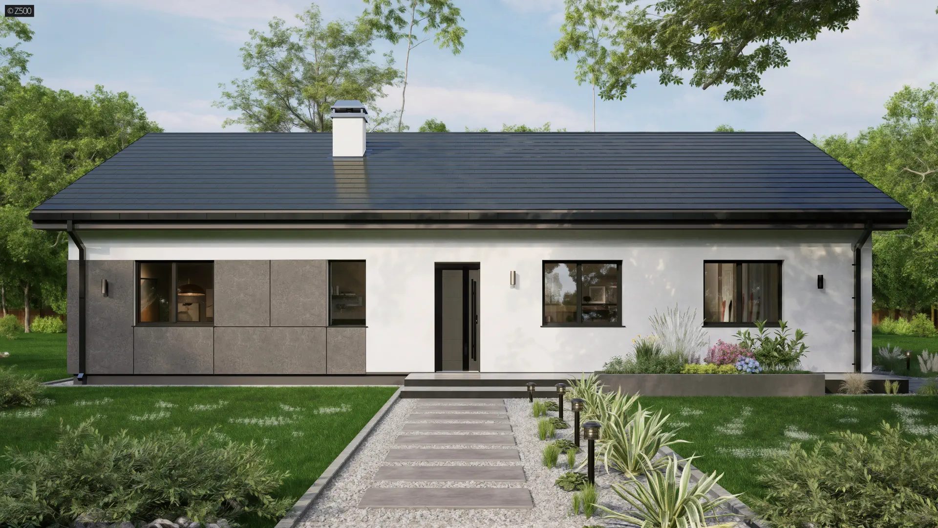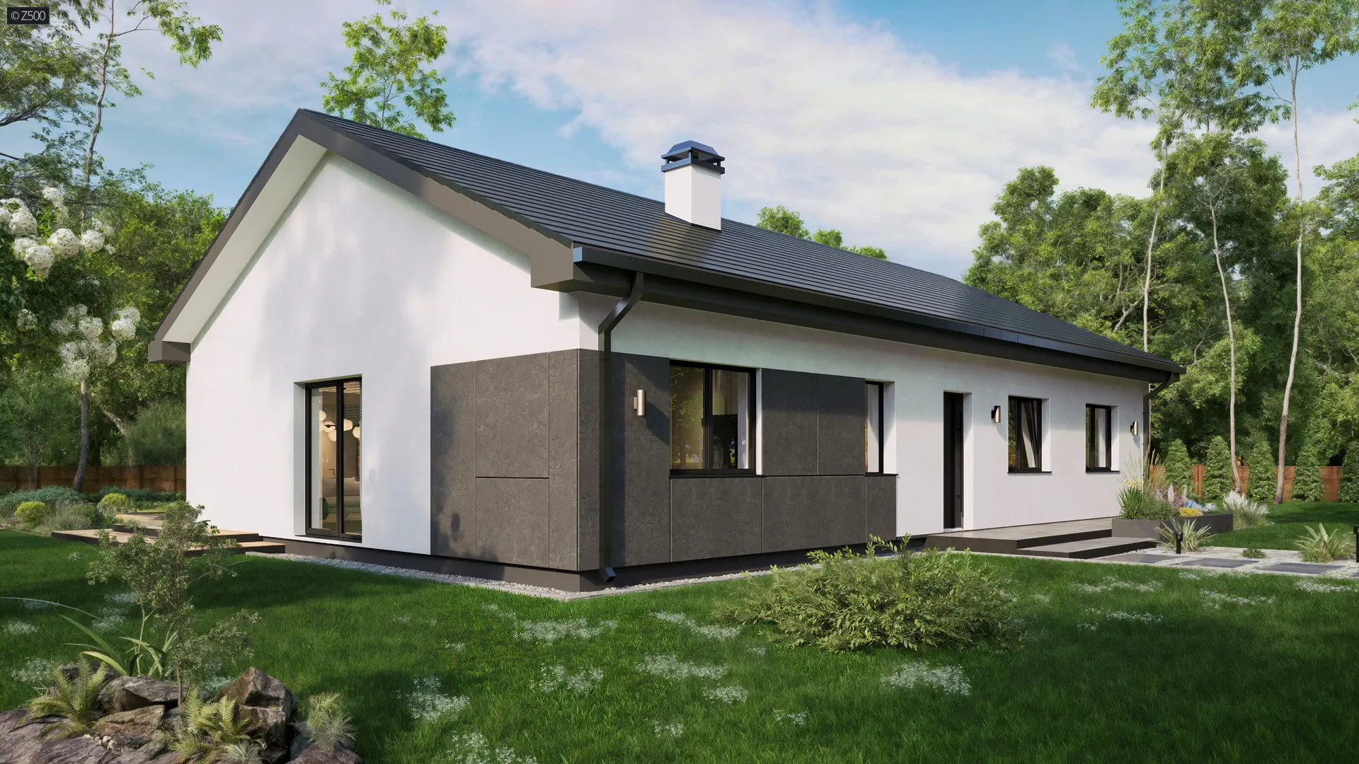 Parterowy dom z dachem dwuspadowym, wejście oraz taras umieszczono w podcieniu. Utrzymany jest w stonowanej, neutralnej kolorystyce, najbardziej uniwersalnej i modnej w ostatnim czasie. Dominują: biel oraz grafit. Do wykończenia elewacji użyto grafitowych płyt elewacyjnych, drewna oraz tynku. Od strony ogrodu wstawiono okna do samej podłogi, które jednocześnie stanowią wyjścia na taras.