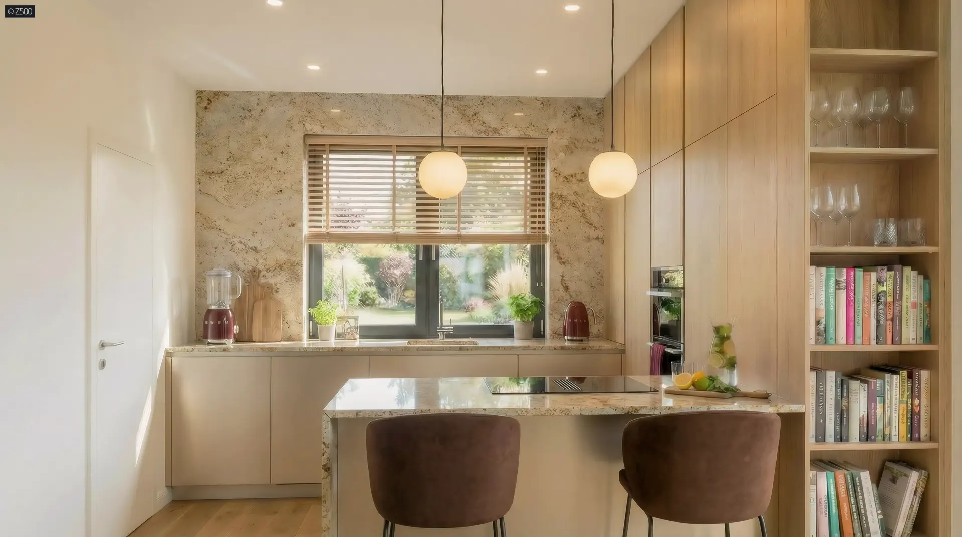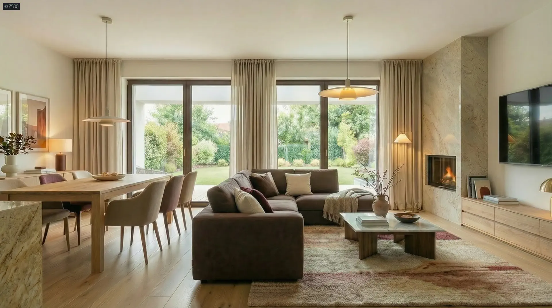 Lewa strona to dzienna część domu. Jest jasna, widna, przestronna, dodatkowo optycznie powiększona dzięki otwartemu aneksowi kuchennemu. Blaty wyprofilowane w barowym stylu oddzielają strefę kuchmistrzów od ustawnego salonu i pięknej jadalni. Przeszklenia do samej podłogi po otwarciu na oścież powiększą salon o powierzchnię tarasu, dając możliwość urządzenia wystawnego przyjęcia.
