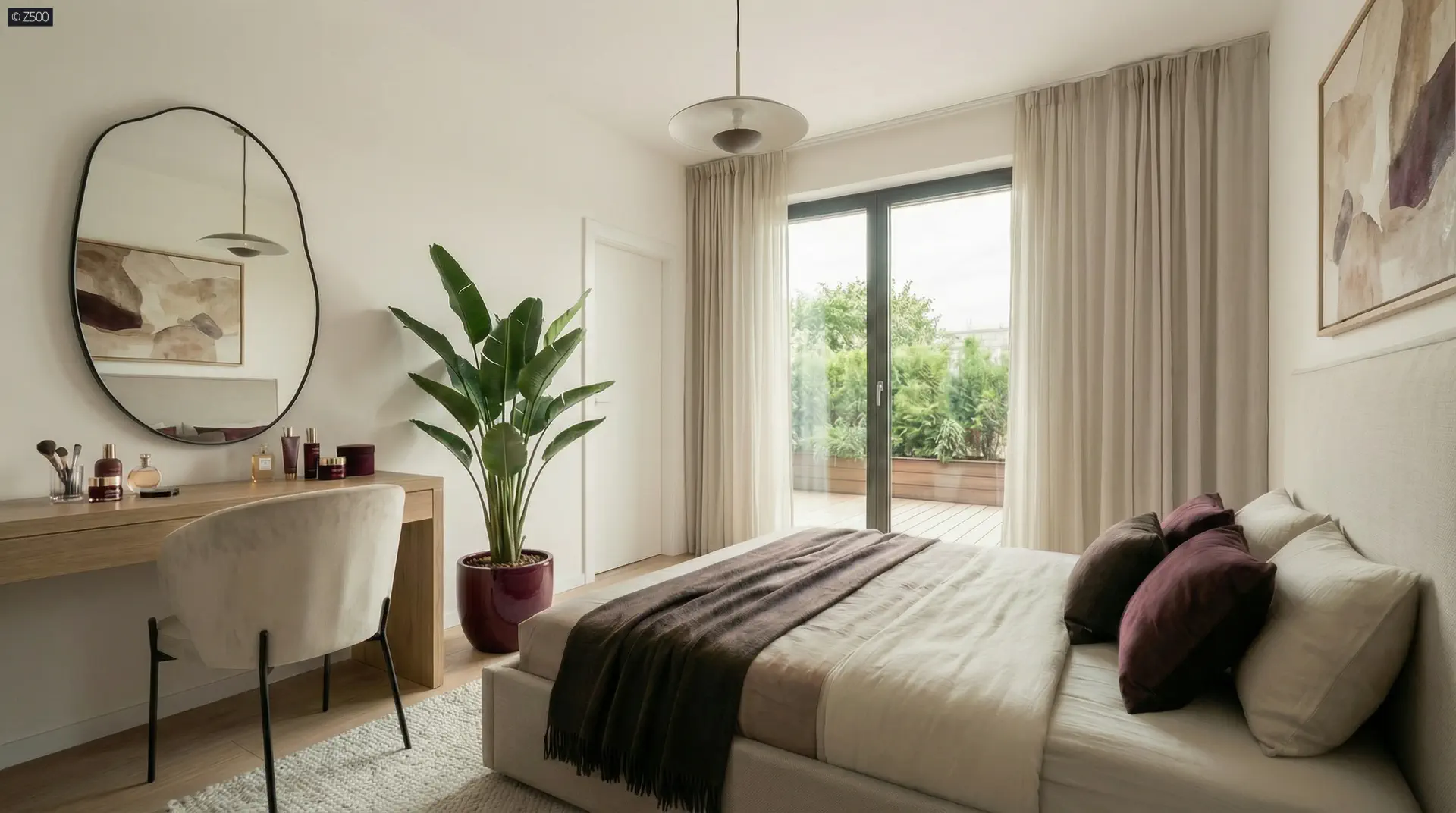 Prawa część to nocna strefa domu. Dwie sypialnie umieszczono od strony ogrodu, dwie kolejne od frontu. Te w tylnej części domu posiadają duże przeszklenia, będące jednocześnie wyjściem na taras. Pokoje te będą bardzo dobrze doświetlone. Jeden z nich może być sypialnią rodziców, ponieważ posiada prywatną garderobę.