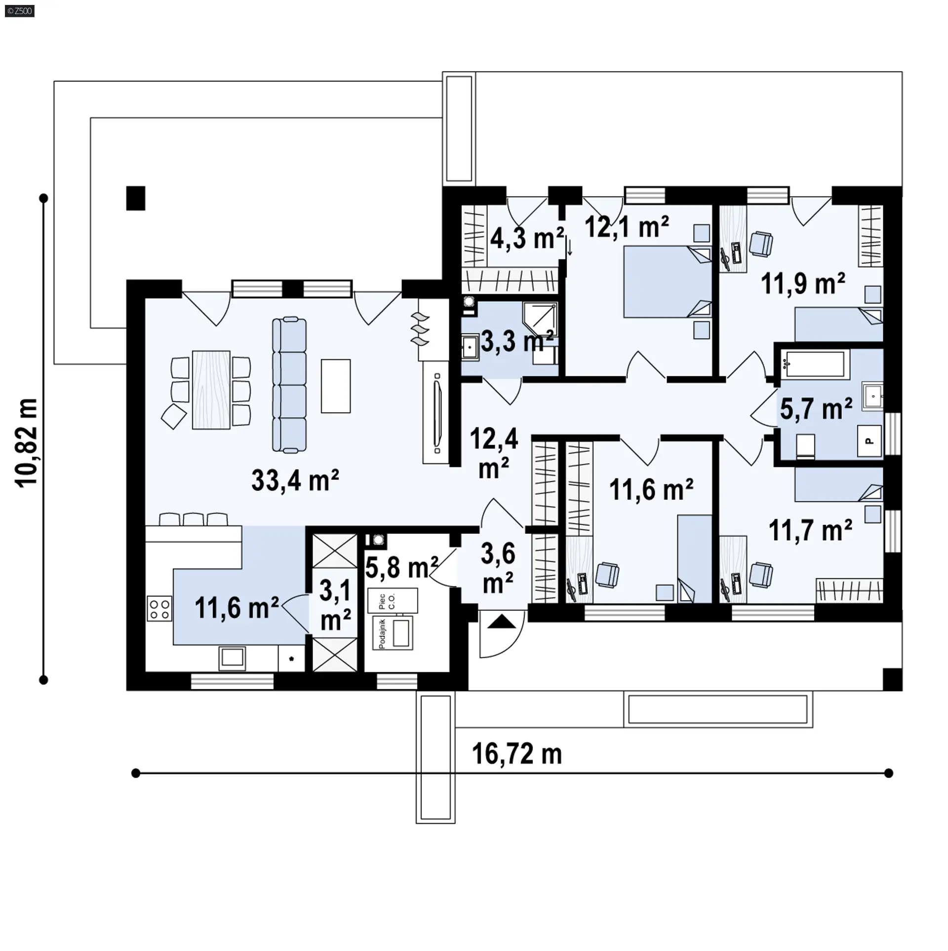 4 sypialnie w parterowym domu z dachem dwuspadowym o niewielkiej powierzchni to rzadkość. Budynek jest jednocześnie niedrogi w budowie. Dedykowany jest dla osób, które na niewielkiej powierzchni pragną mieć 4 niezależne pokoje.