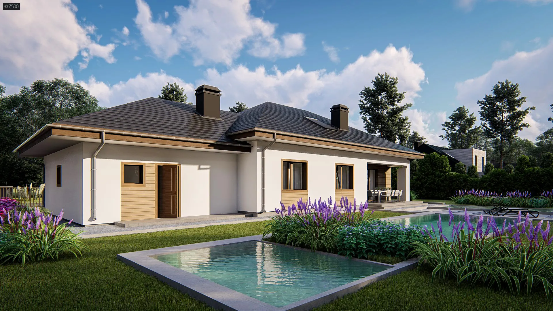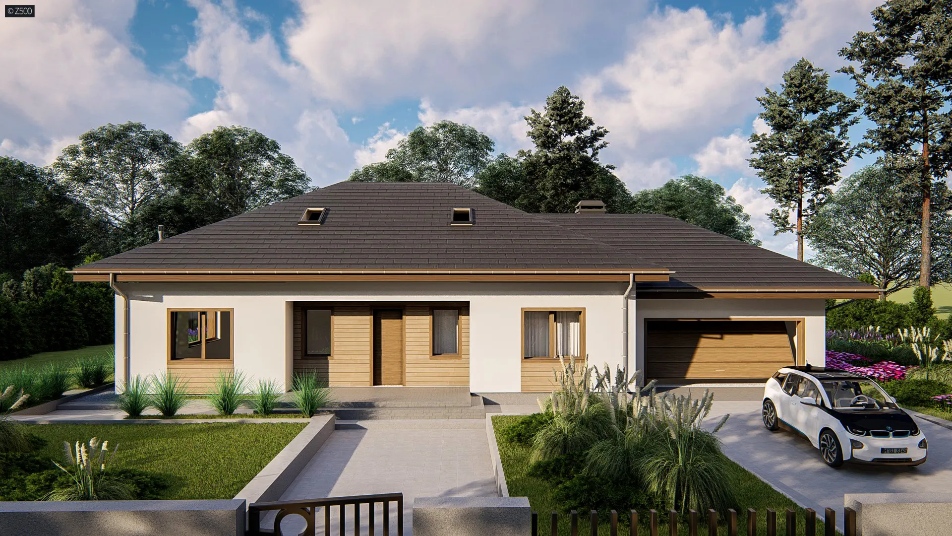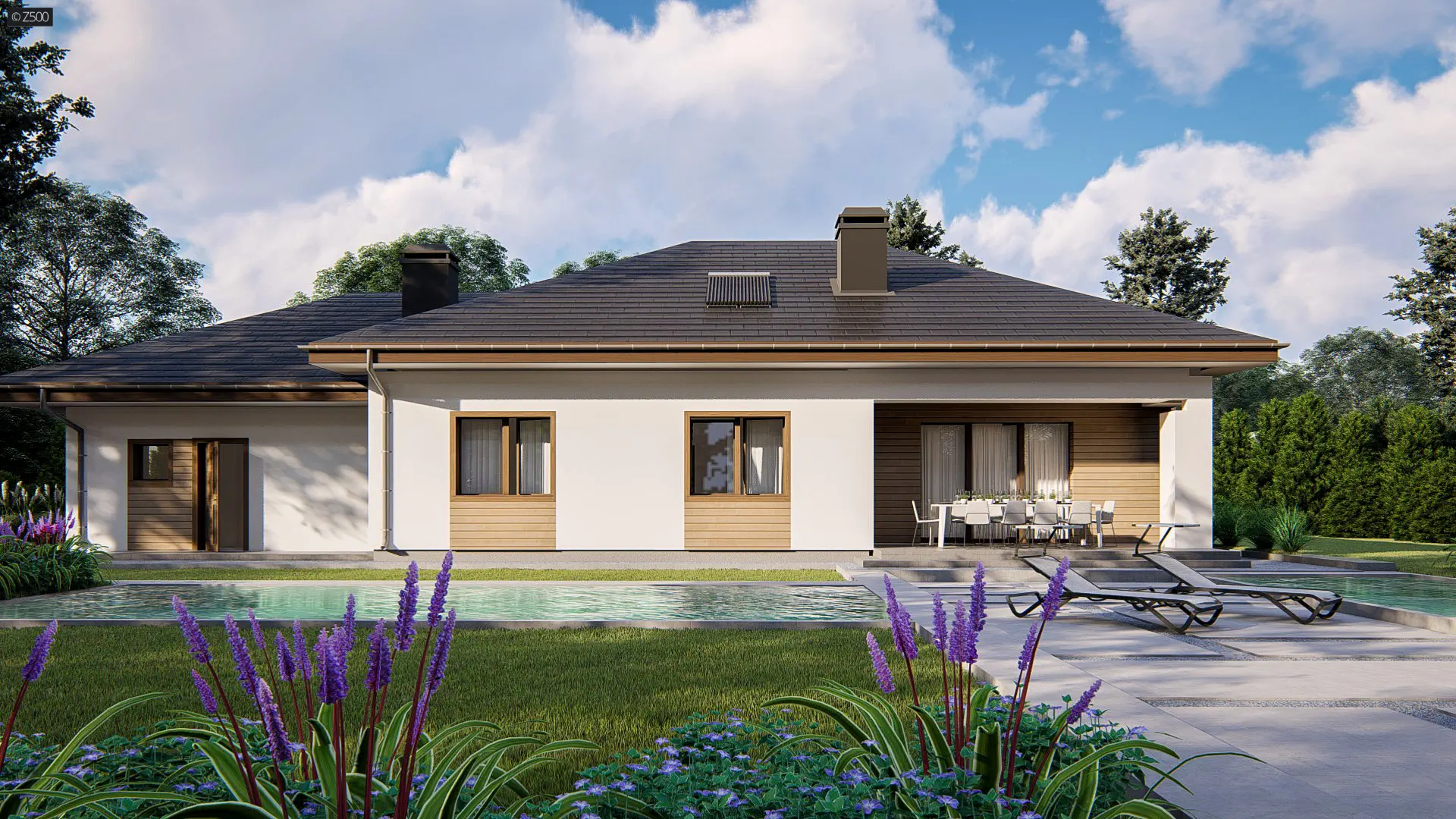 Projekt domu Z35 to funkcjonalny i komfortowy projekt domu parterowego o nowoczesnej bryle i subtelnych detalach architektonicznych, który idealnie wpisuje się w potrzeby zarówno rodzin z dziećmi, jak i seniorów. Prosty, elegancki kształt budynku został wzbogacony o gustowną elewację, łączącą jasny tynk z elementami drewna i kamienia, co nadaje całości ponadczasowego charakteru i doskonale komponuje się z otoczeniem ogrodu.