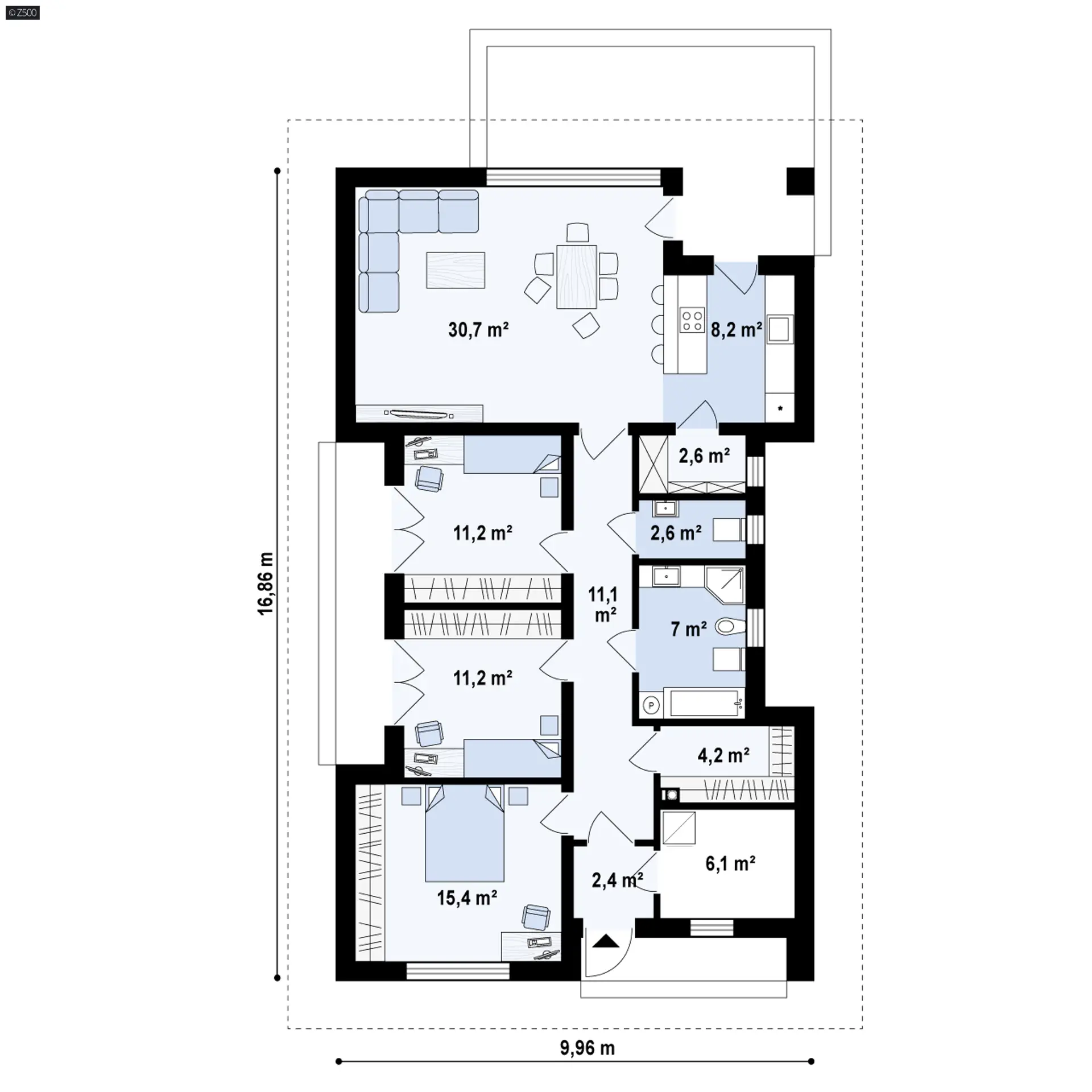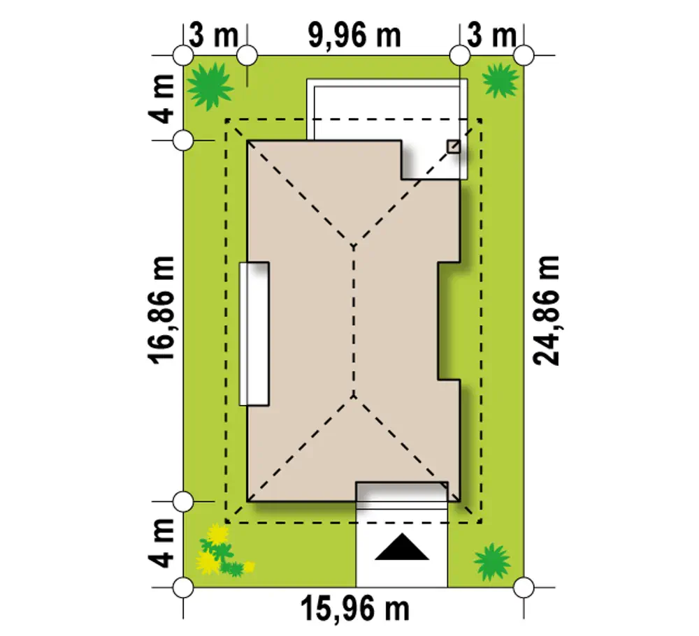 Z354 to nowoczesny, parterowy dom z dachem czterospadowym, którego prosta, surowa stylistyka przykuje uwagę niejednego sąsiada czy przechodnia. Projekt idealnie nadaje się do zabudowy na wąską działkę.