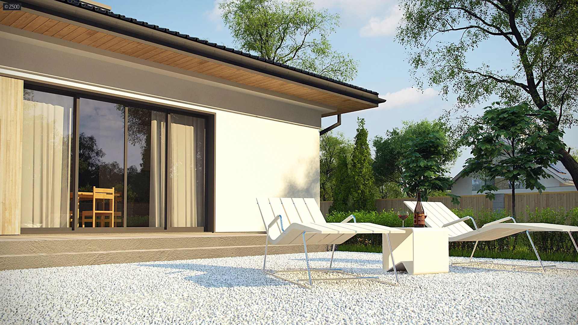 Oryginalności nadaje budynkowi biel tynku połączona z wysokogatunkowymi drewnianymi panelami. Szczyptę niekonwencjonalnego smaku dodał gzyms, który umieszczono pod krawędzią dachu, co stanowi subtelny element dekoracyjny.