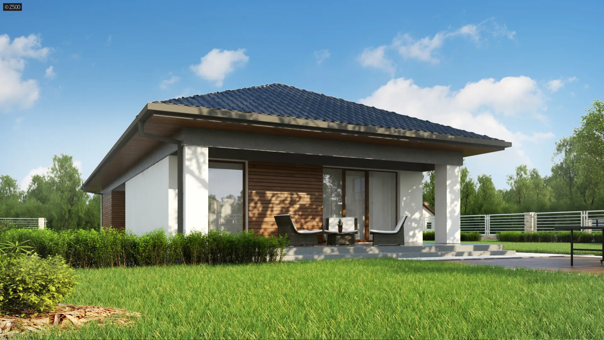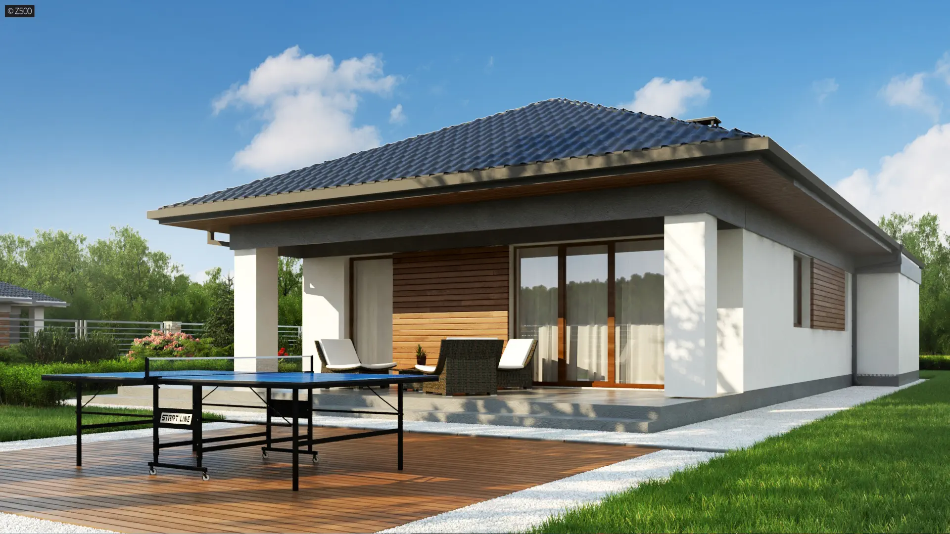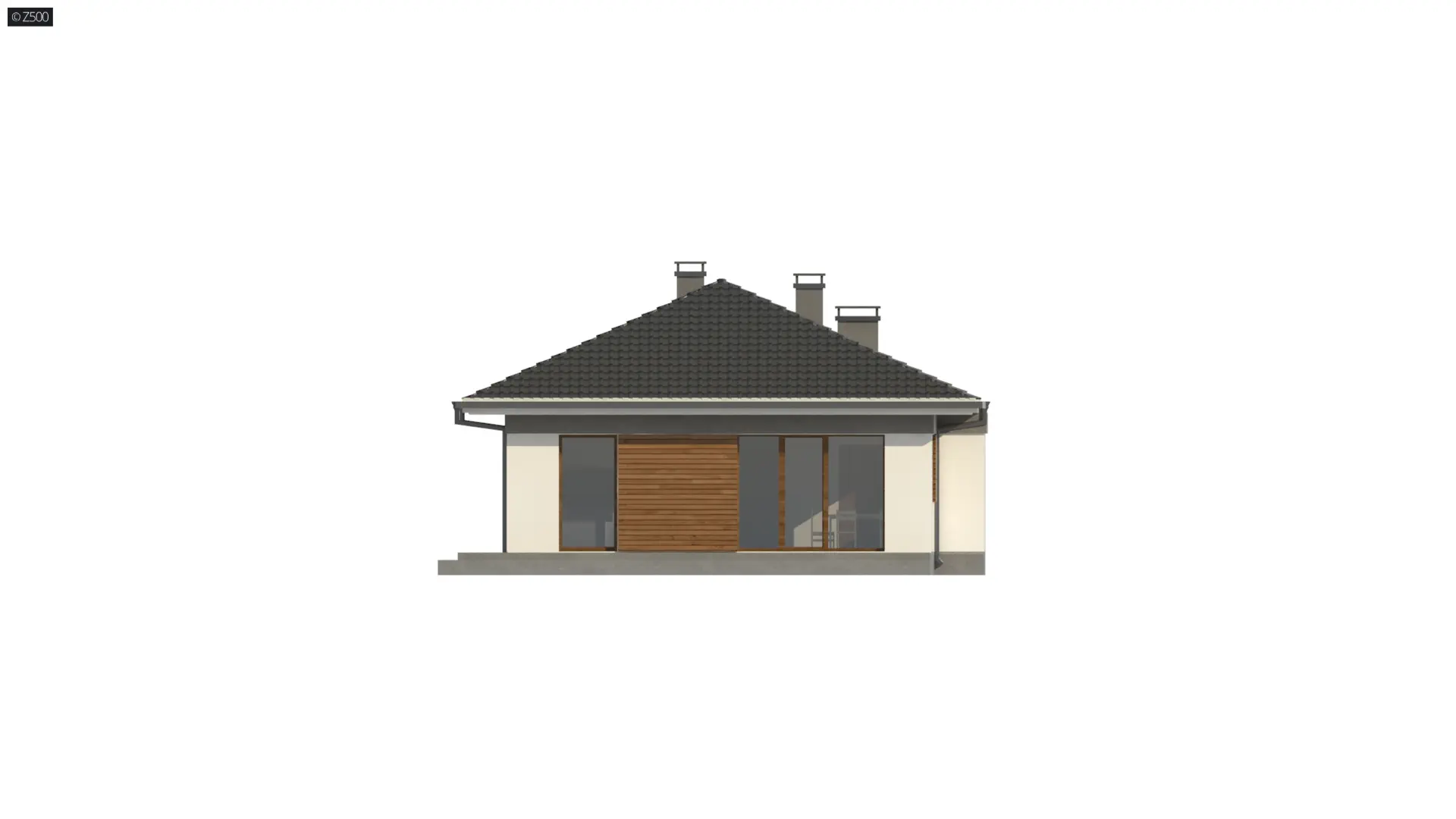 Projekt domu wykreowany specjalnie z myślą o wąskiej działce do szerokości 16m. Elewacja budynku została wykonana z dozą prostoty i minimalizmu, o czym świadczy ozdobne połączenie białego tynku i drewna. Architekci, dzięki odpowiedniemu rozplanowaniu układu funkcjonalnego rozmieścili w budynku część dzienną i nocną domu.