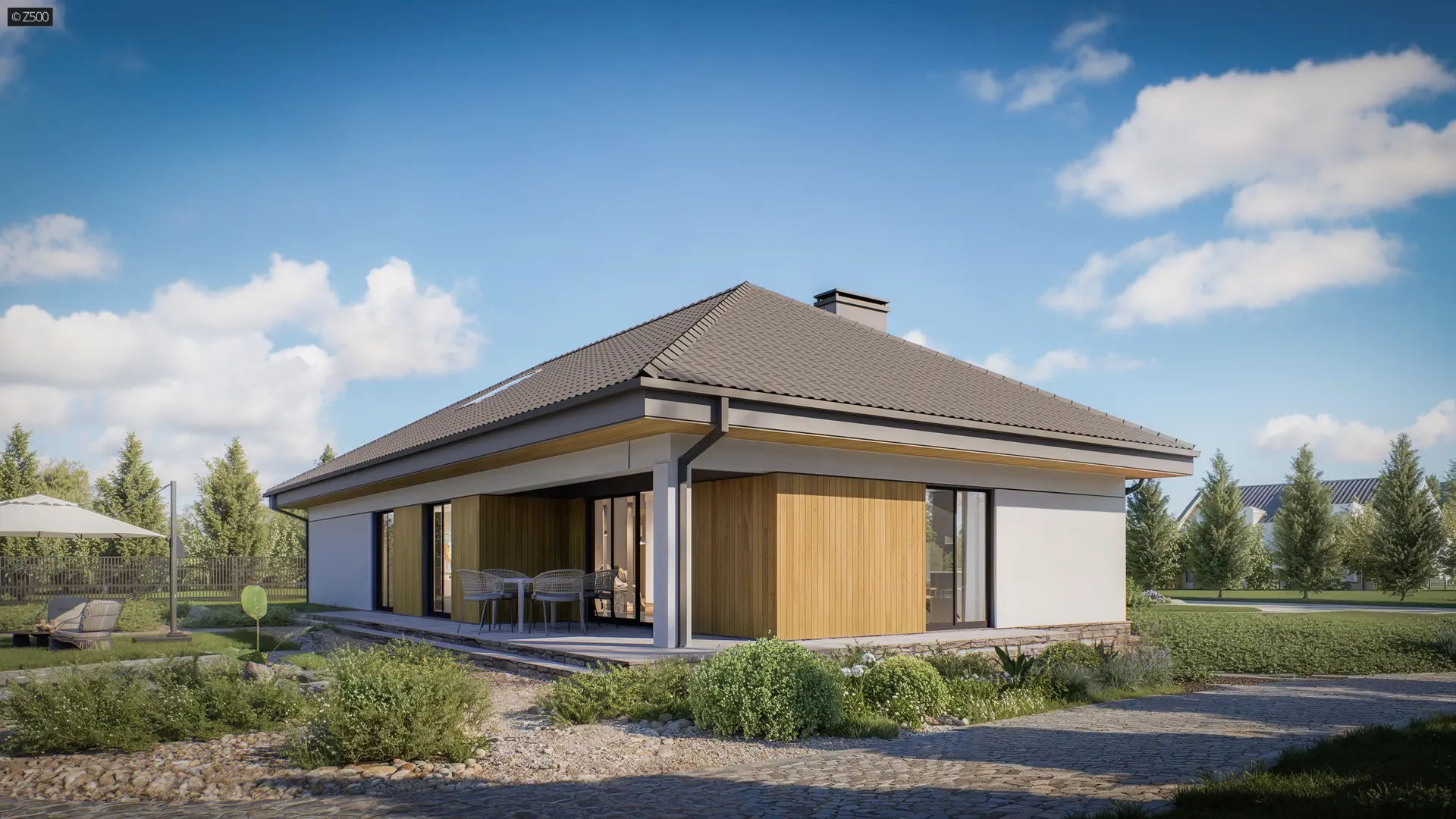 Z368 D GP + 30 to propozycja nowoczesnego domu parterowego z garażem jednostanowiskowym i z dachem kopertowym, wykończonego białym tynkiem z dodatkiem boniowania i drewnianymi panelami lub okładziną drewnopodobną.