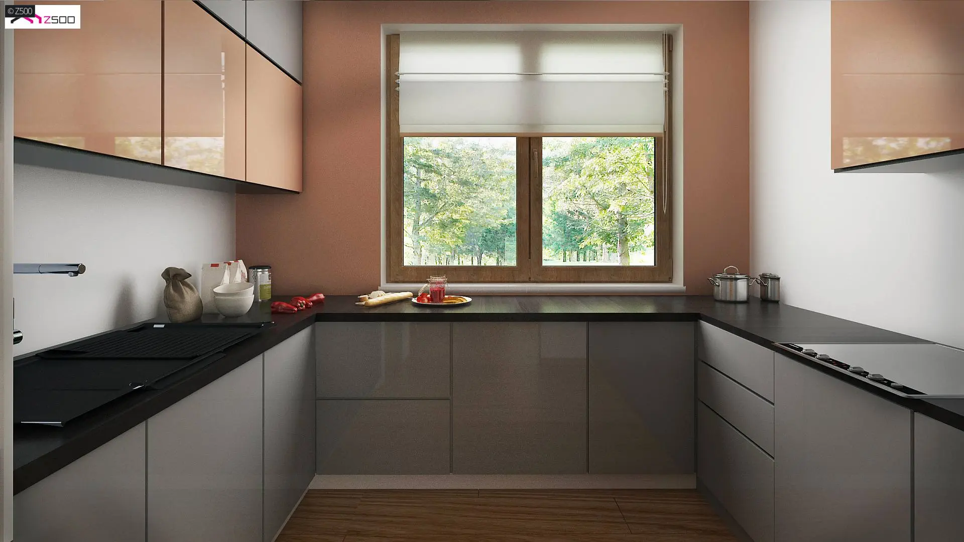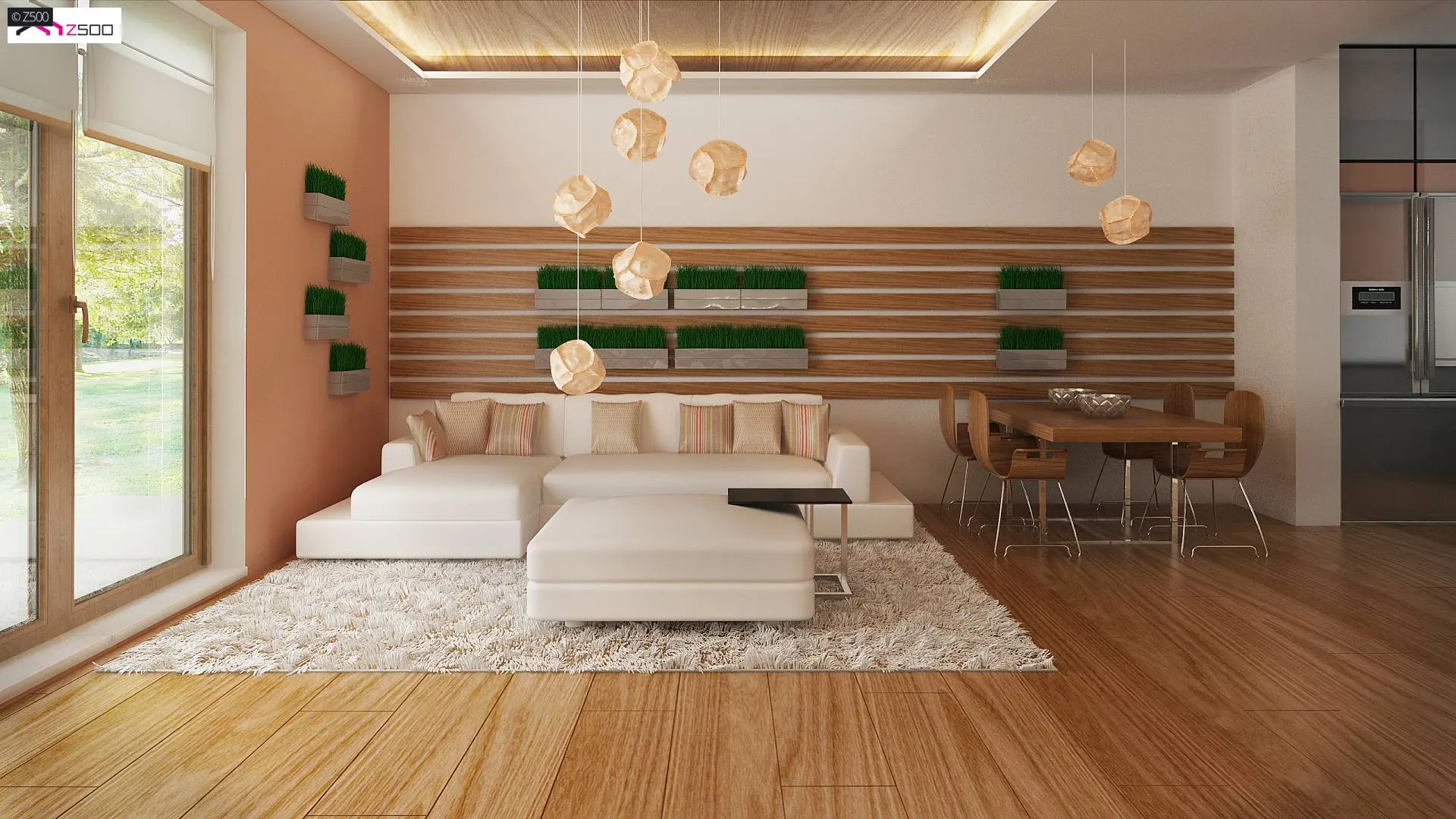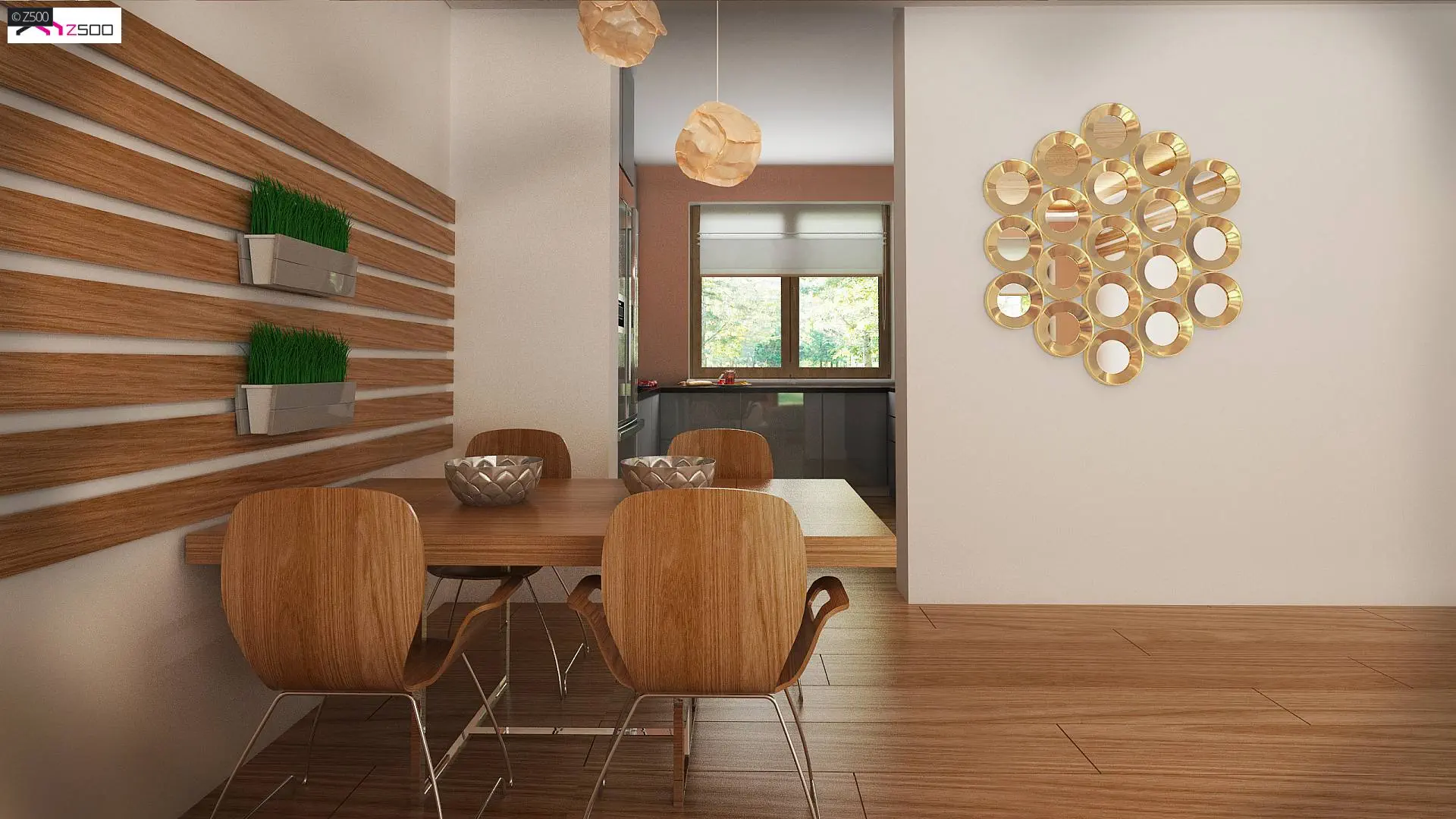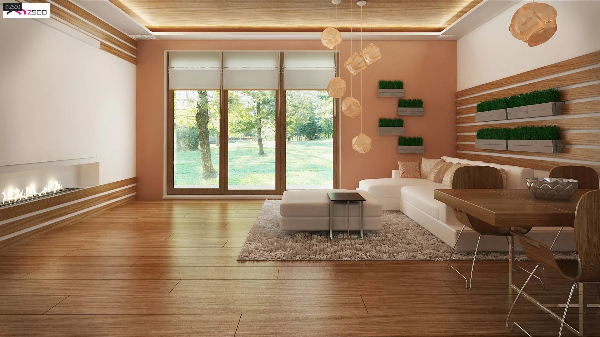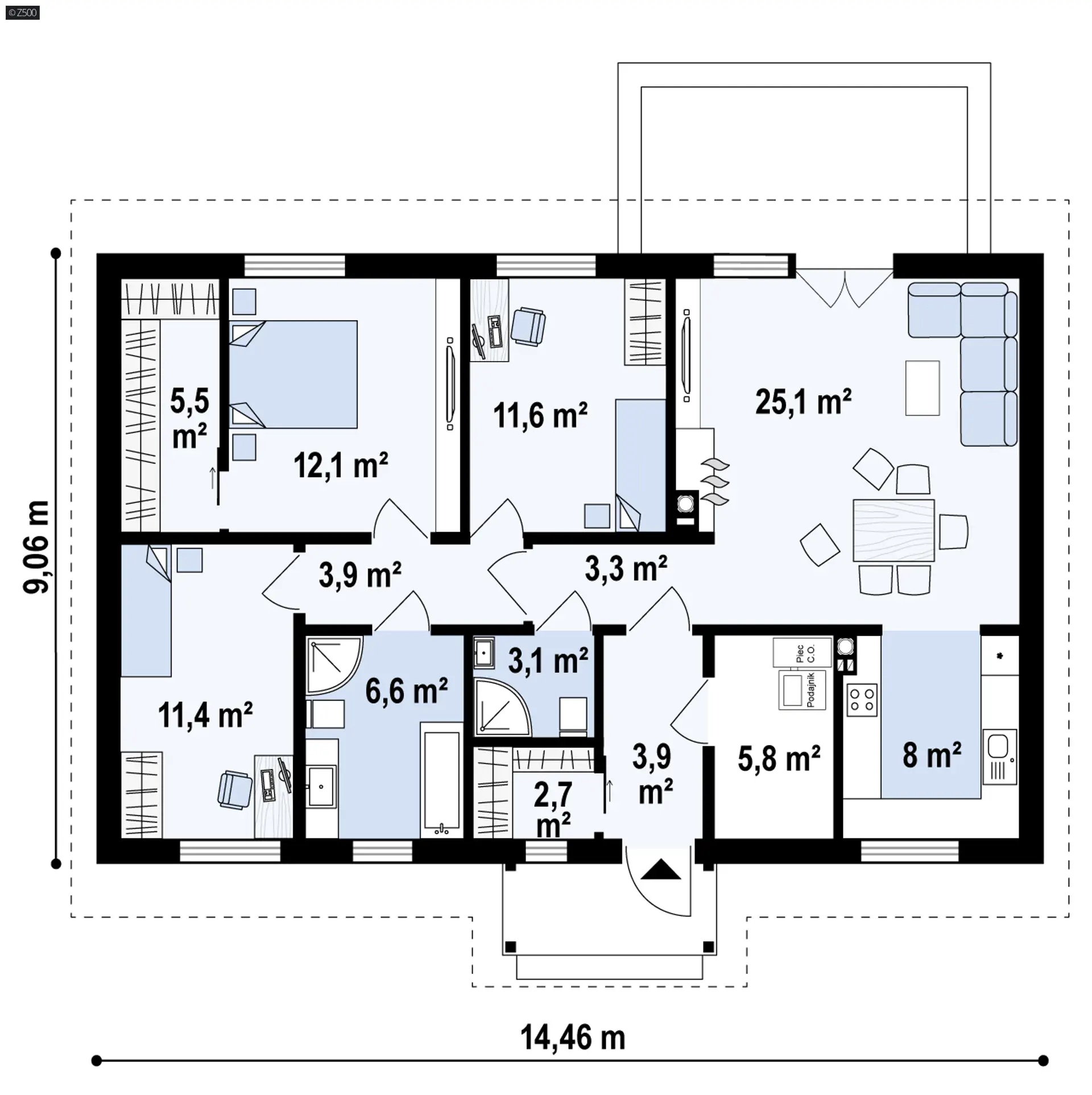 Z prawej strony zaprojektowano reprezentacyjny salon z jadalnią. Rozświetla go przeszklona ściana przesuwna i wyjście na taras, które latem stanowią przedłużenie salonu. Grillowanie i spotkania z przyjaciółmi będą prawdziwą przyjemnością. Otwarty na salon aneks kuchenny optycznie powiększa przestrzeń, a pomieszczenie gospodarcze połączono ze spiżarnią aby użytkowanie pomieszczenia stało się bardziej praktyczne.