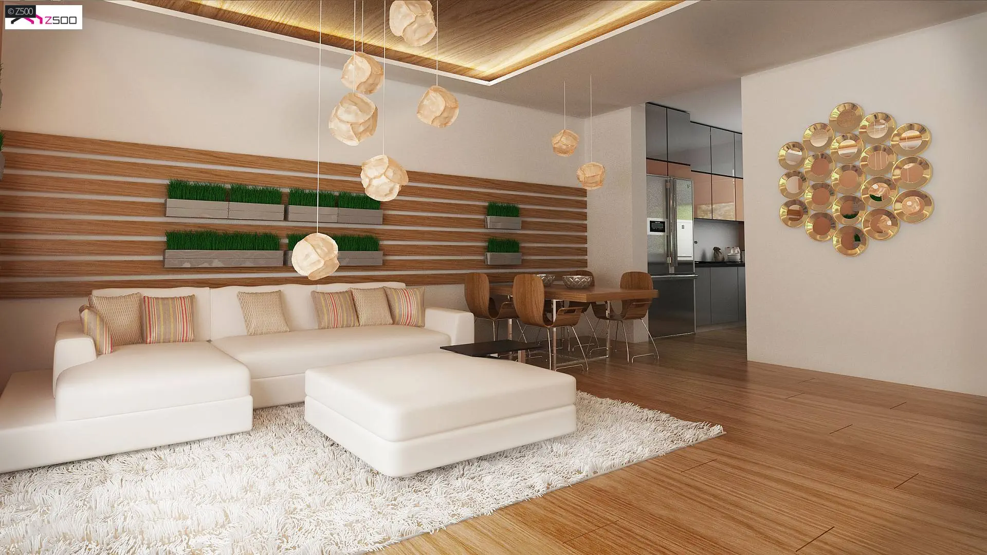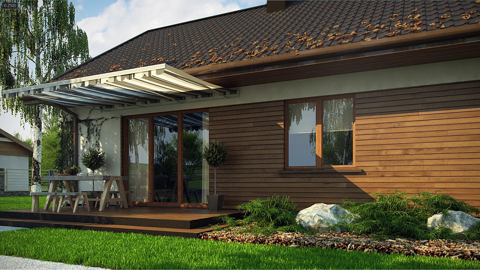 Elewację ozdobiono białym tynkiem połączonym z drewnianymi panelami.