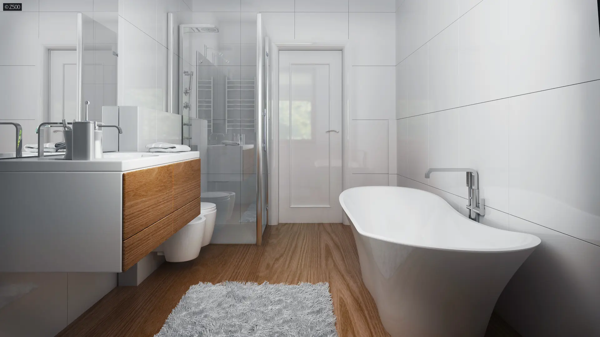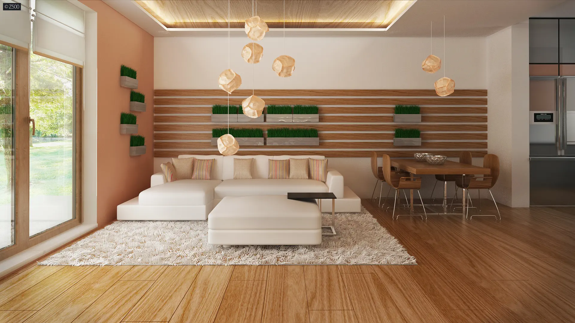Elewację ozdobiono białym tynkiem połączonym z drewnianymi panelami.