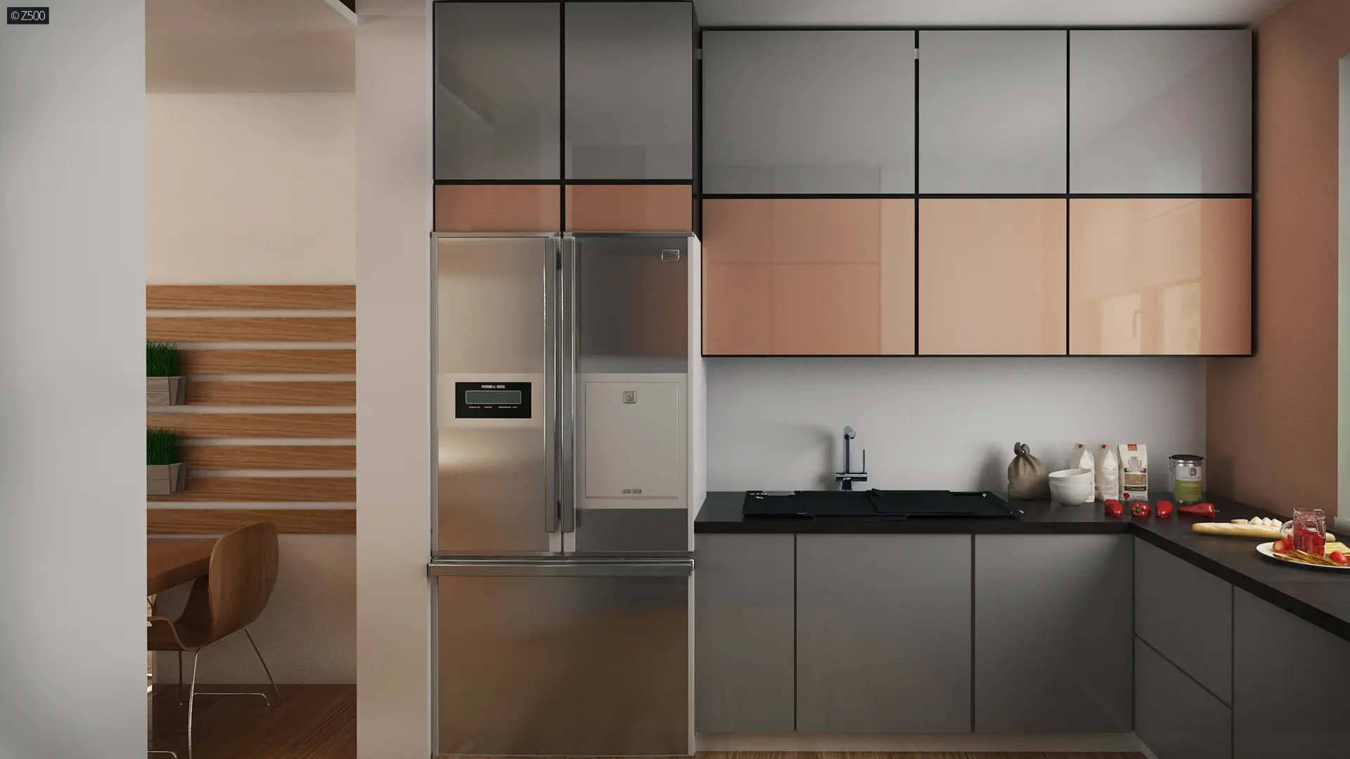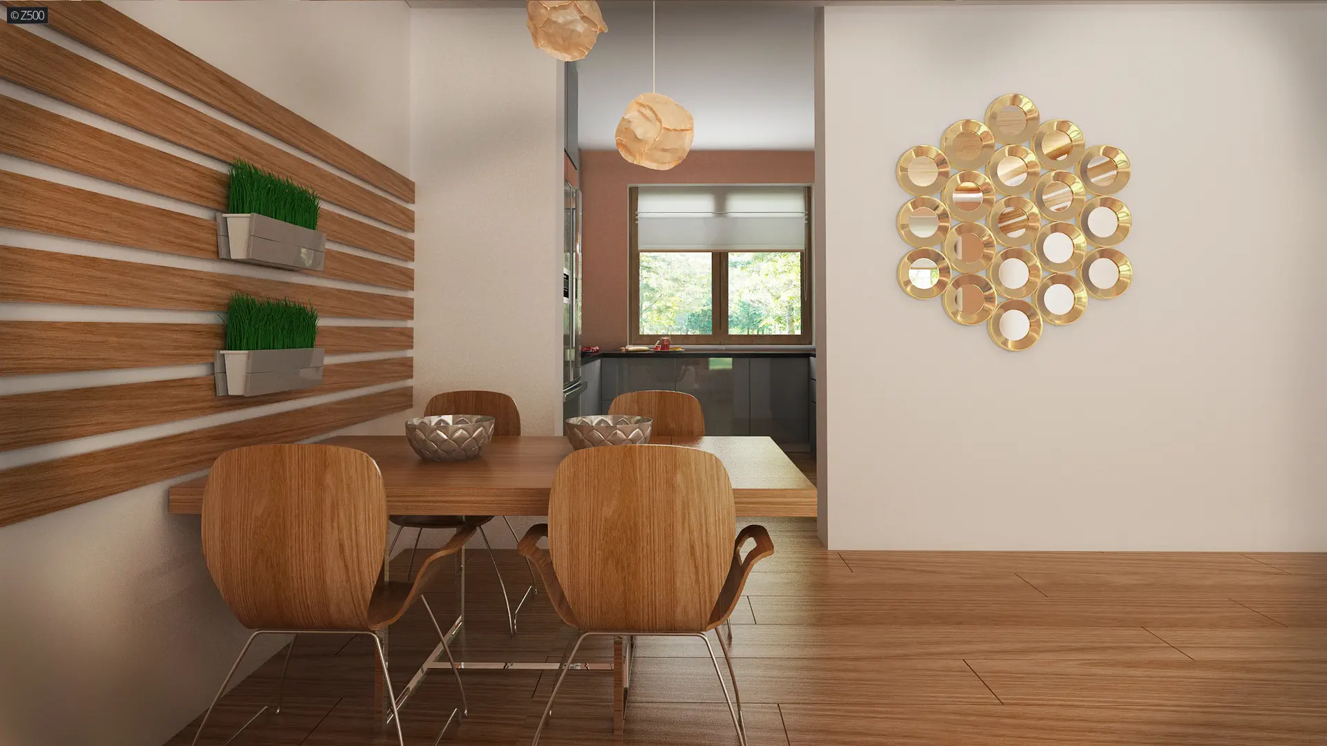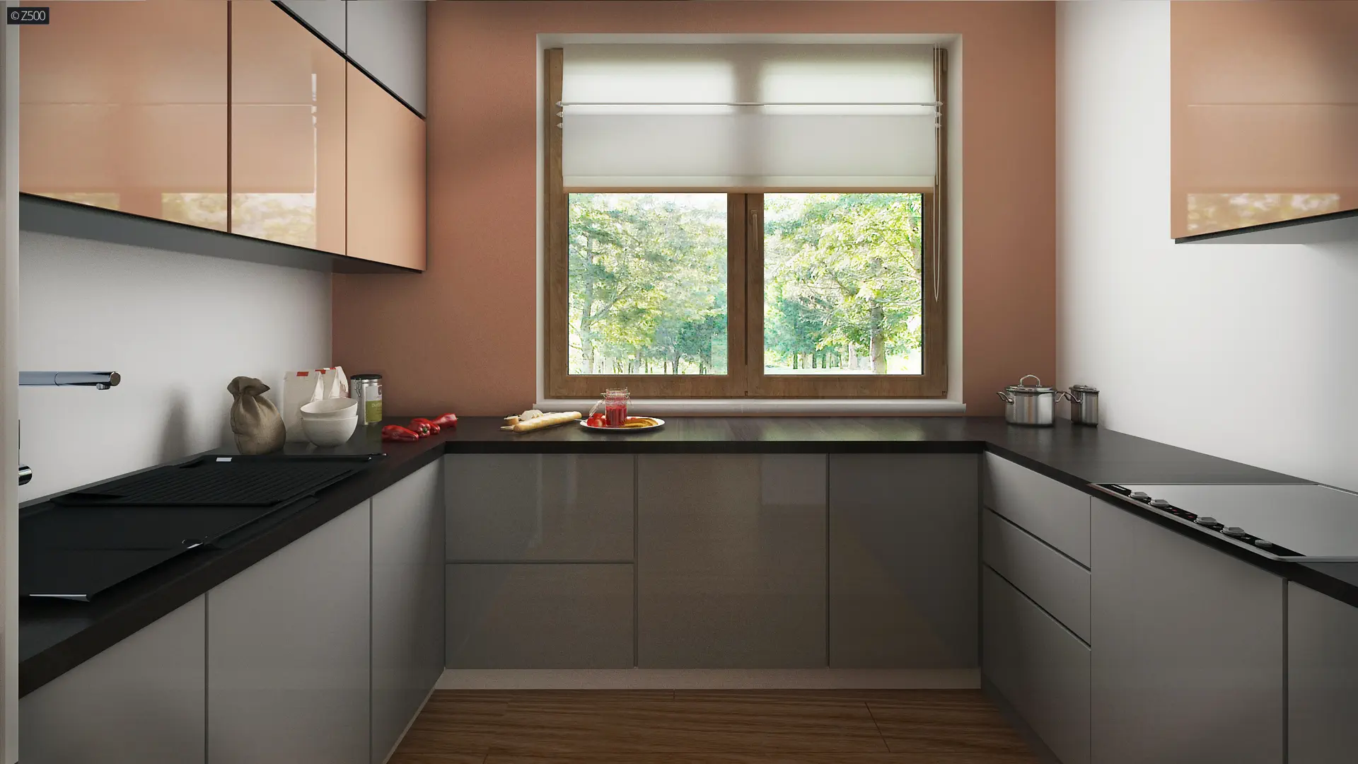 Z prawej strony zaprojektowano reprezentacyjny salon z jadalnią. Rozświetla go przeszklona ściana przesuwna i wyjście na taras, które latem stanowią przedłużenie salonu. Grillowanie i spotkania z przyjaciółmi będą prawdziwą przyjemnością. Otwarty na salon aneks kuchenny optycznie powiększa przestrzeń, a pomieszczenie gospodarcze połączono ze spiżarnią aby użytkowanie pomieszczenia stało się bardziej praktyczne.