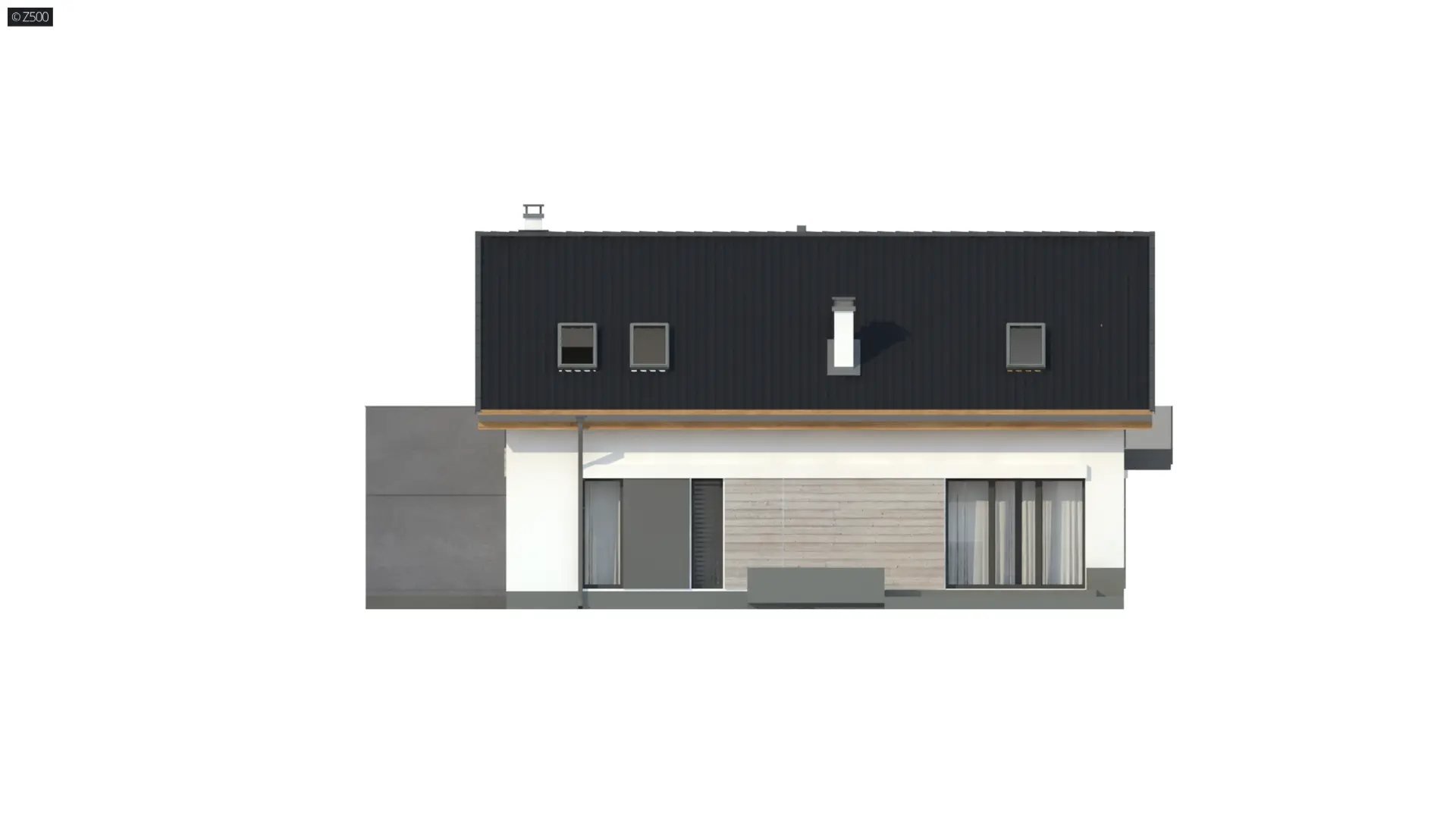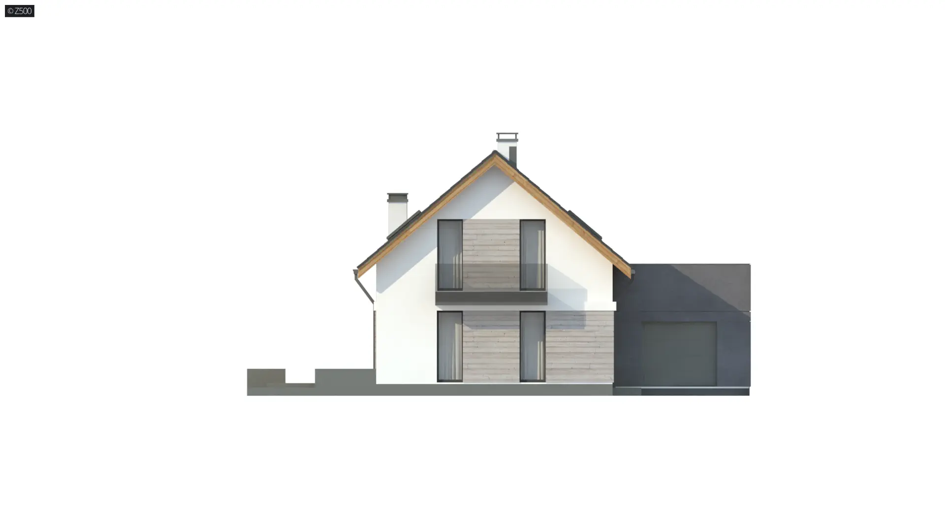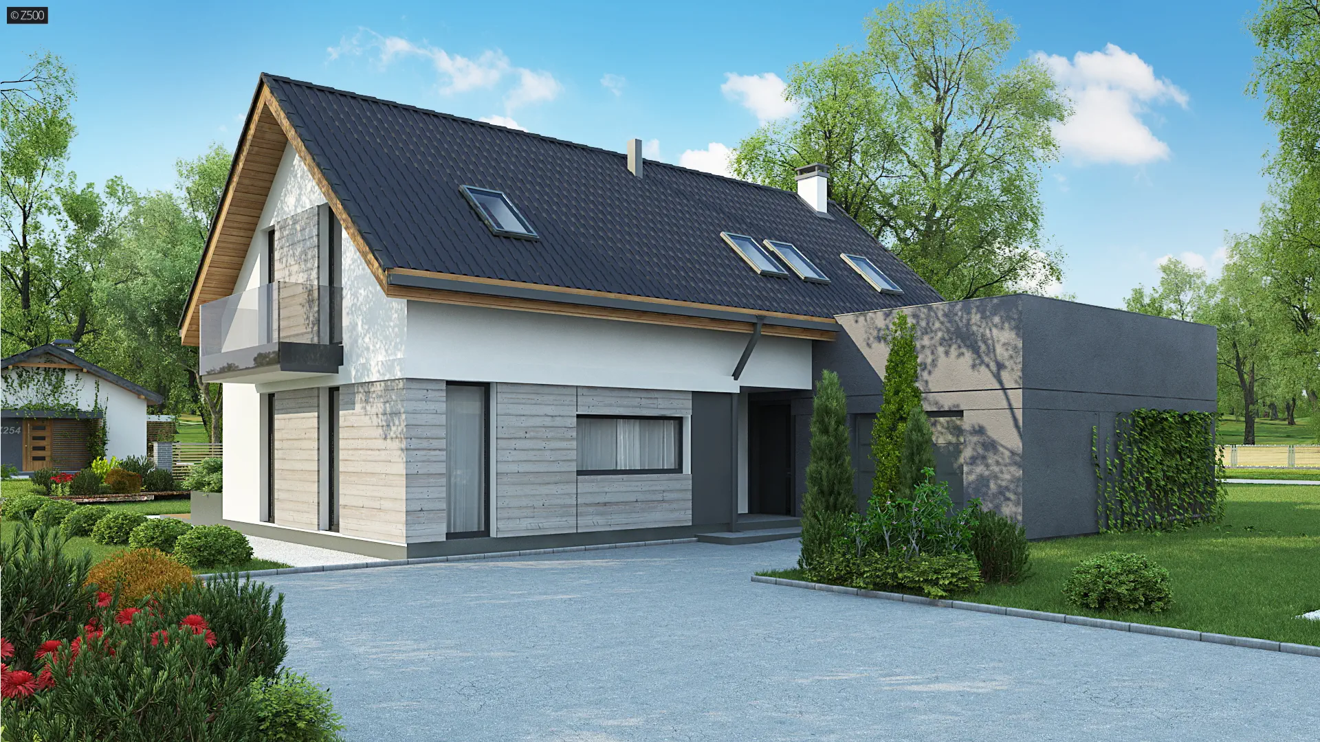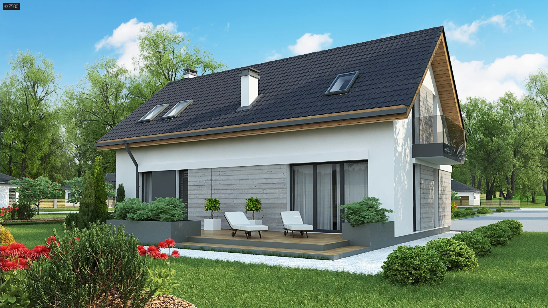 Połączenie śnieżnobiałego tynku, szarości i ozdobnych paneli drewnianych składa się na wykończenie elewacji. Okna dachowe na poddaszu użytkowym rozmieszczono w ten sposób, aby jak najbardziej doświetlały wnętrza i nadawały im przytulności.