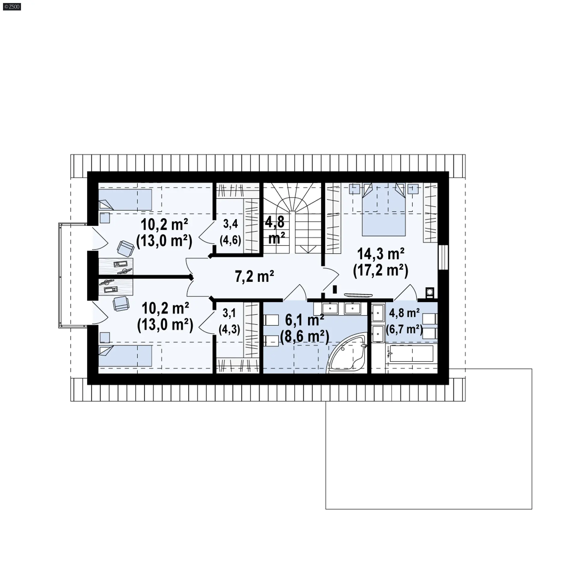 Piętro to nasze prywatne królestwo. Mieści się tutaj sypialnia rodziców z przylegającą do niej osobistą łazienką. Dwie umywalki to atut, na który warto sobie pozwolić ze względów wygody. Dzięki temu każdy z małżonków będzie mógł korzystać z umywalki w tym samym czasie. Pozostałe dwie sypialnie, mogące być również pokojami dla dzieci, posiadają swoje garderoby, co docenią szczególnie dorastające córki. Na oba pokoje przypada kolejna łazienka, oddzielna od łazienki rodziców, dzięki czemu unikniemy „kosmetycznych korków” i „okupacji” którejkolwiek z łazienek. Obydwie sypialnie mają wyjście na balkon. Dzięki temu można będzie wygodnie wietrzyć pościel, wieszać pranie lub swobodnie korzystać z kąpieli słonecznych.