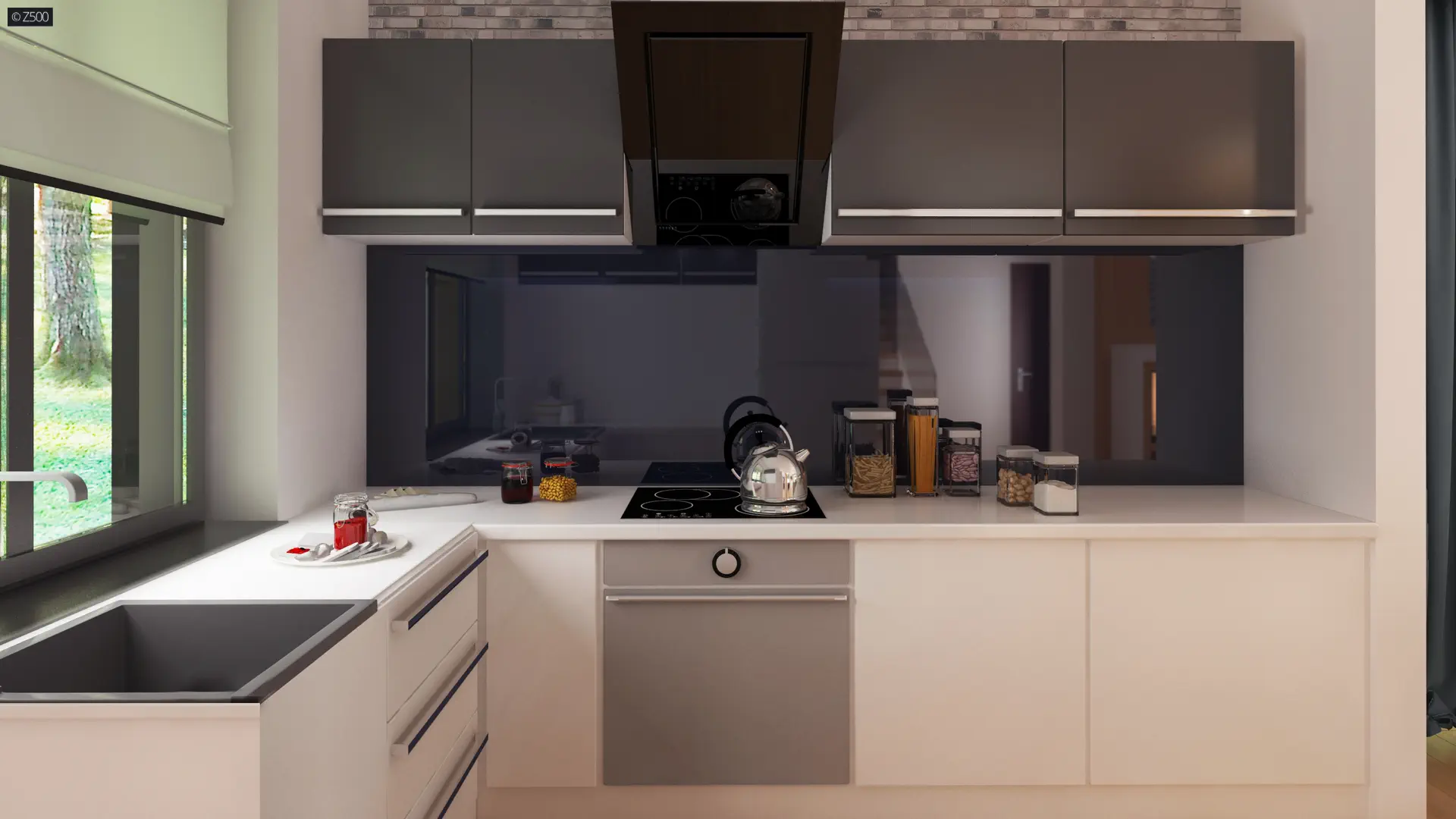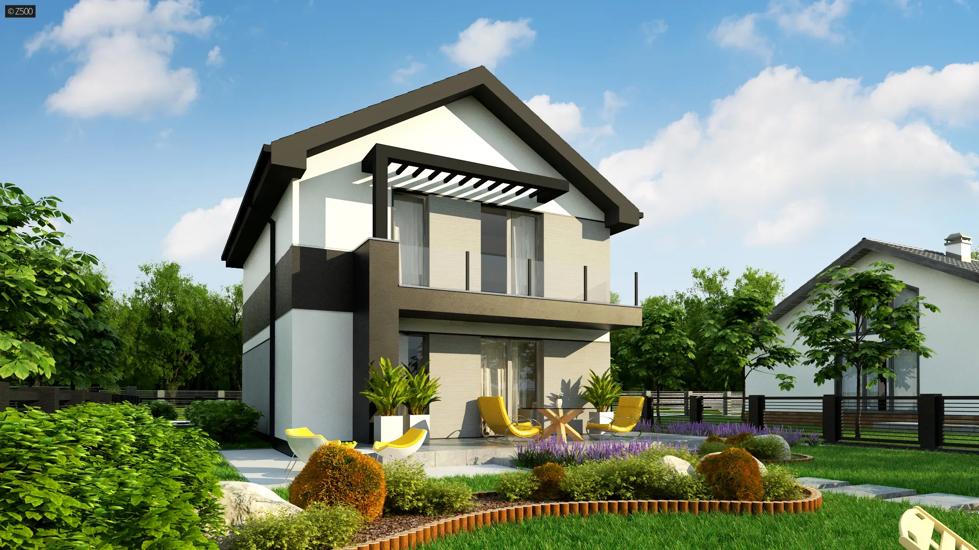 Z372 to mały, zgrabny, klasyczny z nowoczesnymi przeszkleniami dom o powierzchni 105 m2. z dachem dwuspadowym, prostopadłą do drogi kalenicą, zadaszonym tarasem i stonowaną kolorystyką elewacji. Dominują biel, grafit oraz szarości. Dzięki niedużej powierzchni znakomicie nadaje się na projekt dla młodych małżeństw. Idealnie wpasuje się na wąską działkę. Jedna z elewacji nie posiada przeszkleń, dzięki czemu możemy pobudować opisywany dom w odległości już 3 m. z jednej strony od granicy działki sąsiada.