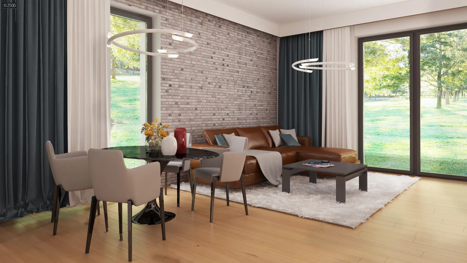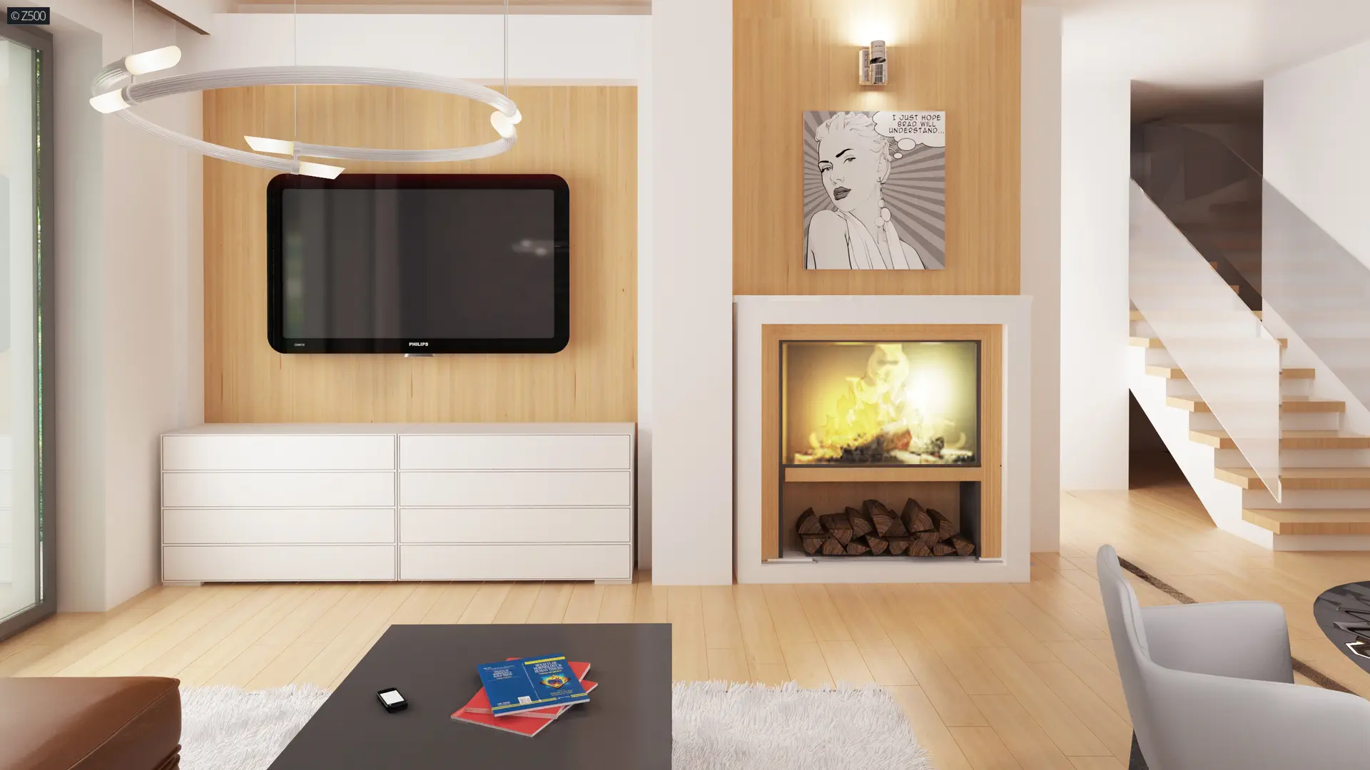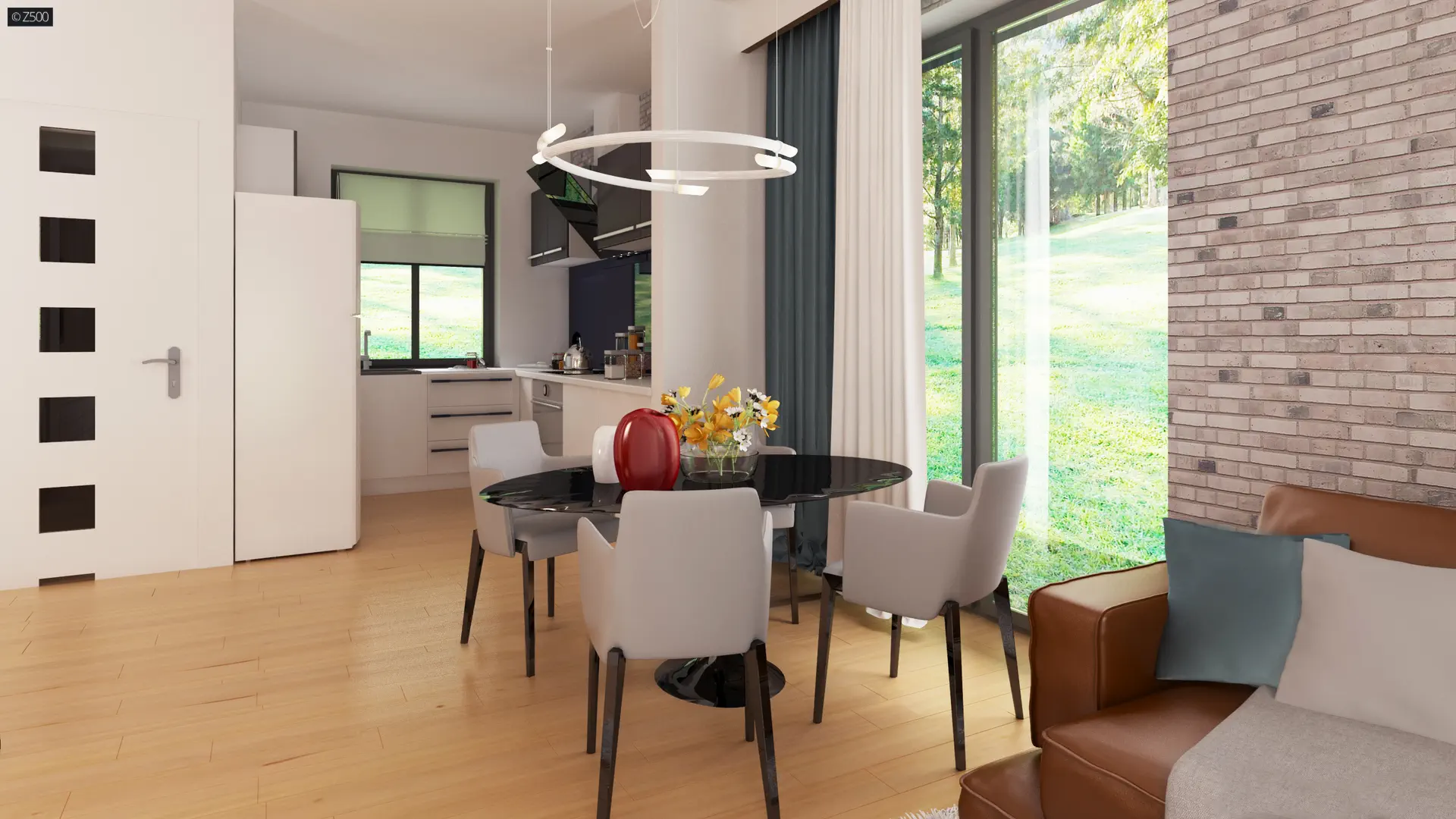 Umieszczona od frontu kuchnia może zostać odgrodzona ścianką działową od salonu i jadalni, jednak wówczas zmniejszy się otwarta przestrzeń strefy dziennej. W dalszym ciągu pozostanie możliwość obserwowania podjazdu i odwiedzających nas gości. Centralnie umieszczony kominek jest świetnie widoczny z każdego miejsca ustawnego salonu. Duże przeszklenia doskonale doświetlają wnętrze pomieszczenia z dwóch stron, a dodatkowo stanowią wyjścia na taras, do strefy wypoczynku.
