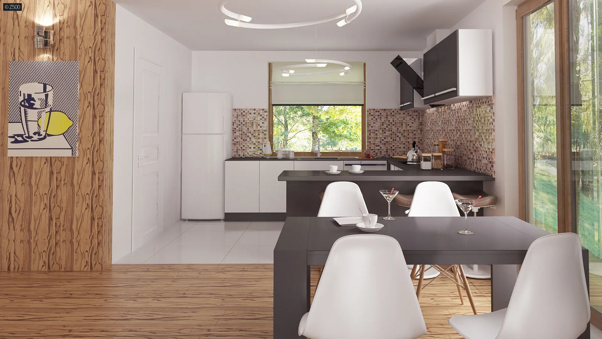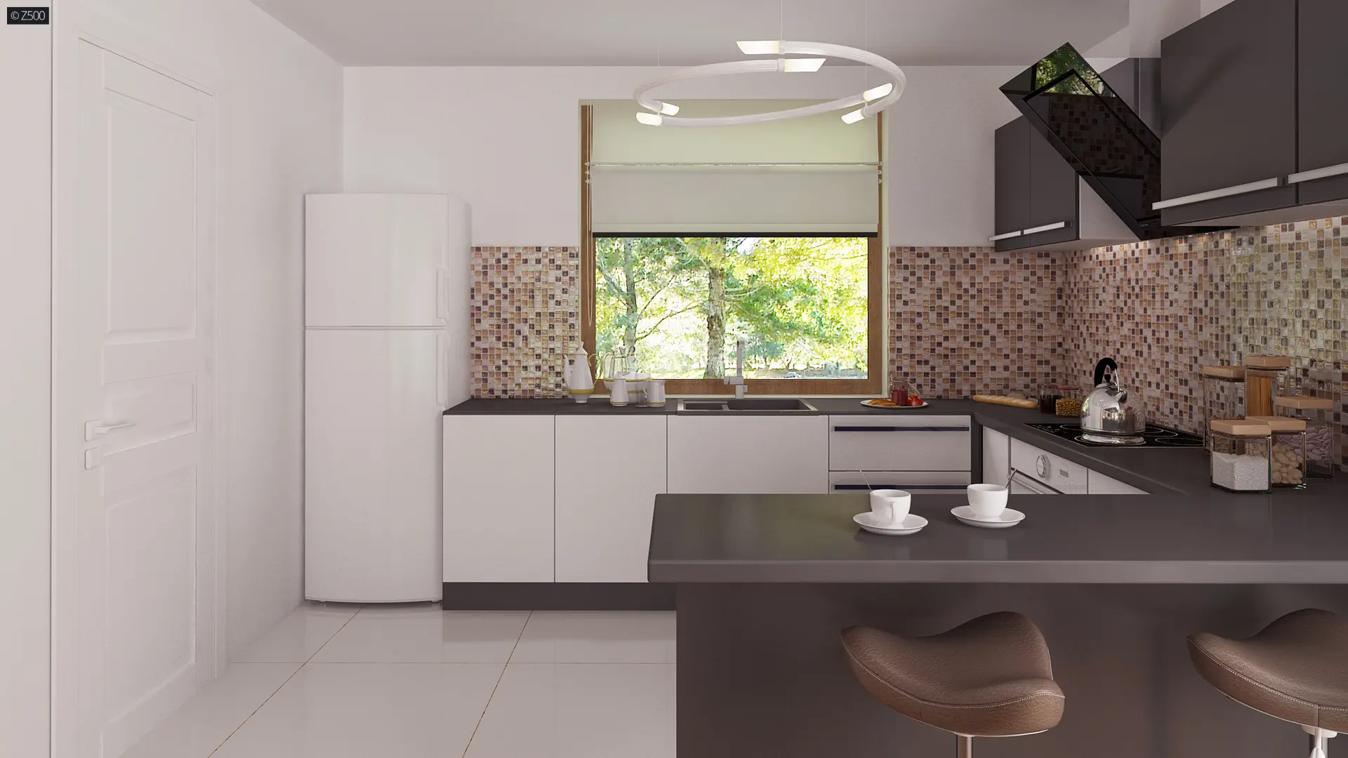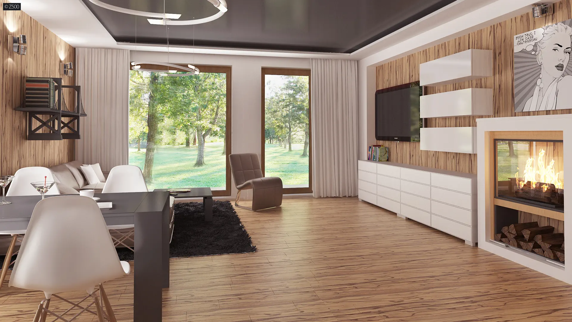 Na wykończenie elewacji składa się ciepła okładzina drewniana, oraz tynk w kolorach białym i grafitowym.