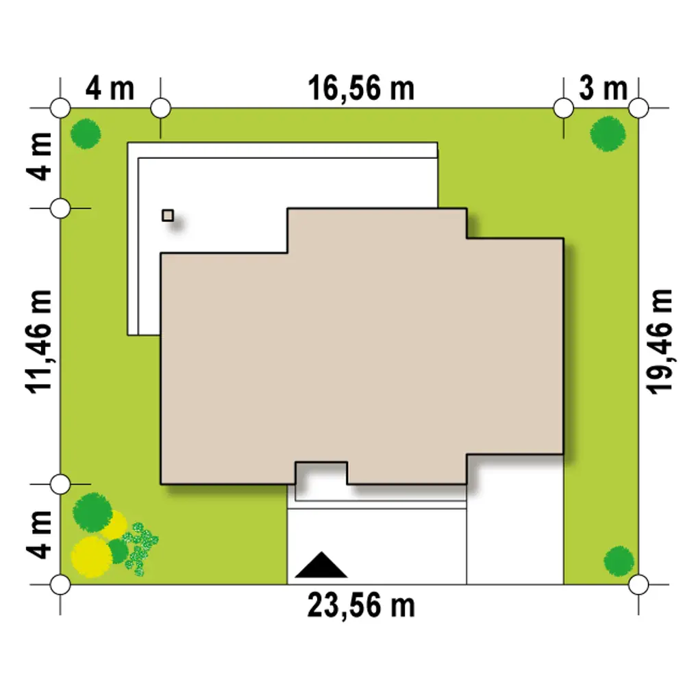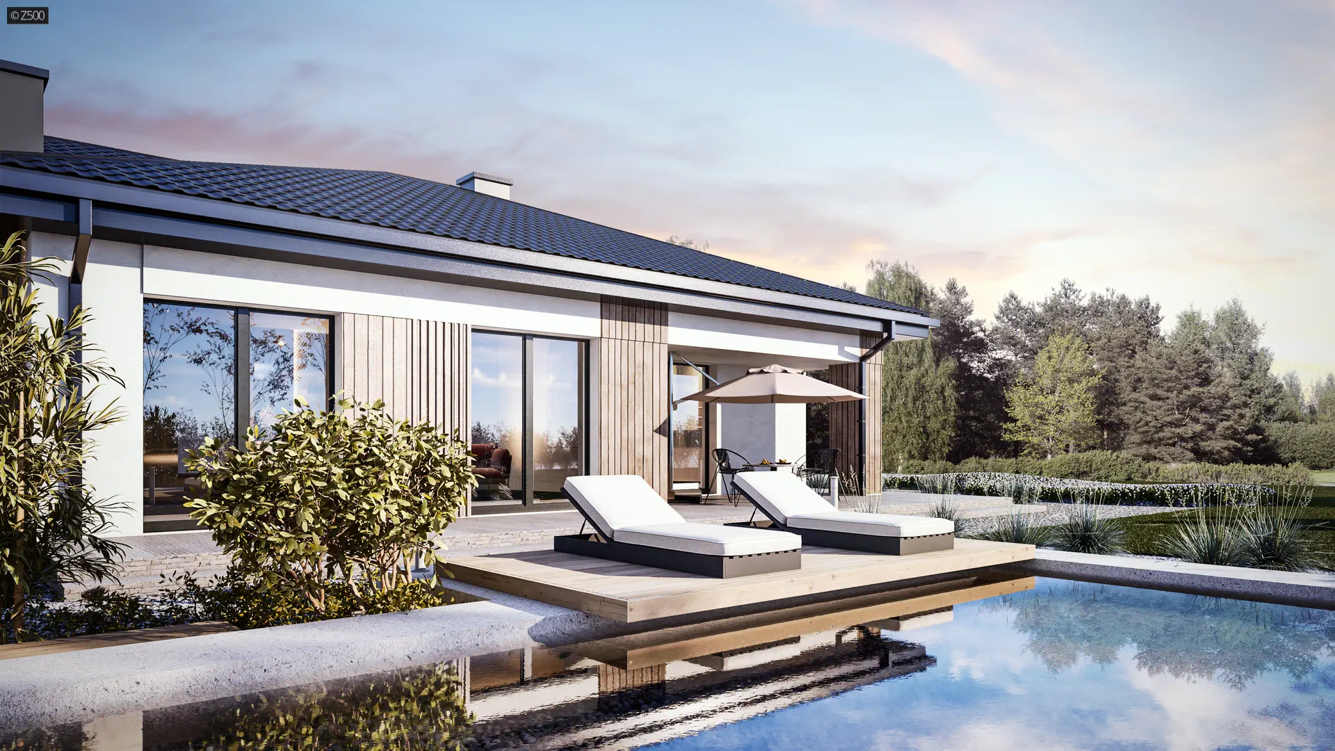 Projekt Z375 to parterowy budynek z jednostanowiskowym garażem i dachem wielospadowym. Posiada duże przeszklenia i zadaszenia nad częścią wejściową i tarasową.