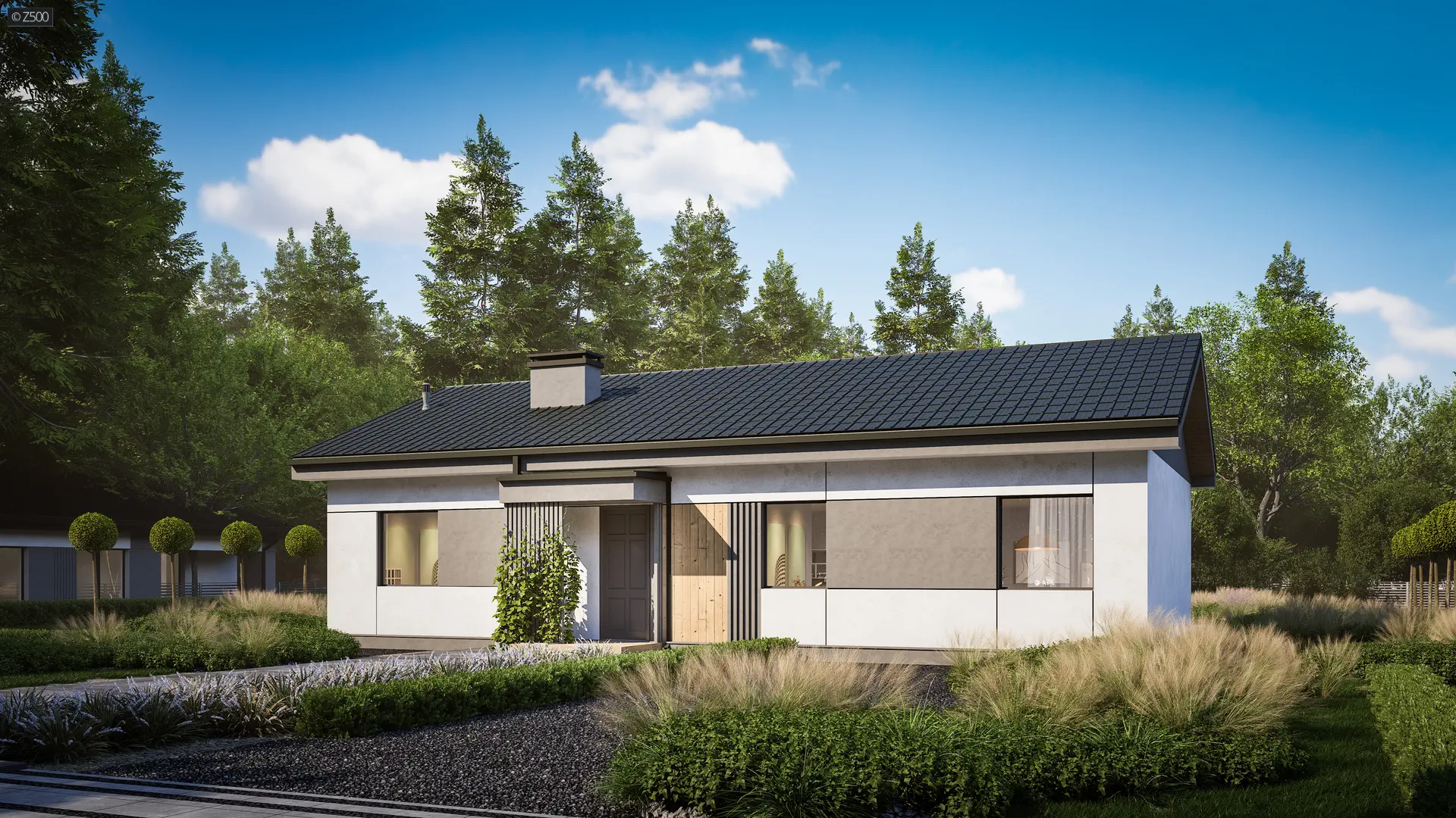 Parterowy dom z dachem dwuspadowym. Elewacje wykończone prostymi elementami w postaci lameli oraz okładzin drewnianych połączonych z elegancką bielą i szarością tynku.