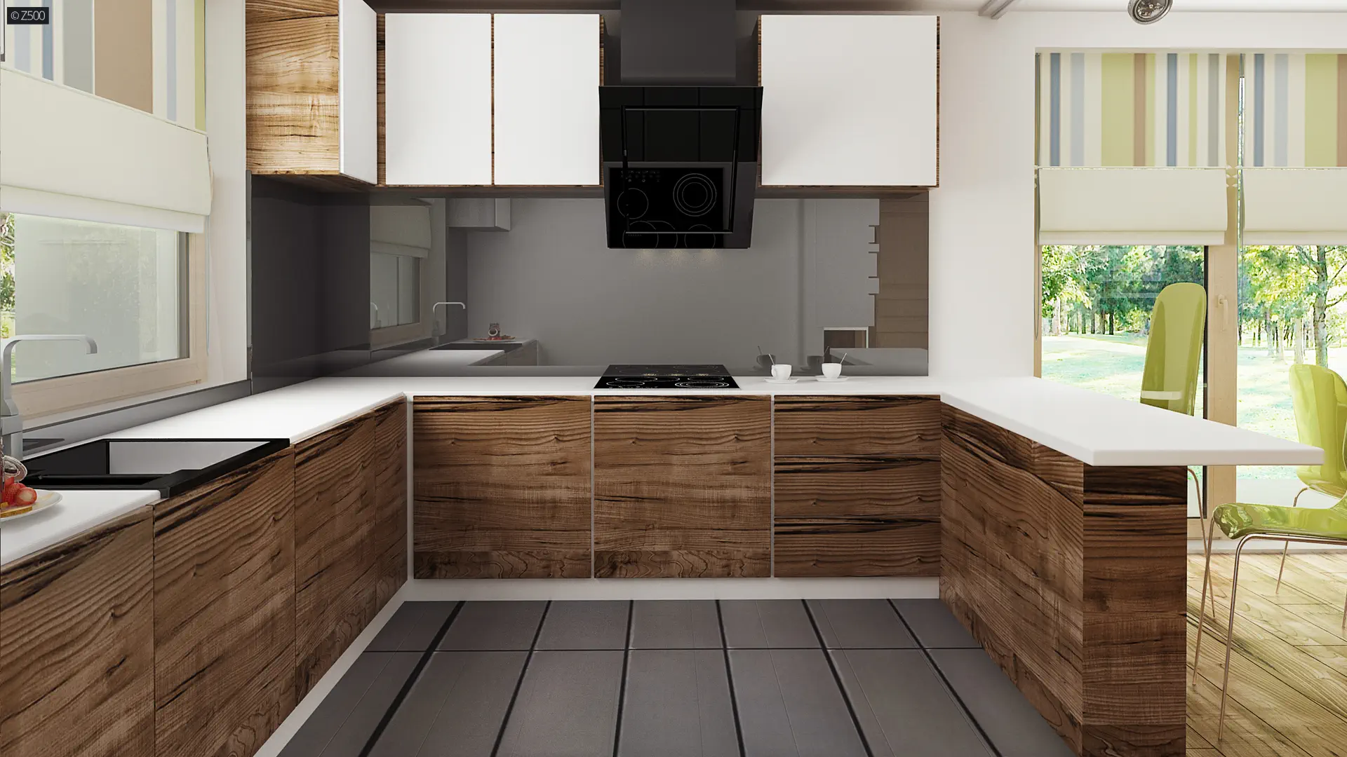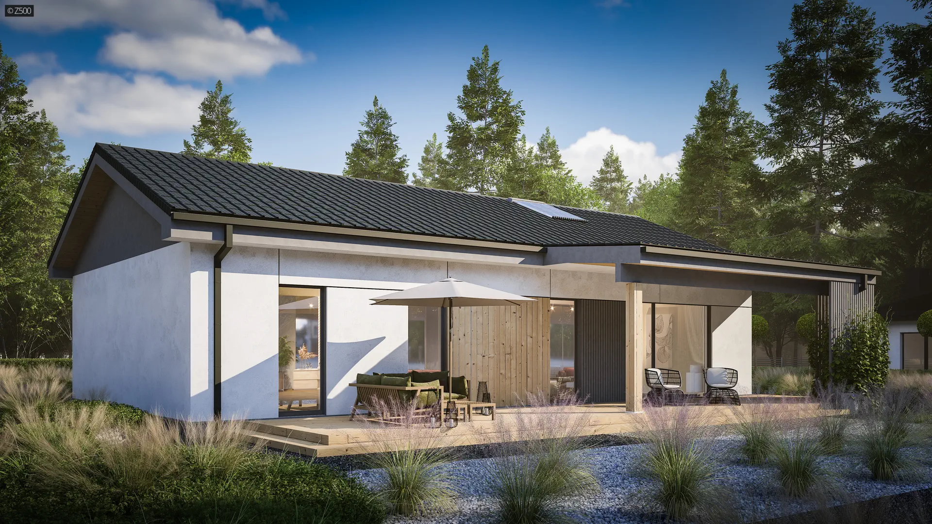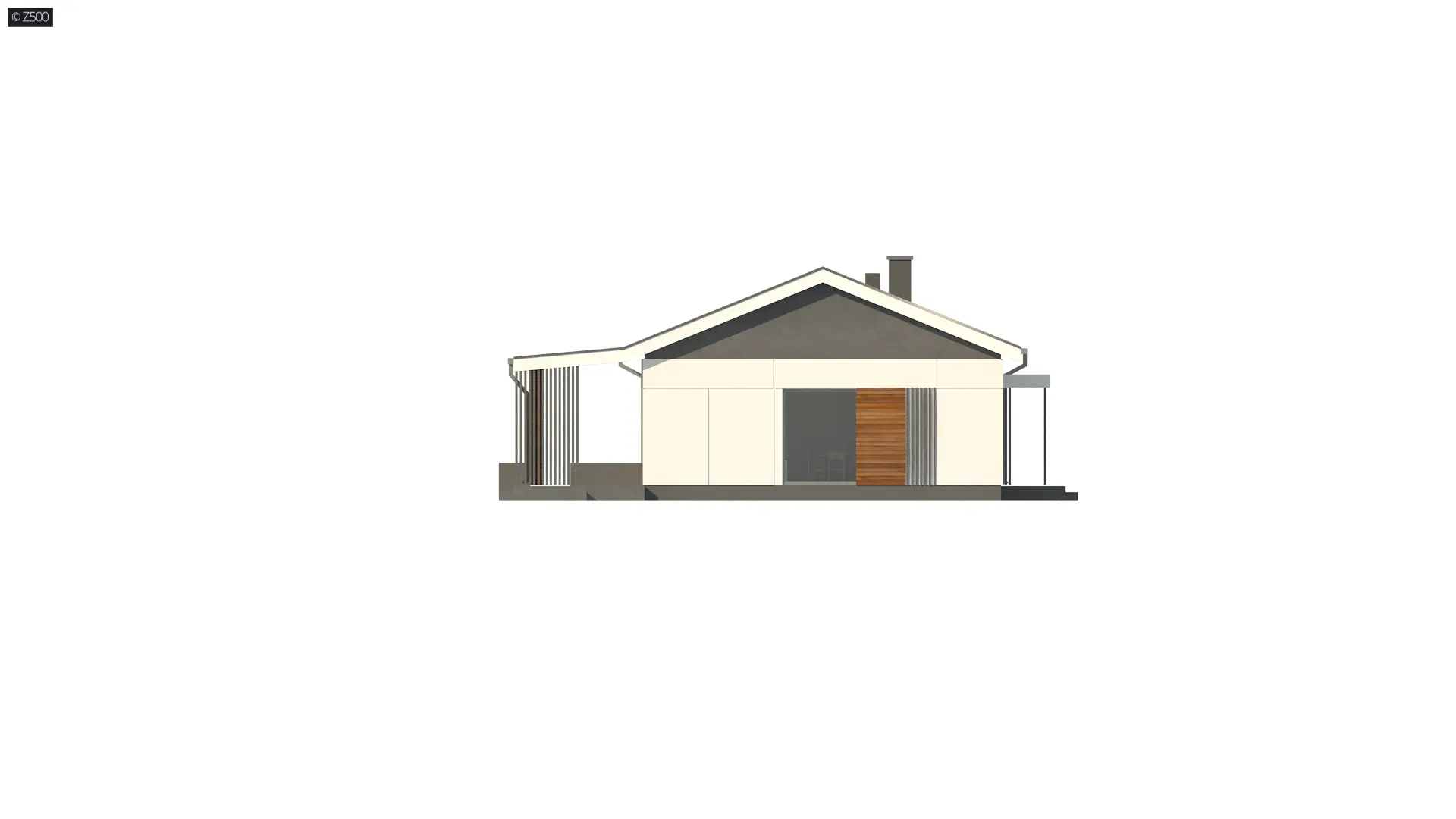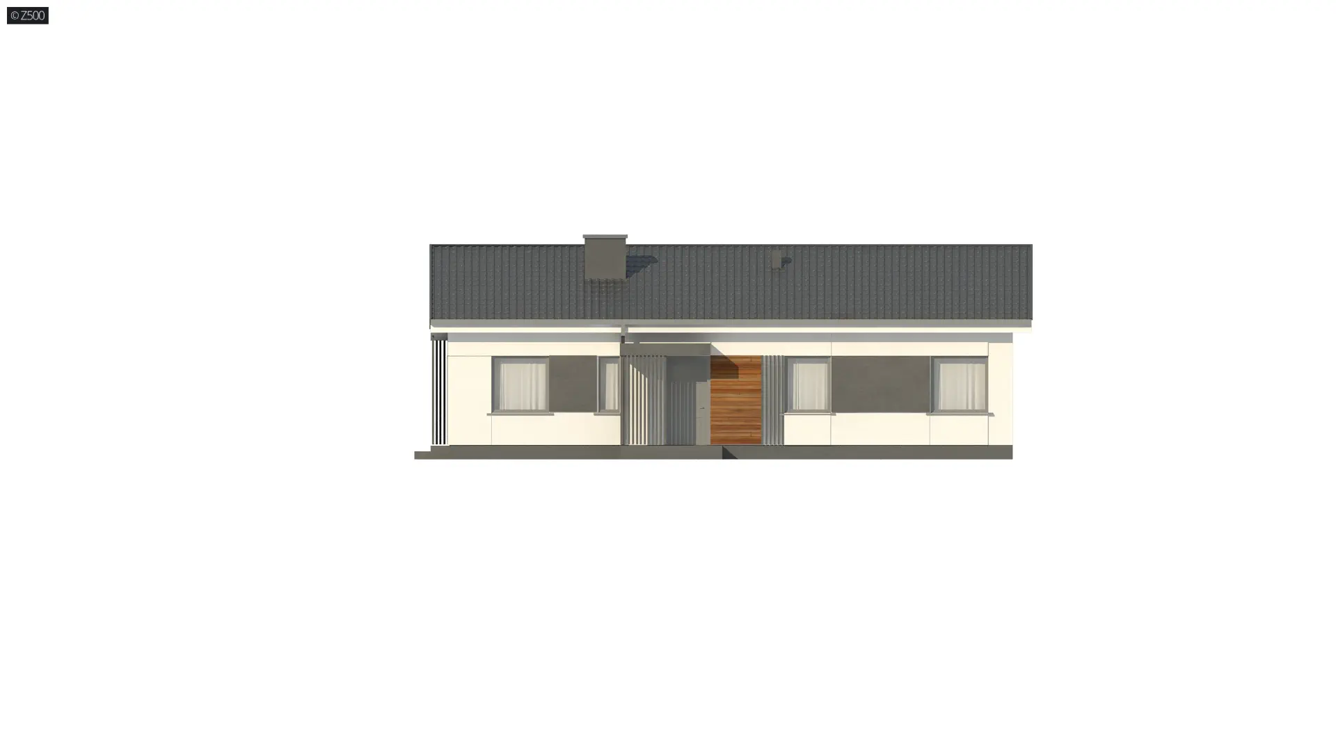Propozycja parterowego domu z dachem dwuspadowym od Z500. Elewację wykończono prostymi elementami w postaci żaluzji, drewnianych paneli połączonych z elegancką bielą i szarością tynku.